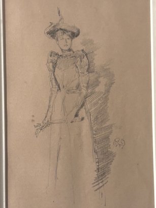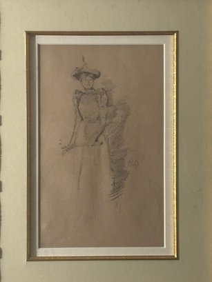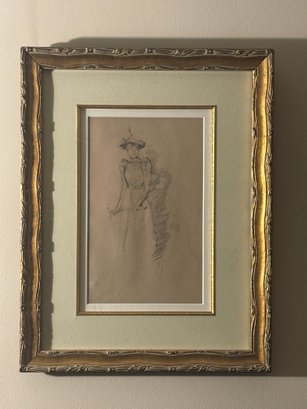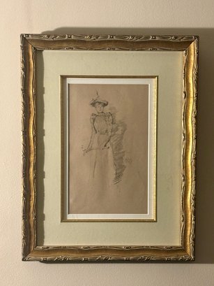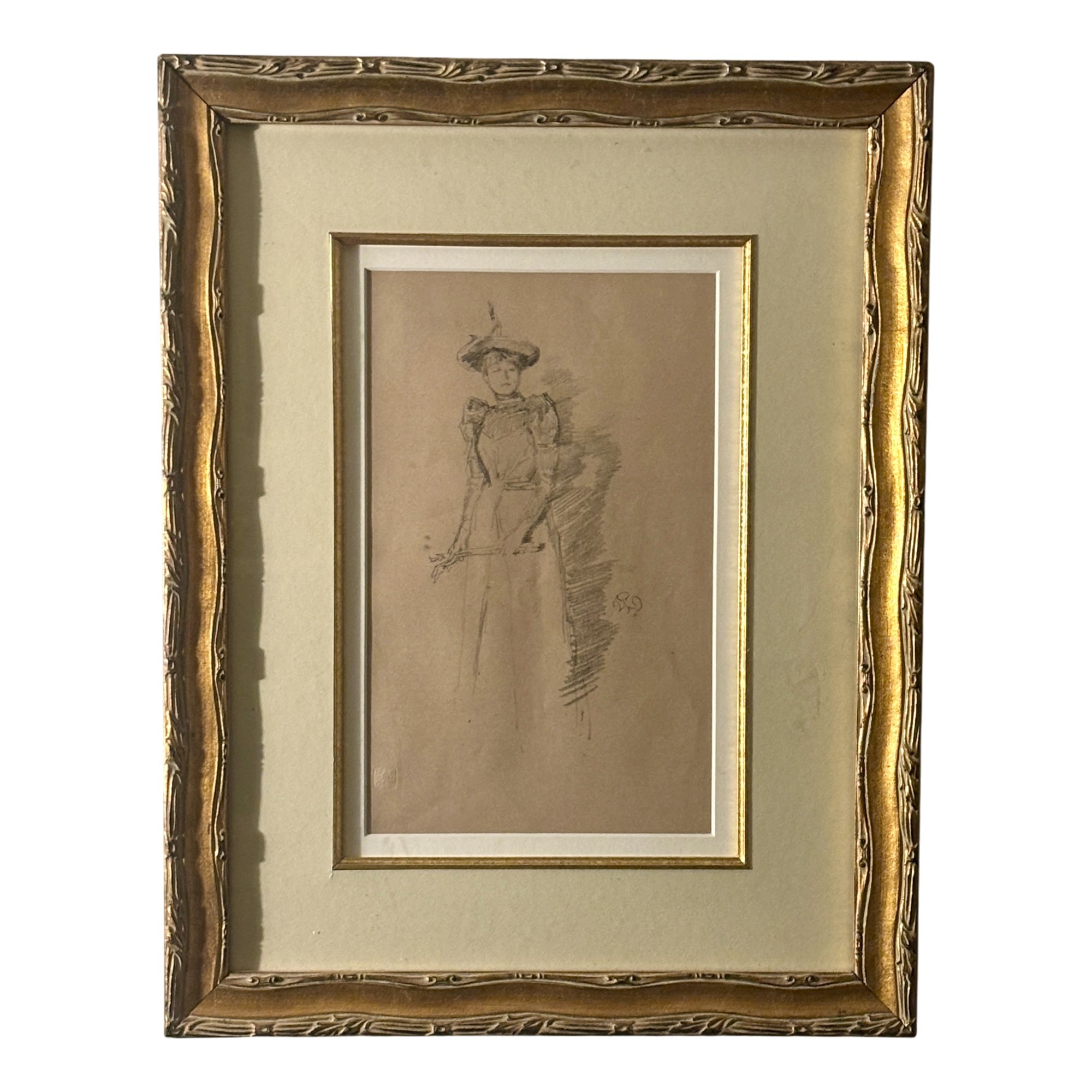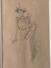 A beautifully restrained portrait sketch depicting a standing woman in period dress, rendered with confident, economical lines and delicate shading. The figure’s posture, costume detailing, and softly suggested background reflect the refined, atmospheric approach associated with late 19th-century tonal drawing.