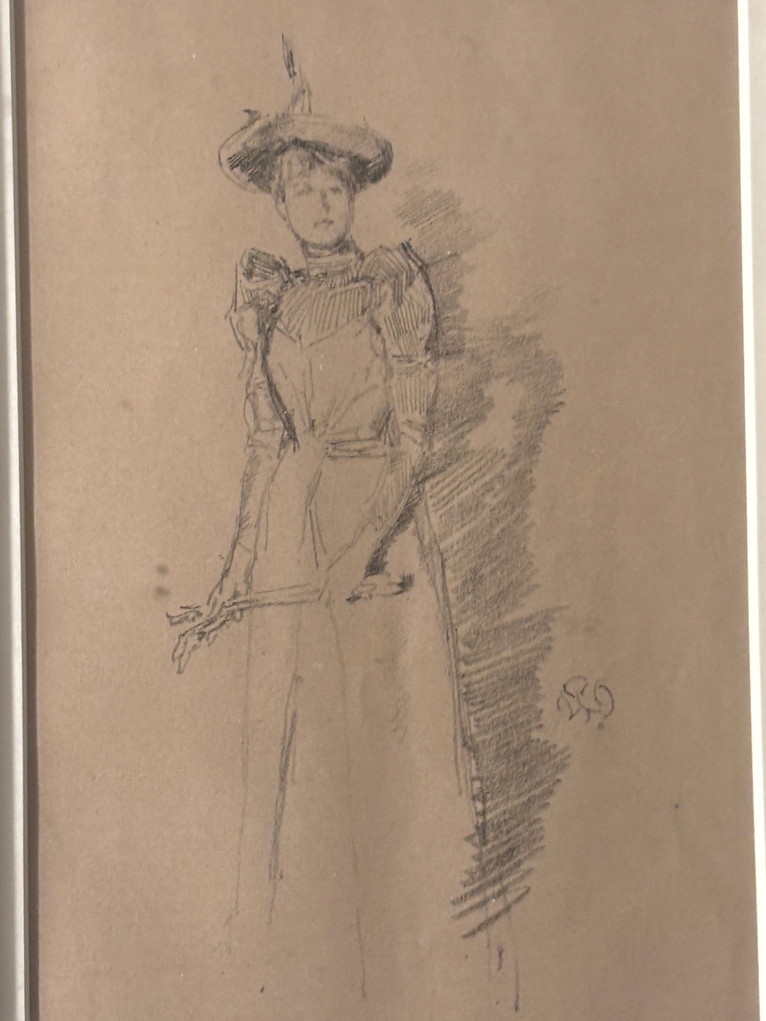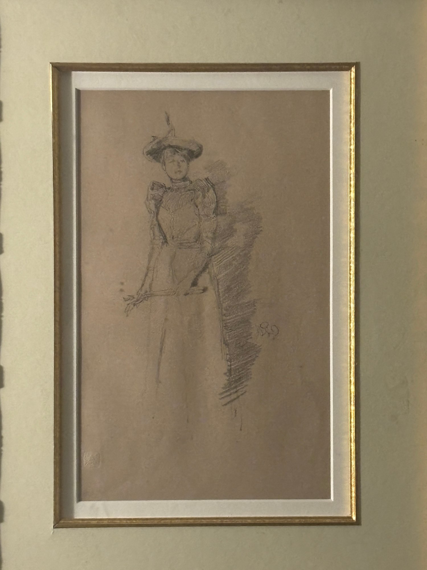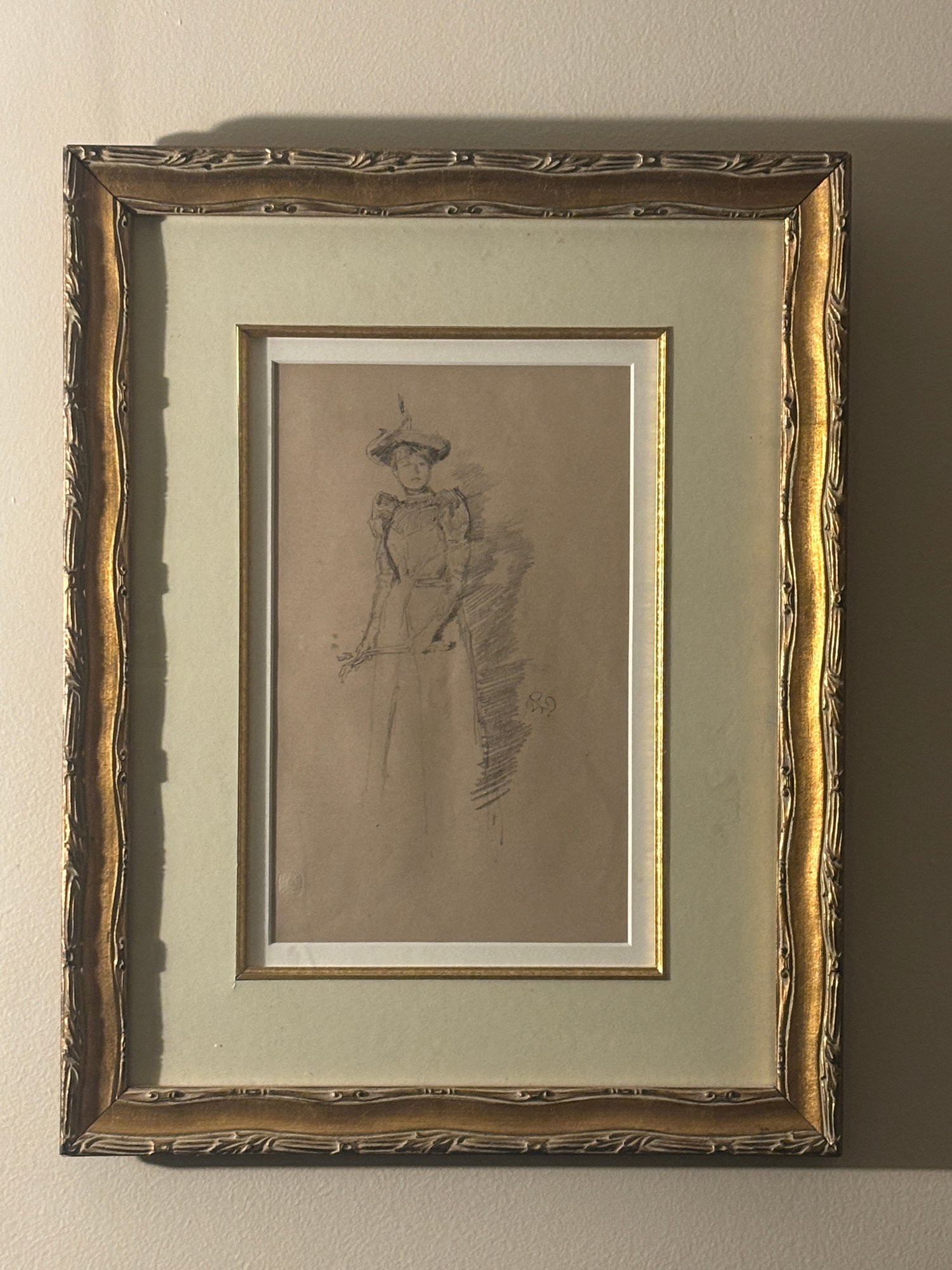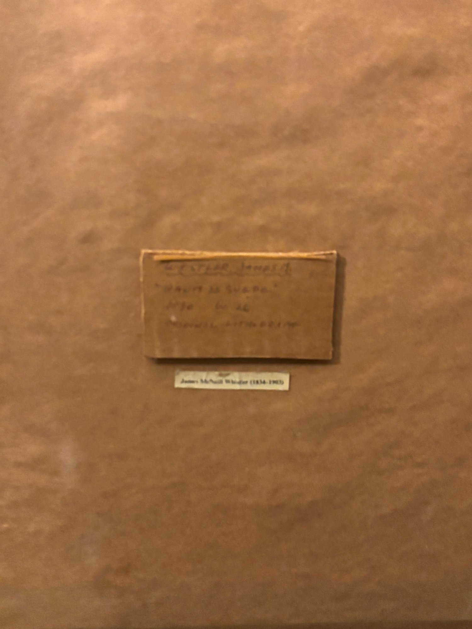 The work is attributed to James McNeill Whistler (1834–1903), with an identification label affixed to the verso, and an older handwritten note behind the frame. Whistler is widely regarded as one of the most influential figures in American and European art, celebrated for his subtle harmonies, elegant portraiture, and mastery of line.