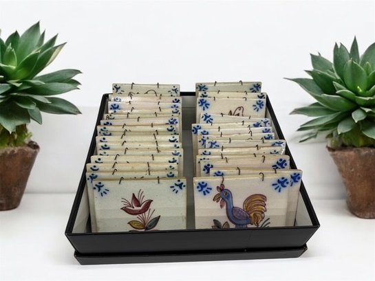 29 hand painted tiles made by the Fabrica Santana Company is Lisbon, Portugal. The tiles are approximately 5 5/8". There are 2 animal pictures, 4 bird pictures, and the rest are various flower pictures. Each tile is individually painted, and therefore unique. 29 tiles all together.