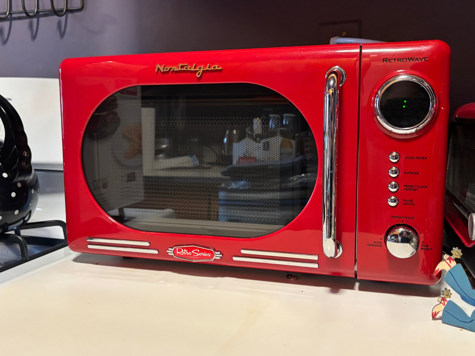A perfect blend of retro charm and modern convenience, this Nostalgia RetroWave Microwave features a bold red finish, chrome accents, and a vintage-inspired design that brings diner flair to any kitchen. Despite its classic look, it offers full modern functionality—digital controls, multiple power levels, express cooking, and a rotating glass turntable. Ideal for quick meals, reheats, and popcorn nights with style to spare.