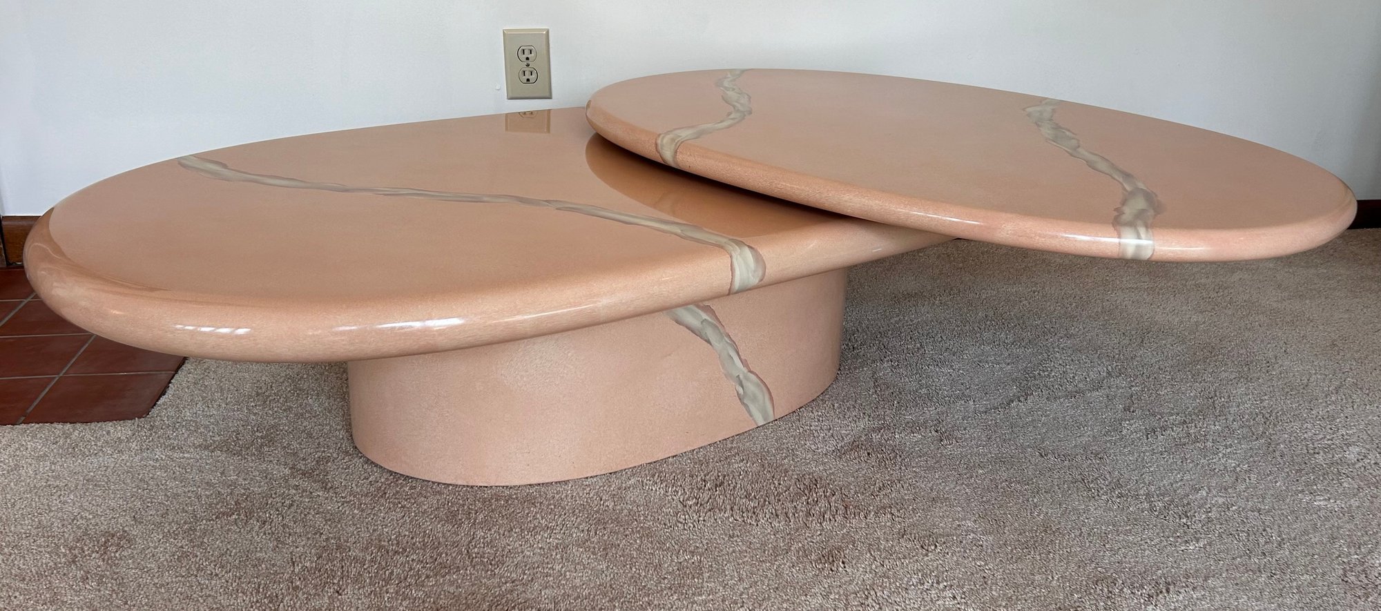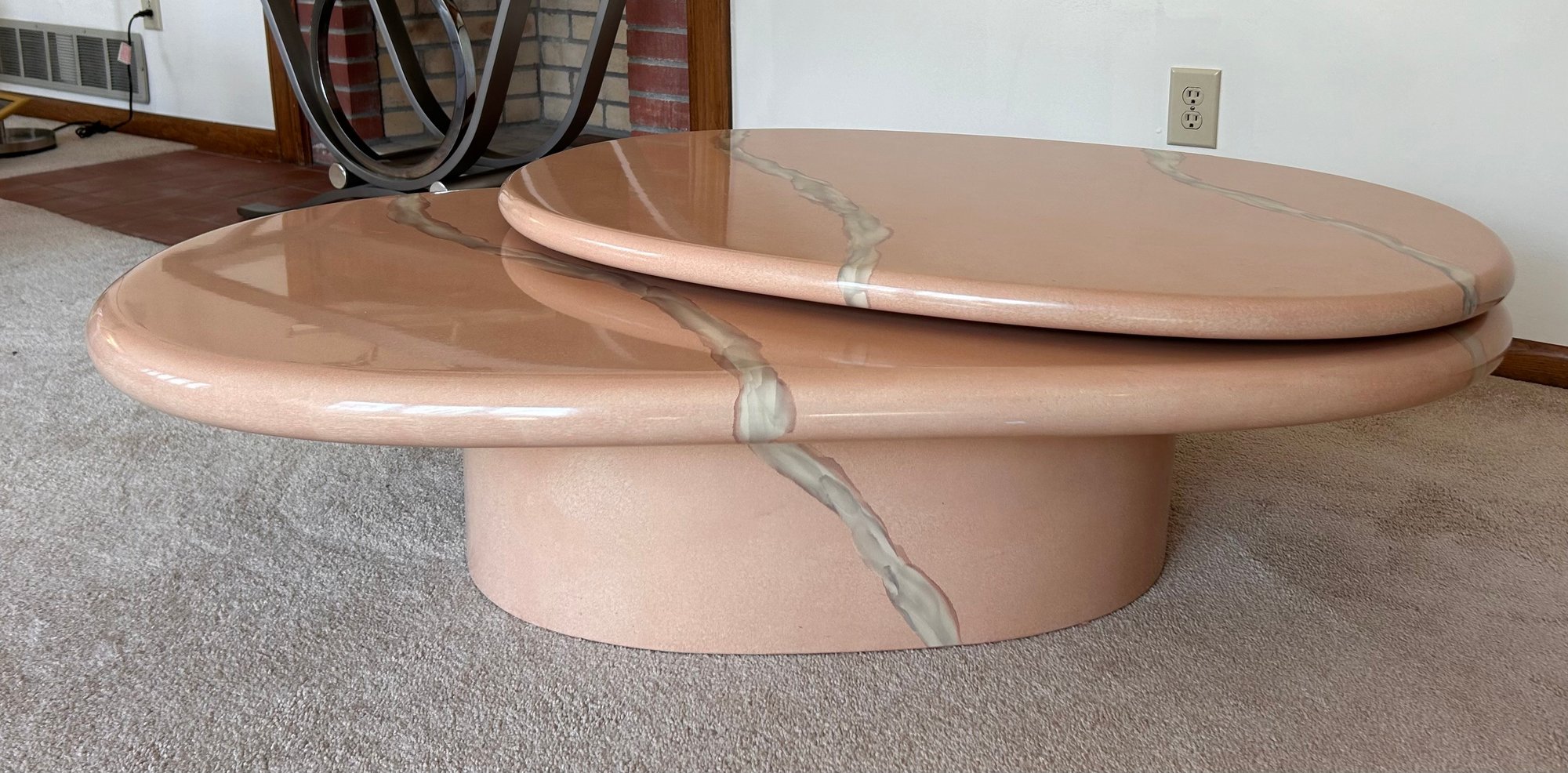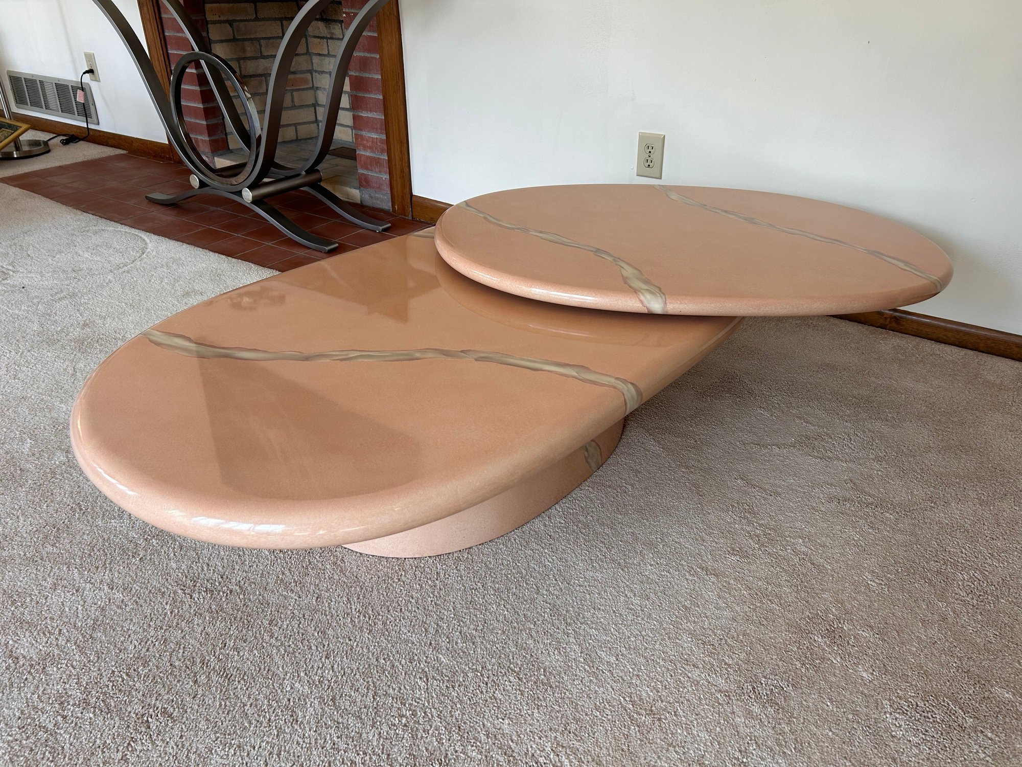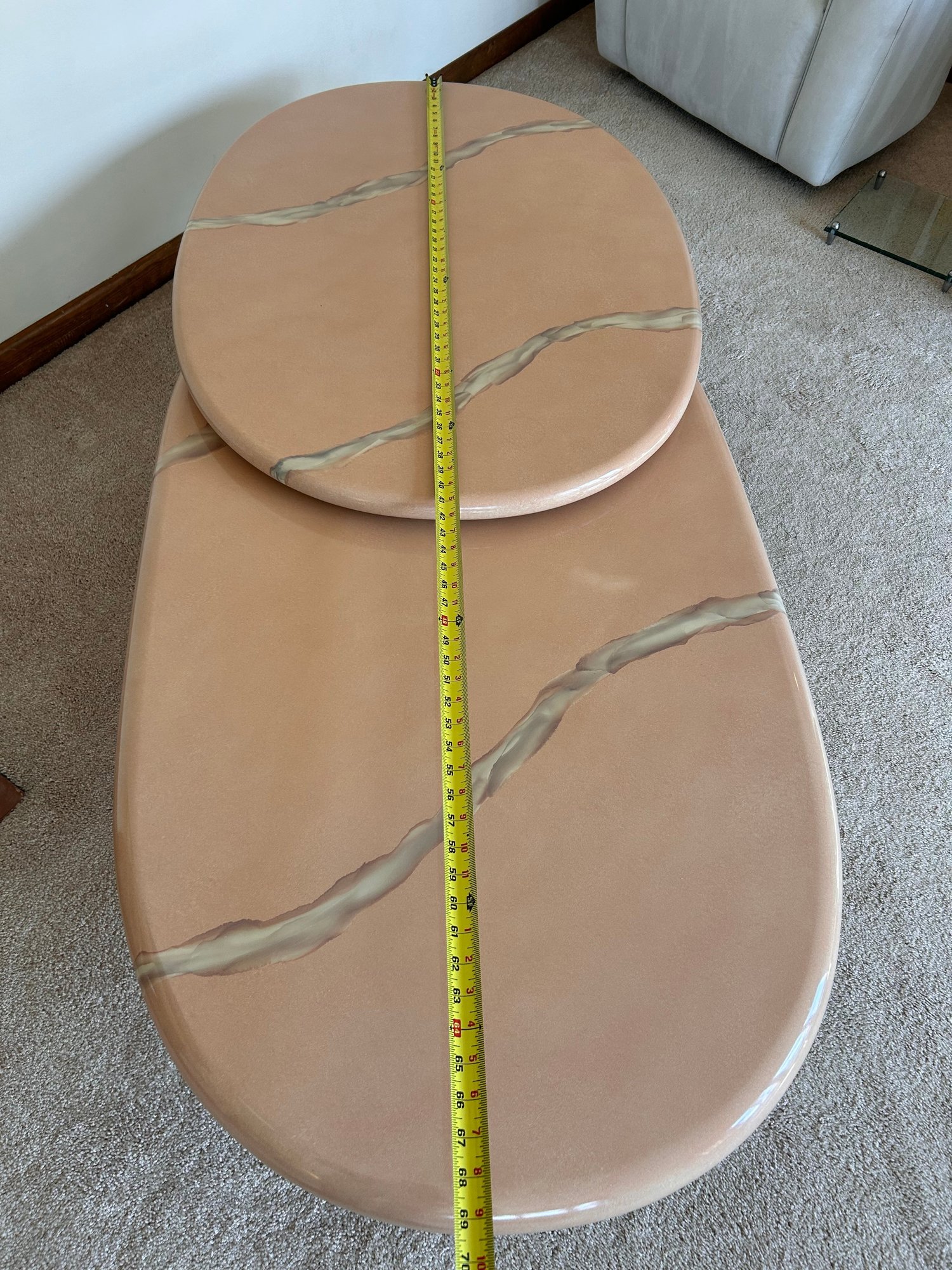 Finish design with hand written signature by Kelly G as shown in photos. This is a faux marble with a light pink tone. The top section has the ability to swivel 360 degrees as shown in photos. It measures approximately 15” tall, 30” deep with a total length of 69” when swiveled out fully or 54” when swiveled inward.