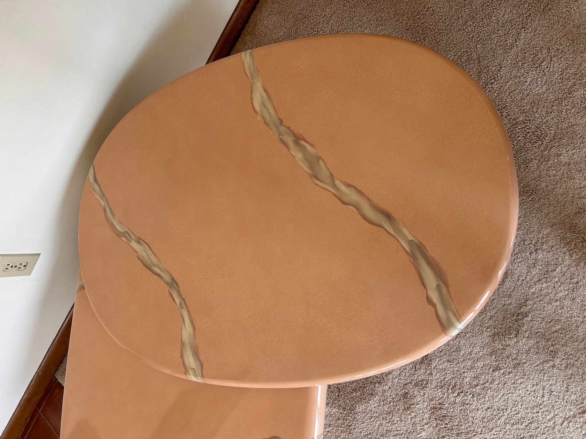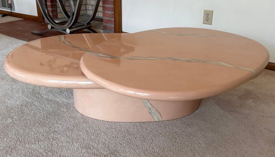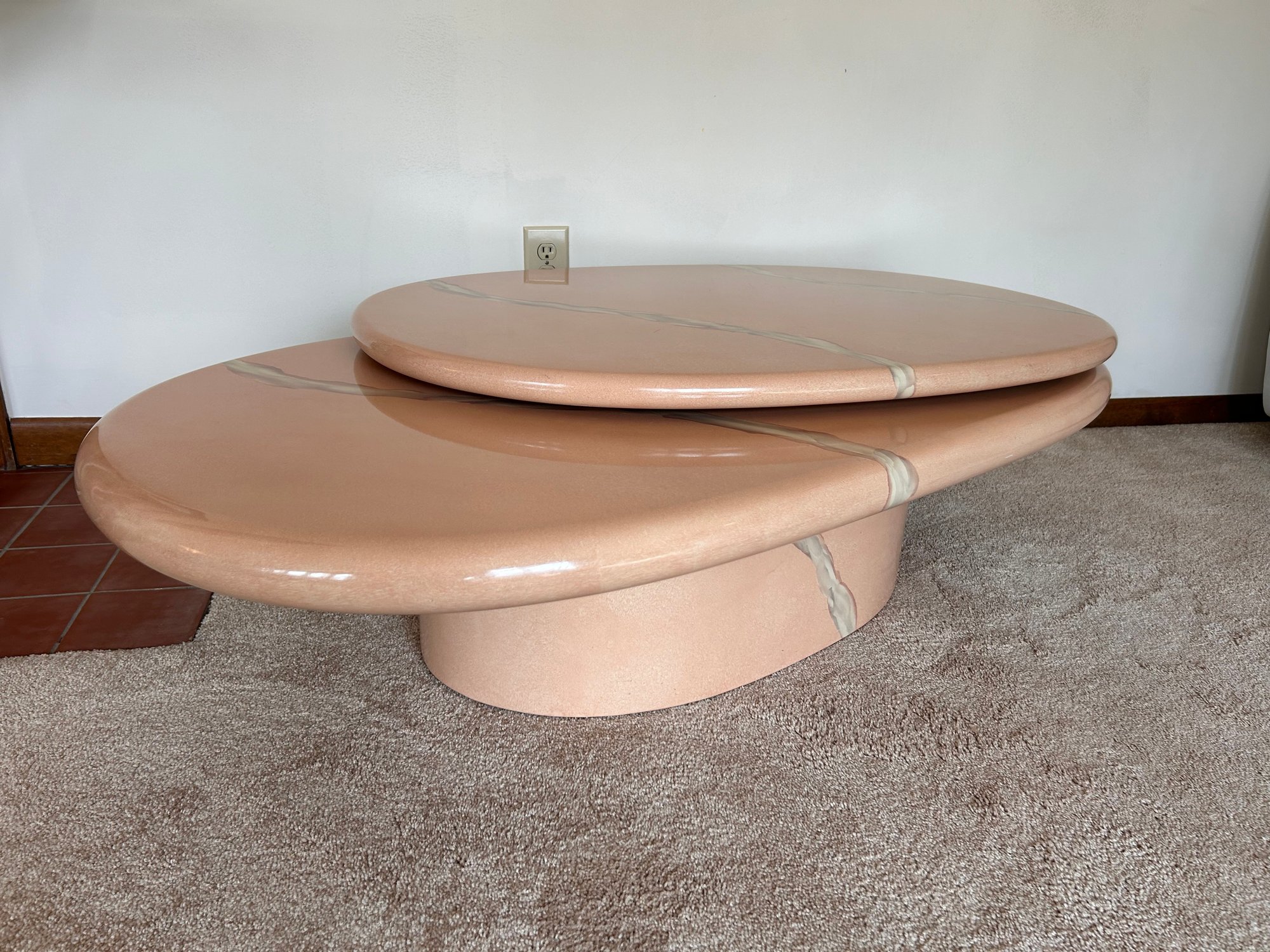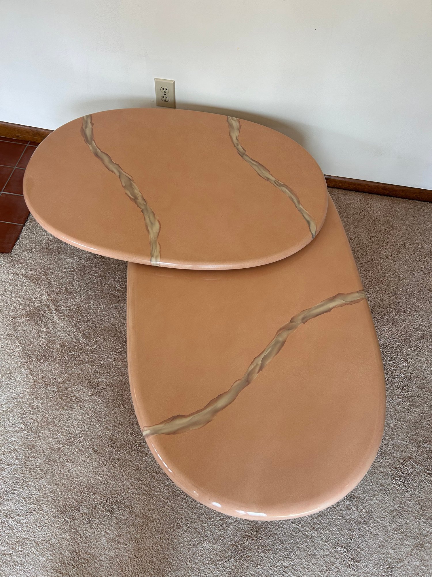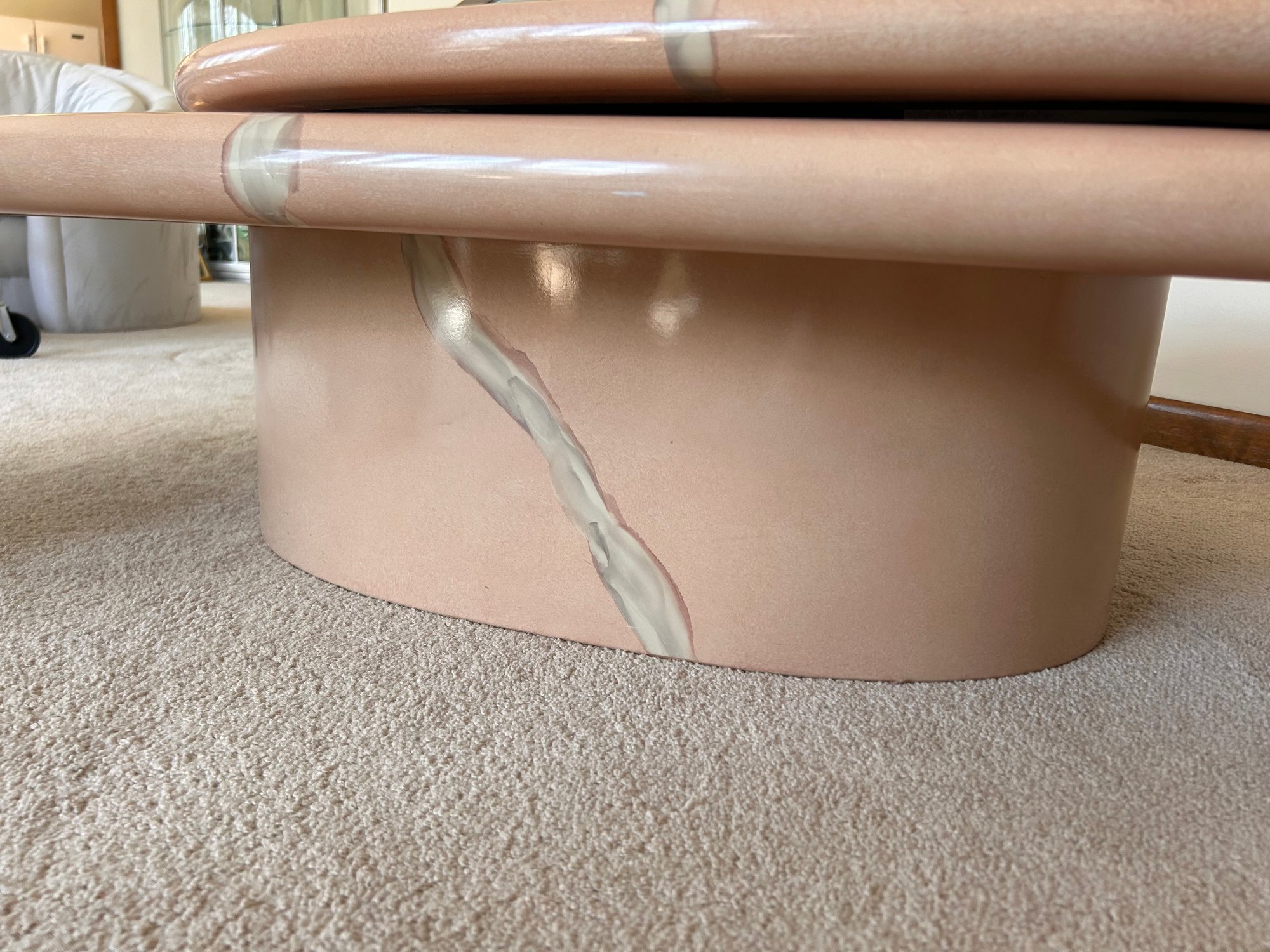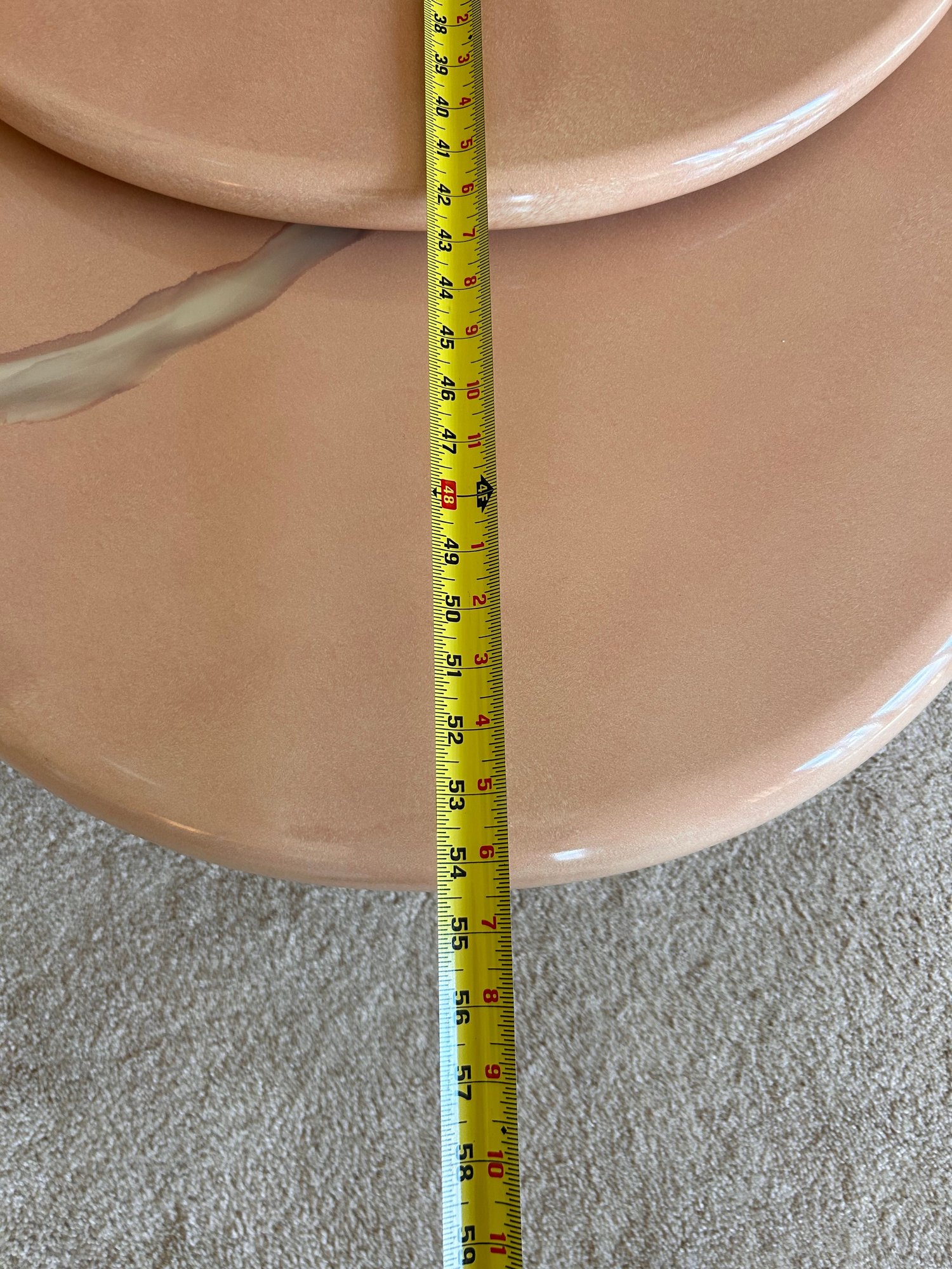 Finish design with hand written signature by Kelly G as shown in photos. This is a faux marble with a light pink tone. The top section has the ability to swivel 360 degrees as shown in photos. It measures approximately 15” tall, 30” deep with a total length of 69” when swiveled out fully or 54” when swiveled inward.