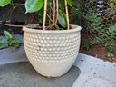 Live potted plant in textured cream colored ceramic planter.