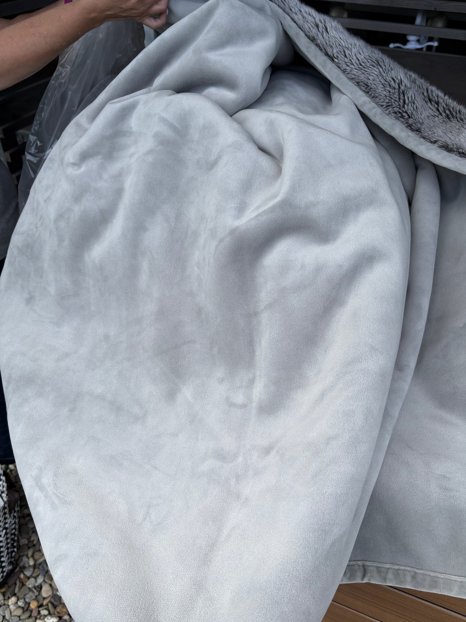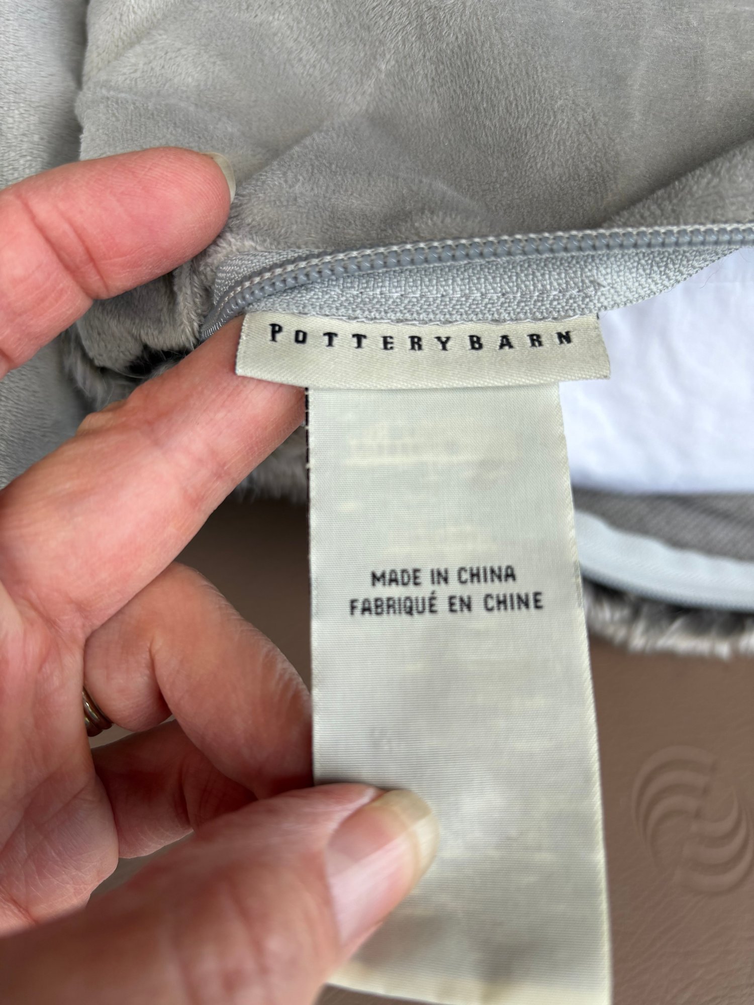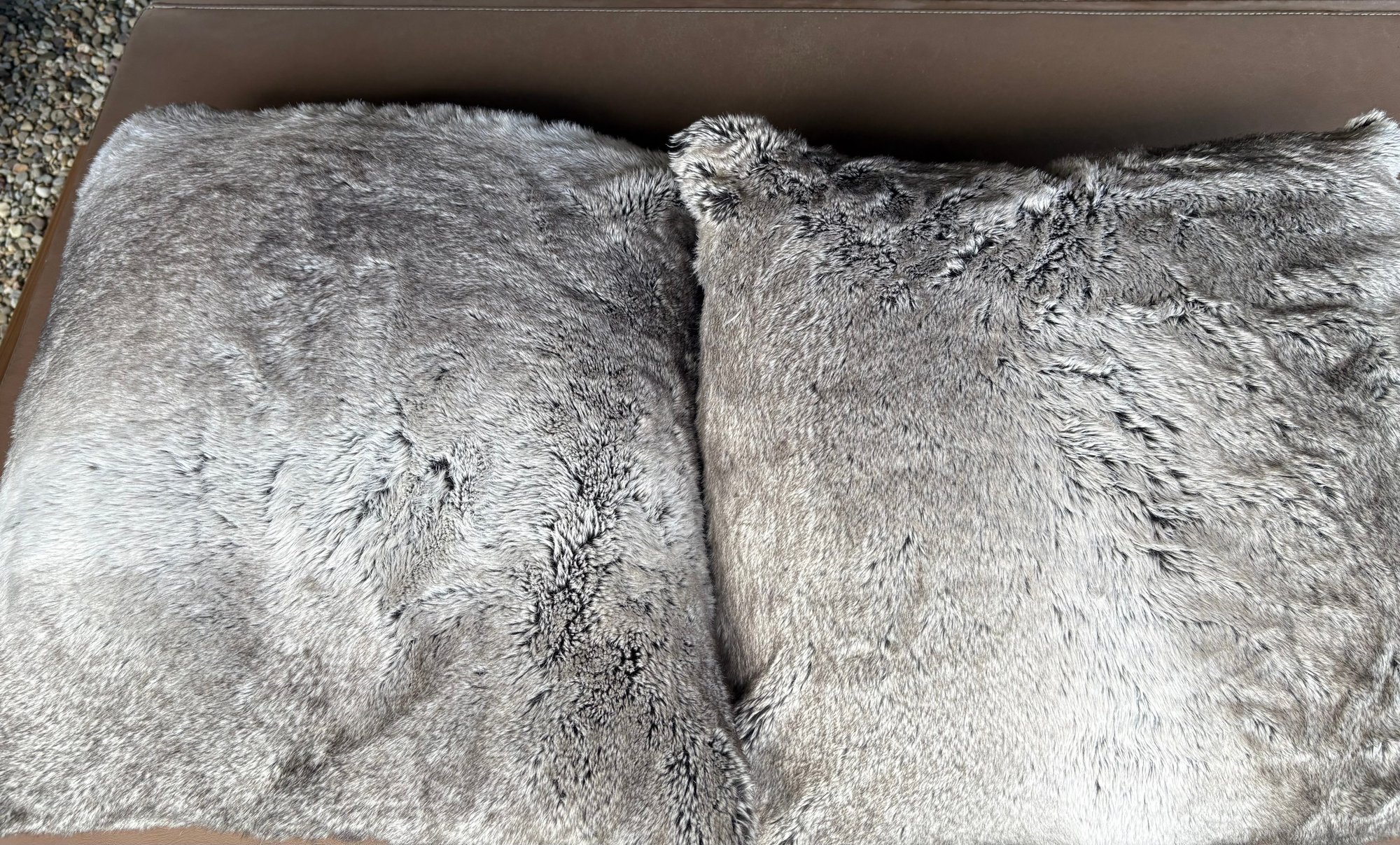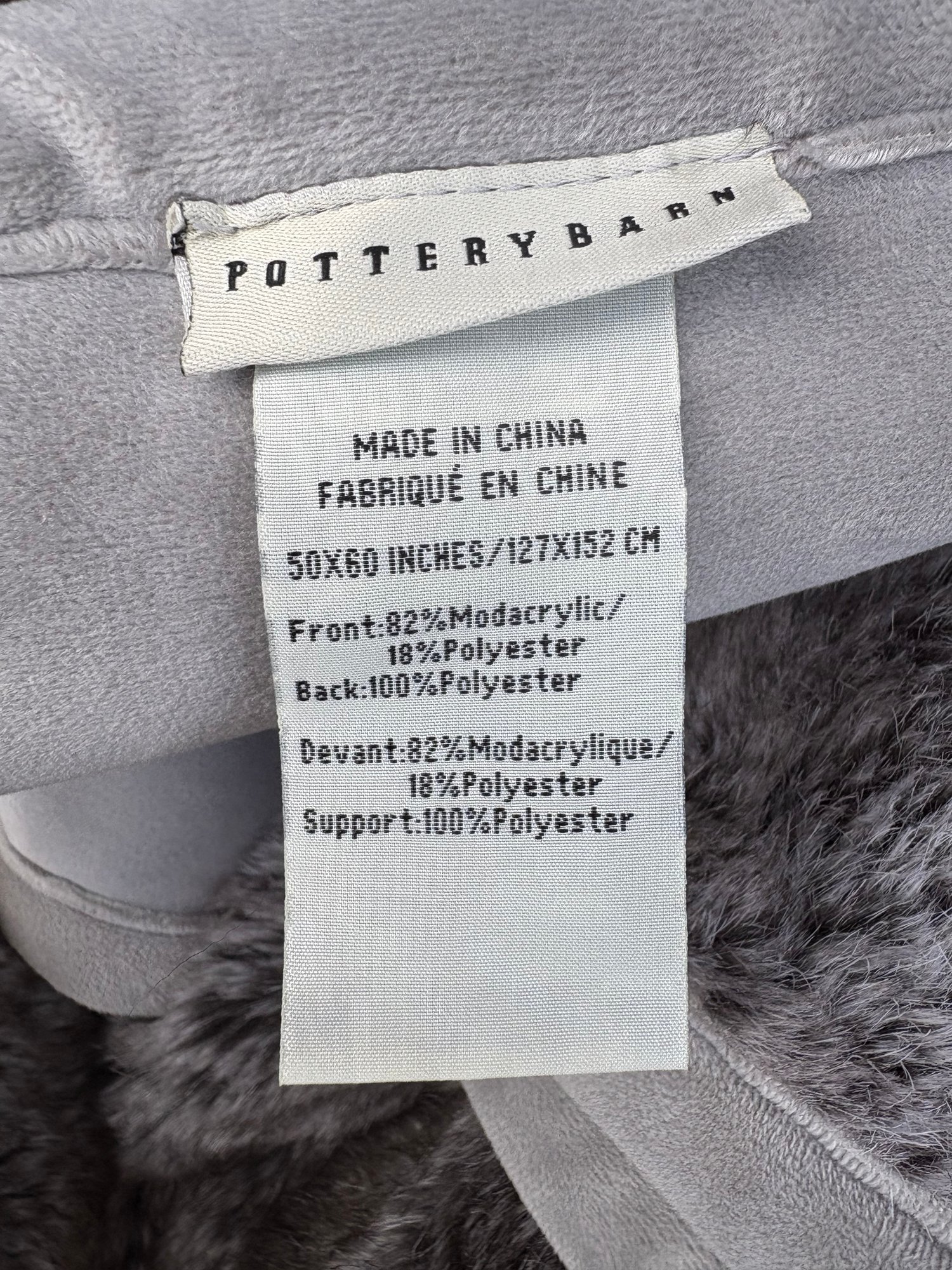 Pottery Barn grey faux fur throw blanket and two (2) faux fur pillows with zipper closure and down inserts.