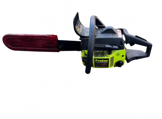 In good, pre-owned condition with wear expected. Protective chain cover shows some damage, but remains functional.