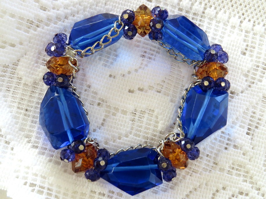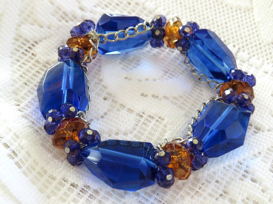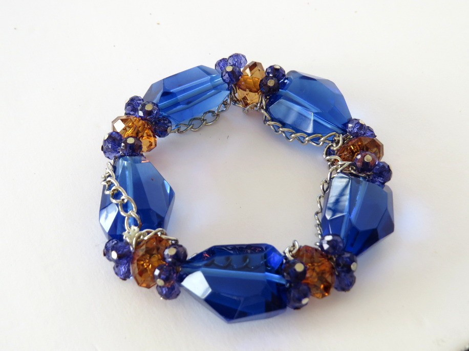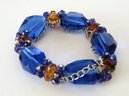 This bracelet is a show stopper! Crafted with 1" long cobalt faceted glass pieces separated by purple and amber colored beads wrapped in a silver metal chain design. This is a stretch bracelet with a 2 1/4" interior diameter before stretching.