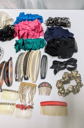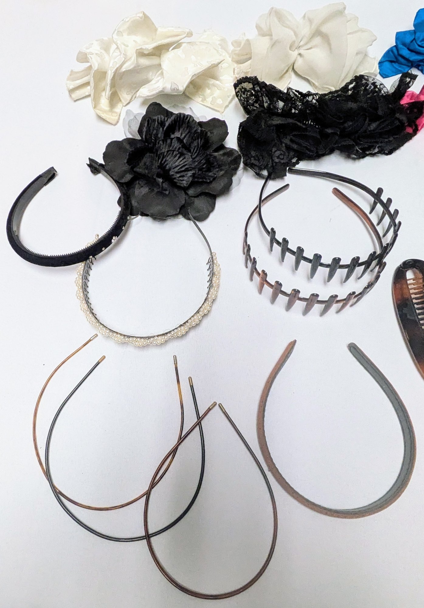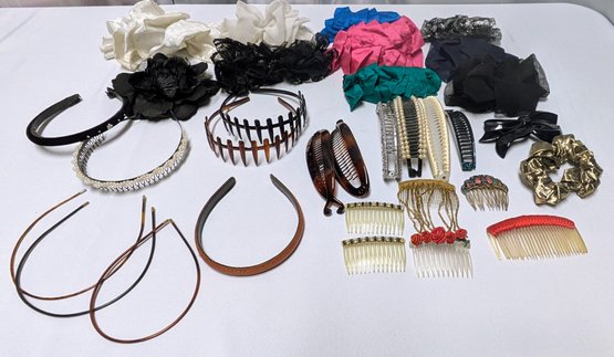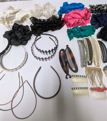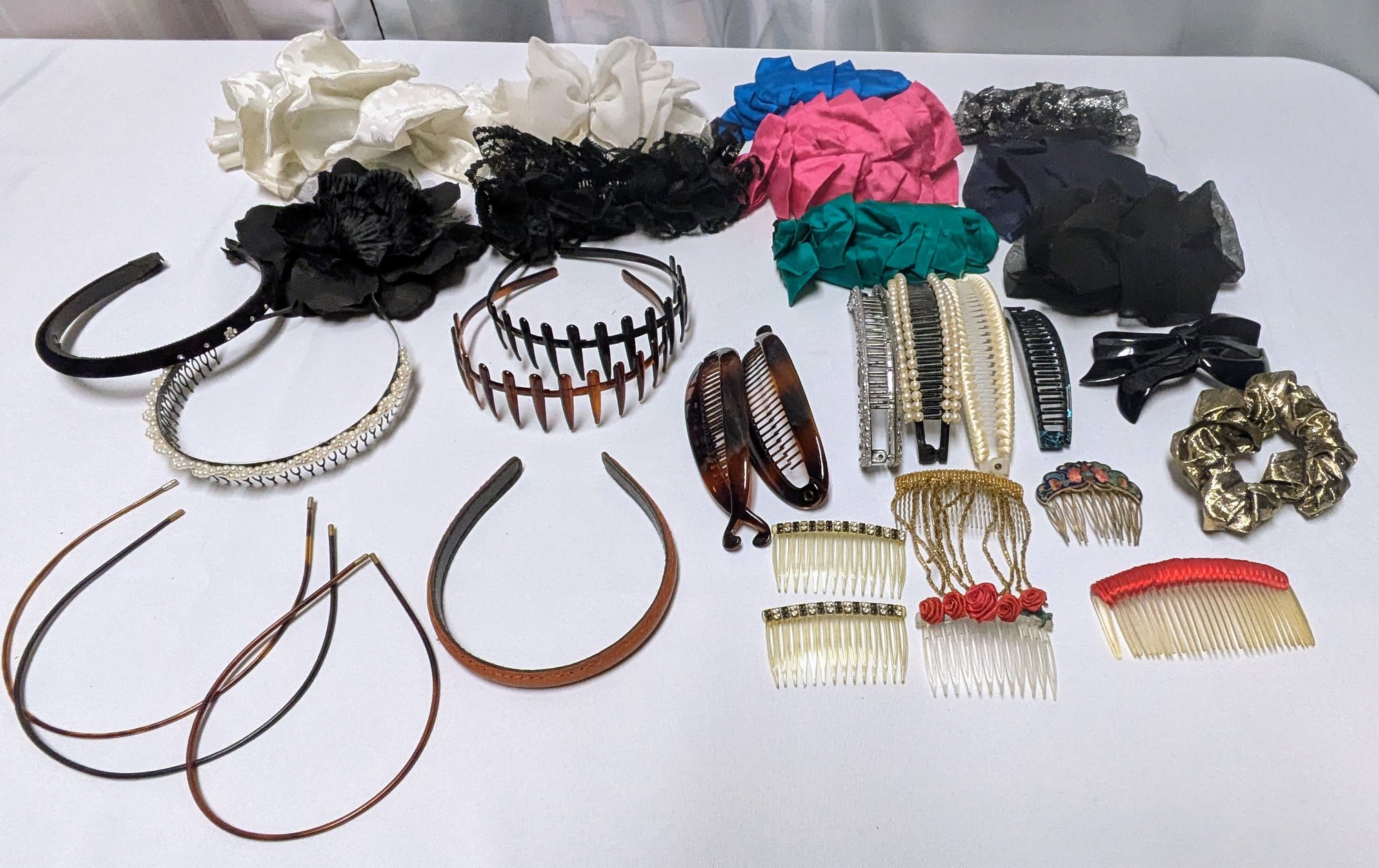 Come with everything shown in the photos. Head bands, hair combs, fabric-covered barrettes, and more. Excellent to Very Good Condition. Please see all photos as part of the description and condition.