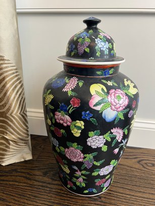 Oversize Chinese porcelain ginger jar in black with a pastel floral design.