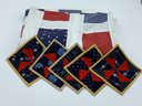 Fun red, white and blue patchwork table cloth or bed cover in great condition, machine stitched. Lot also includes 5 handmade quilted coasters in complementary colors. No stains found and all stitching in good condition.