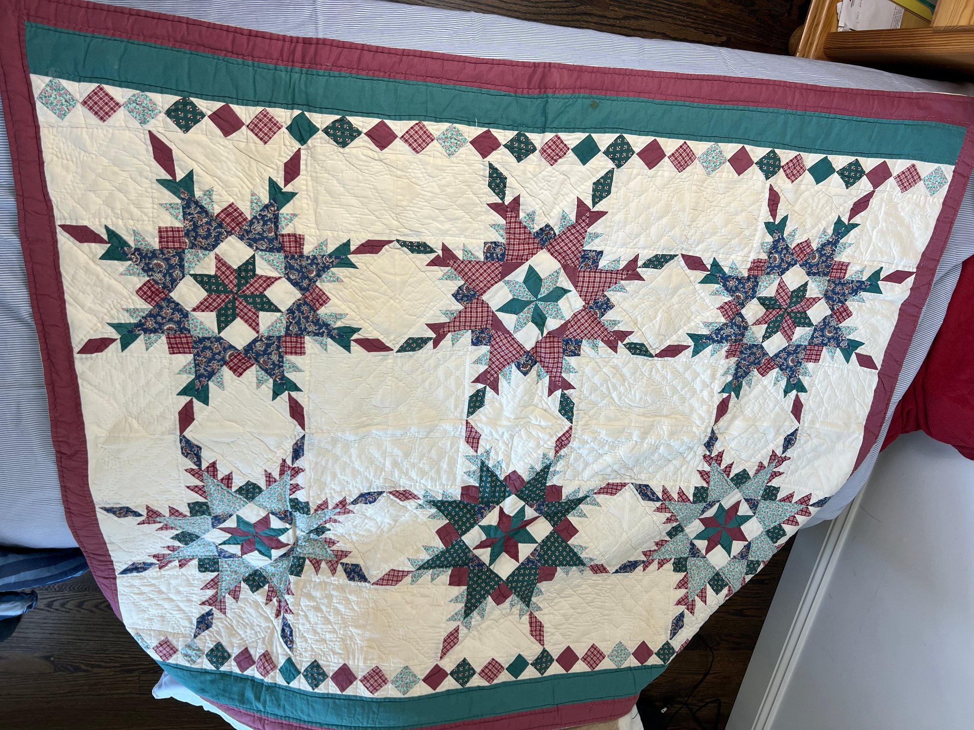 Country chic quilted throw blanket with a starburst pattern in soft green and red against a cream background.
