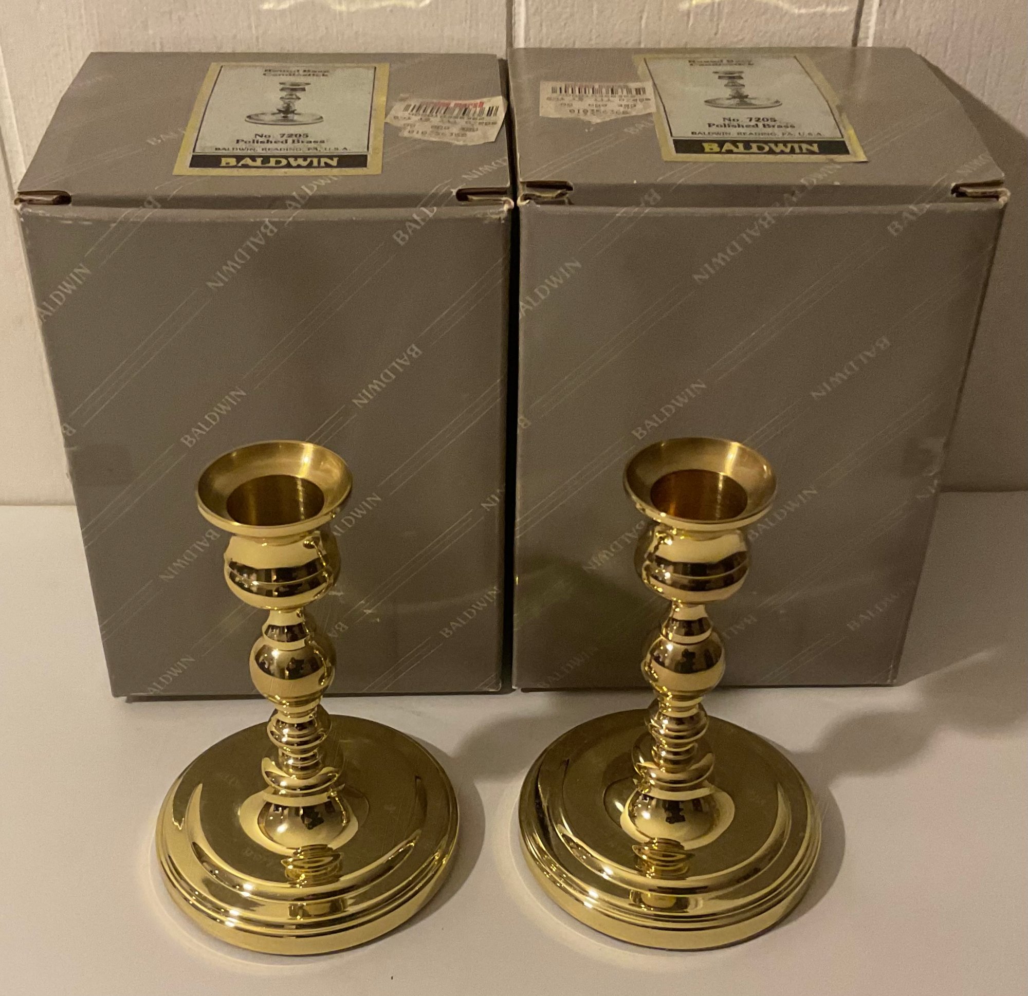 Pair of Baldwin Brass Polished Candlesticks, Vintage But Brand New in Boxes.