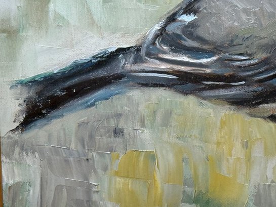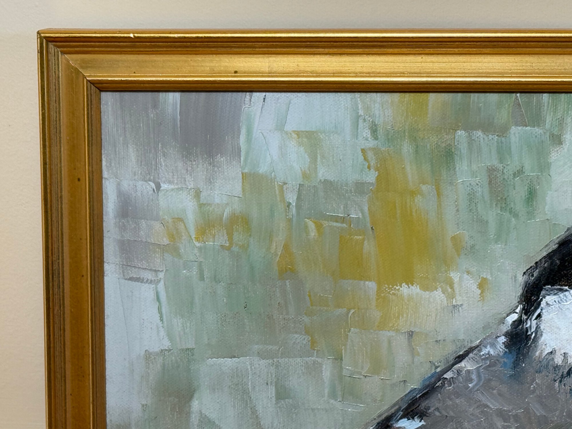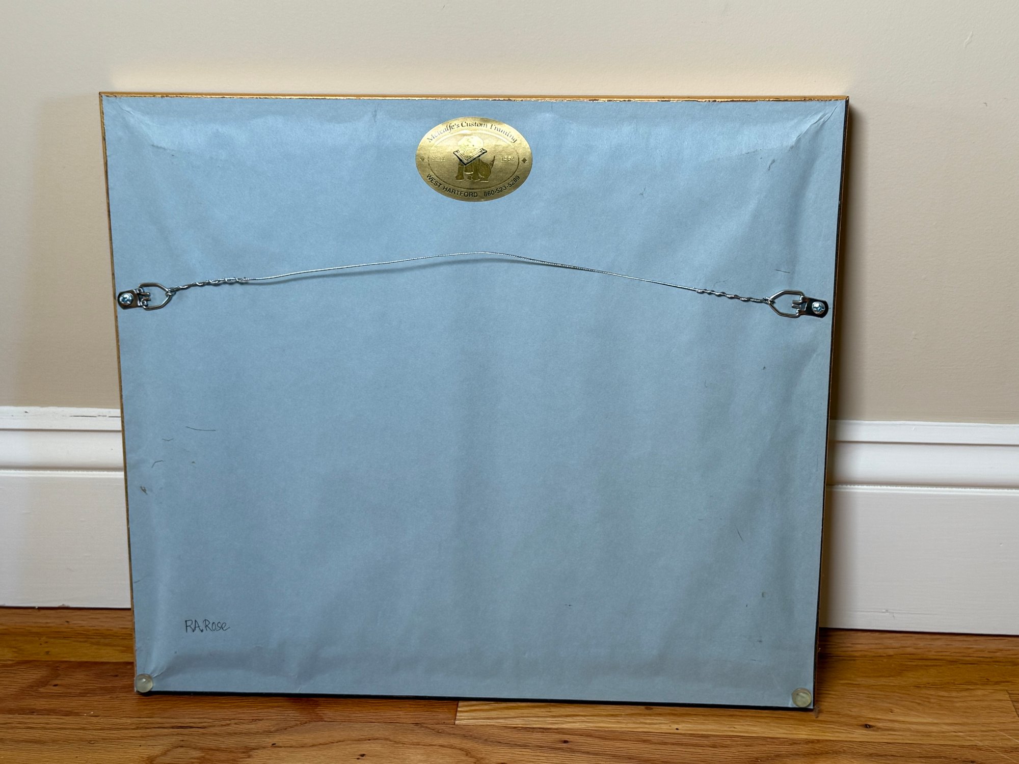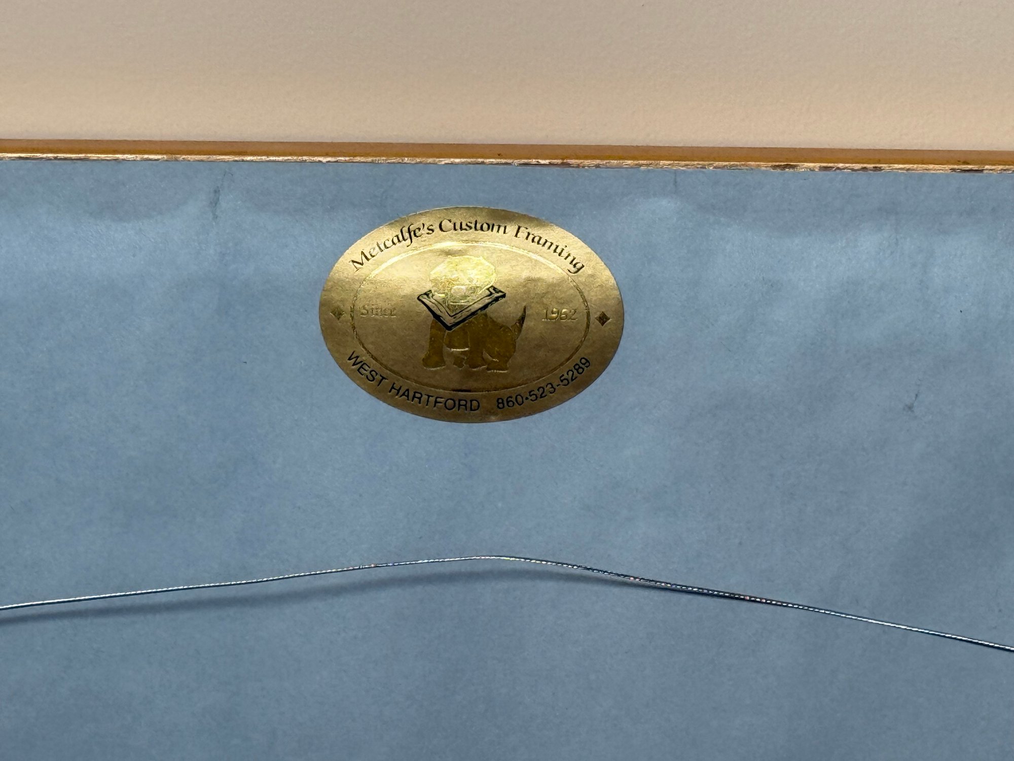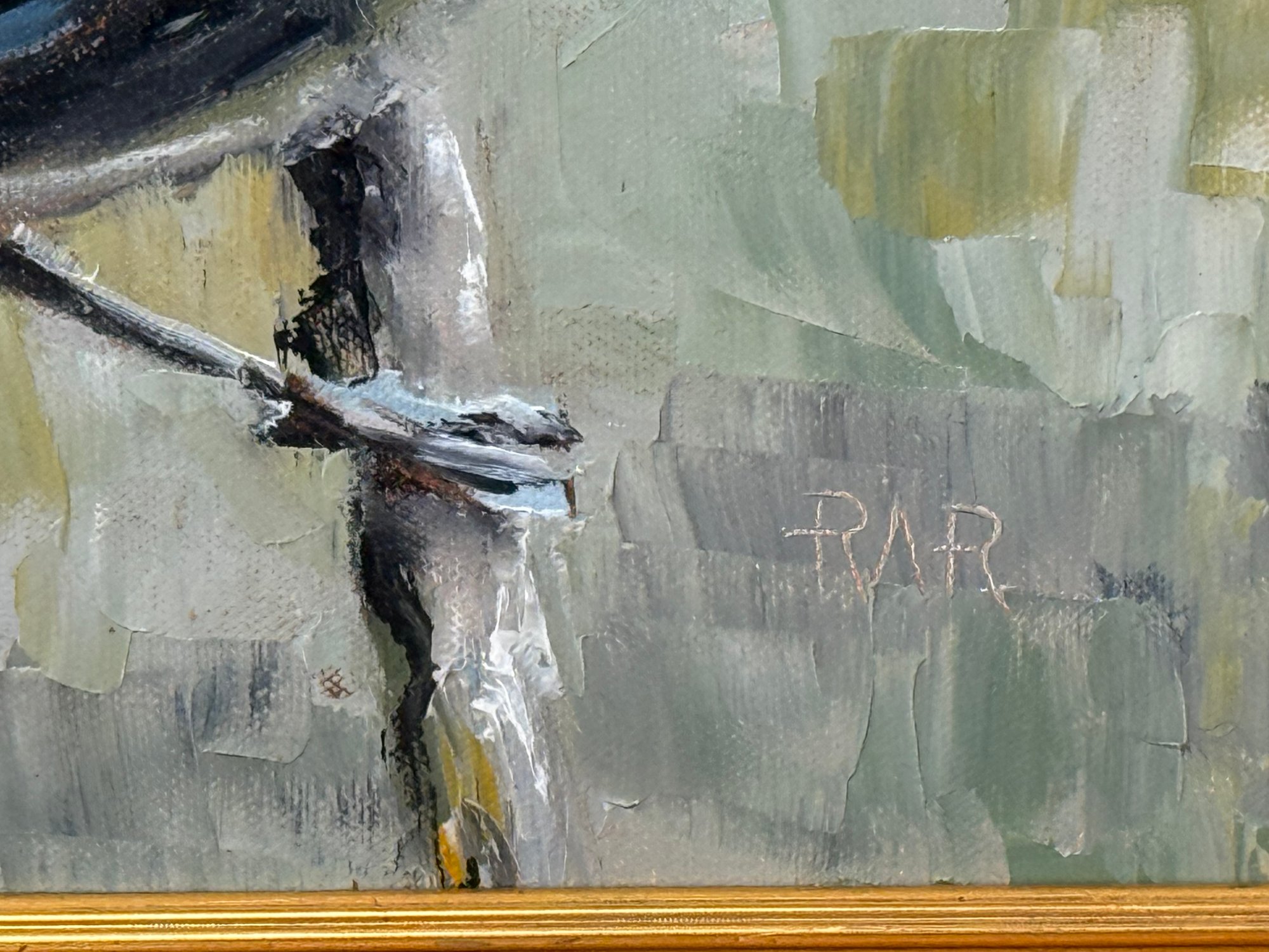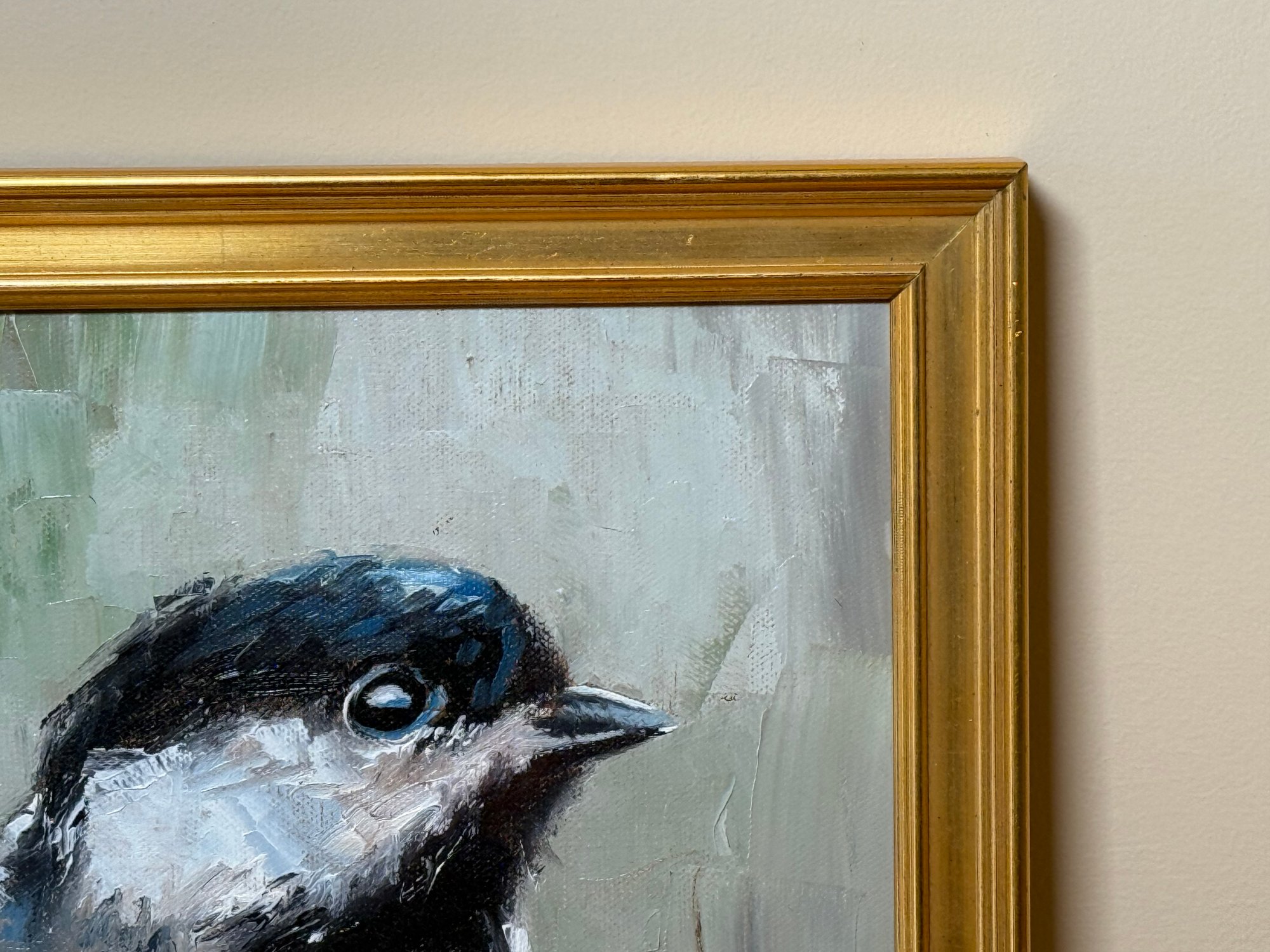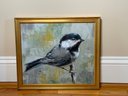 This beautiful painting by RA Rose features the sweetest black capped chickadee song bird in its natural environment. Signed lower right hand corner. Pretty gold painted frame.
