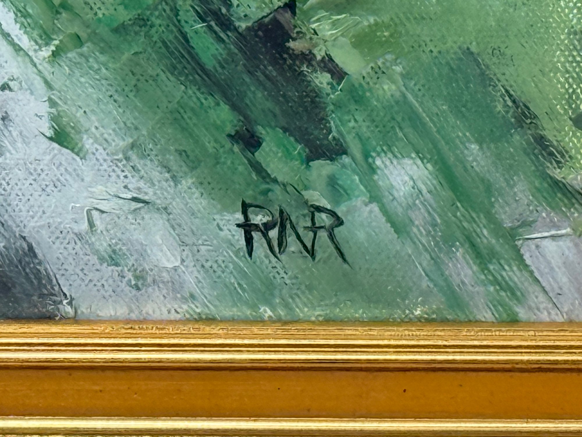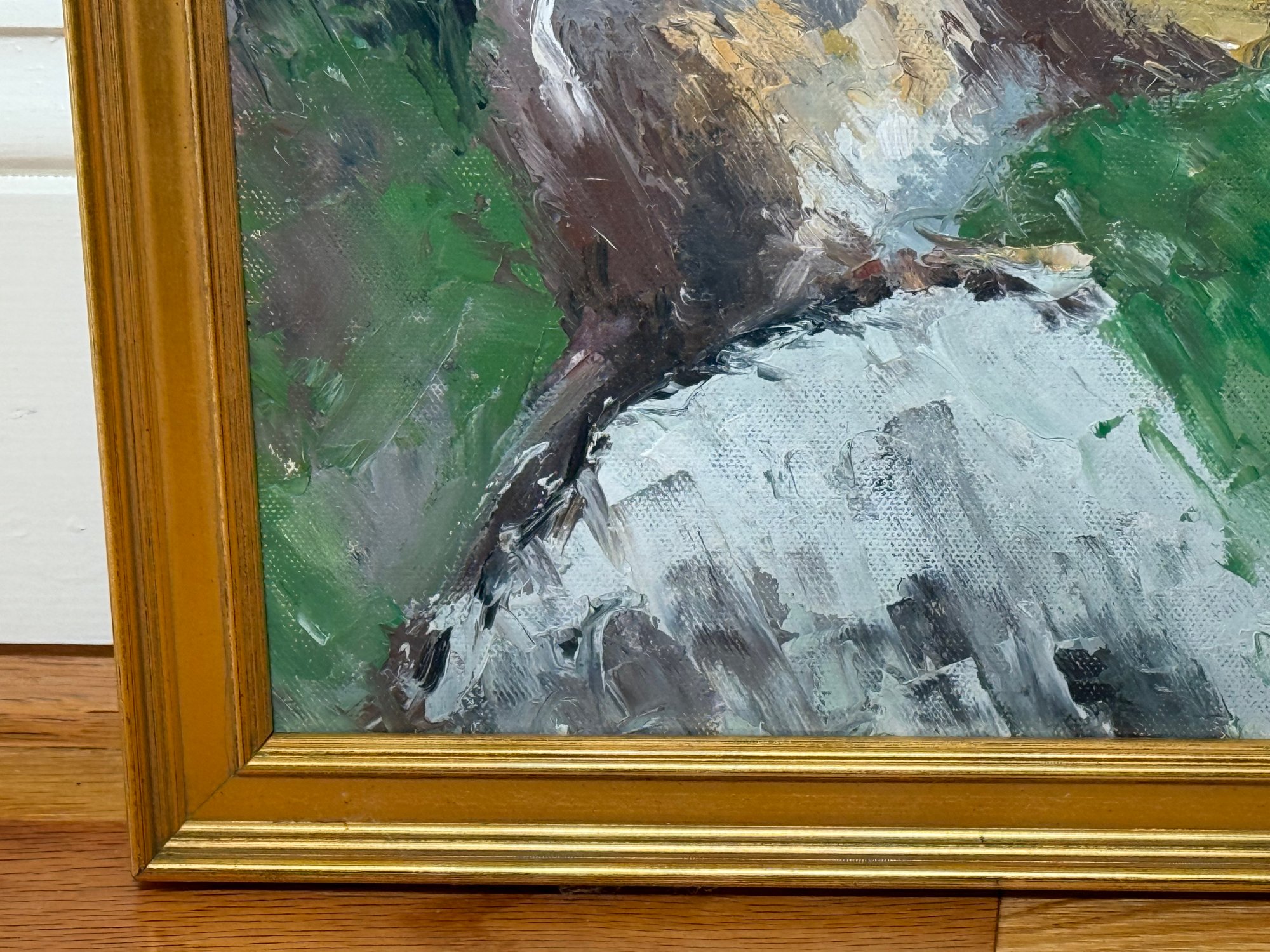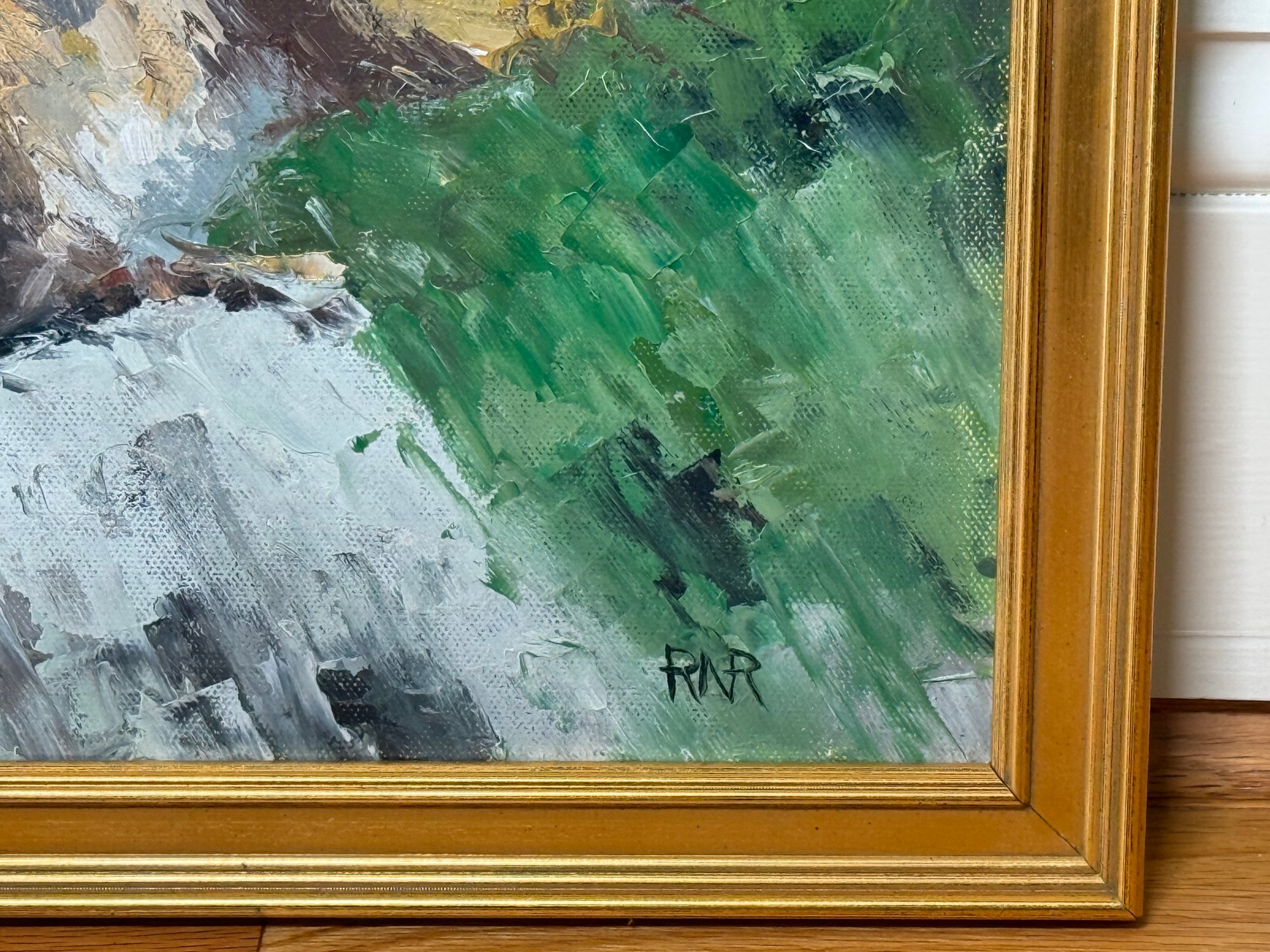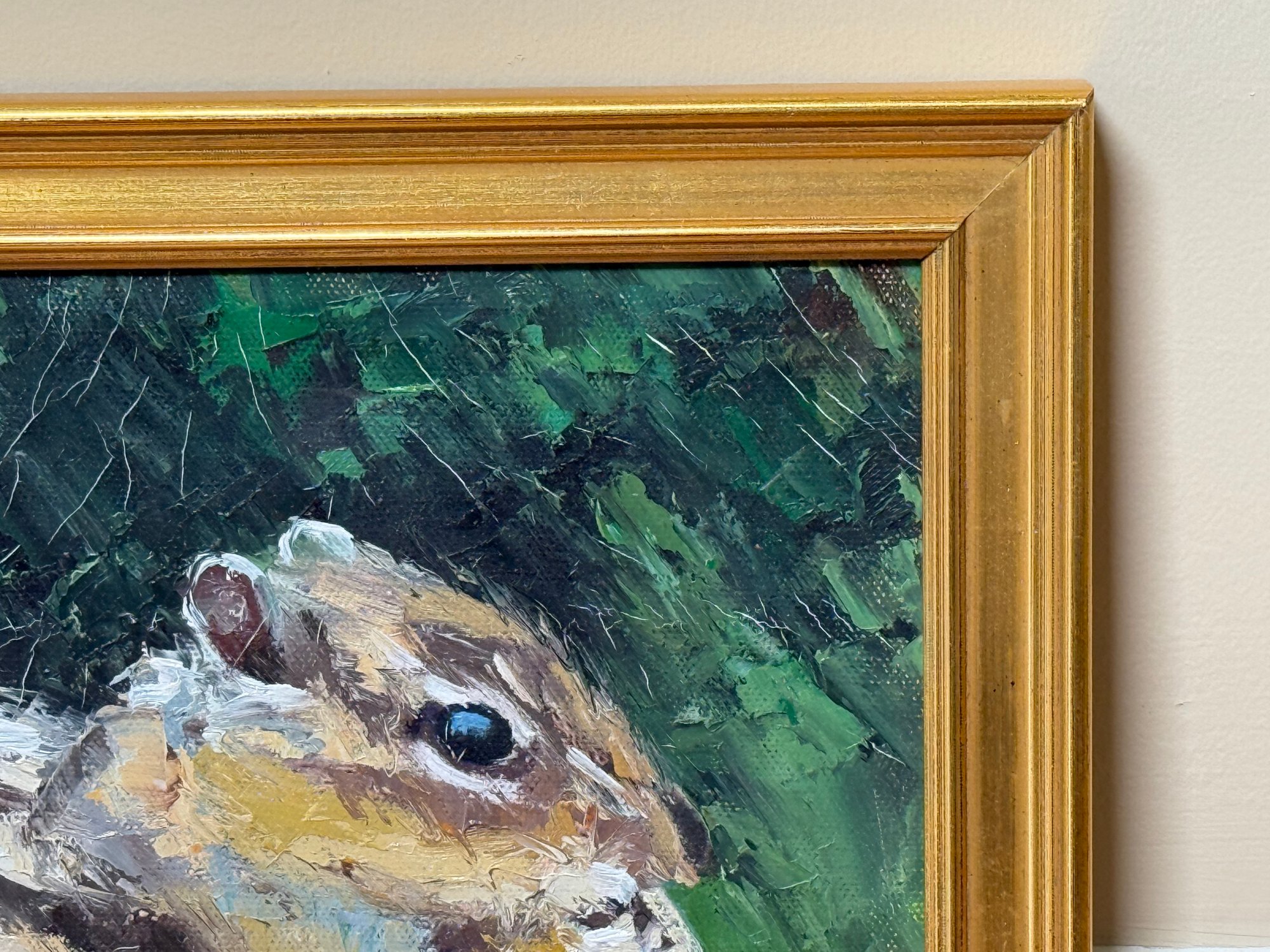This beautiful chipmunk painting is signed in the lower right hand corner by RA Rose. Pretty gold painted frame.
