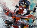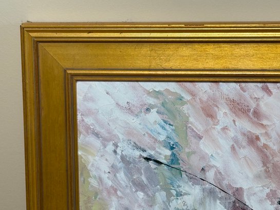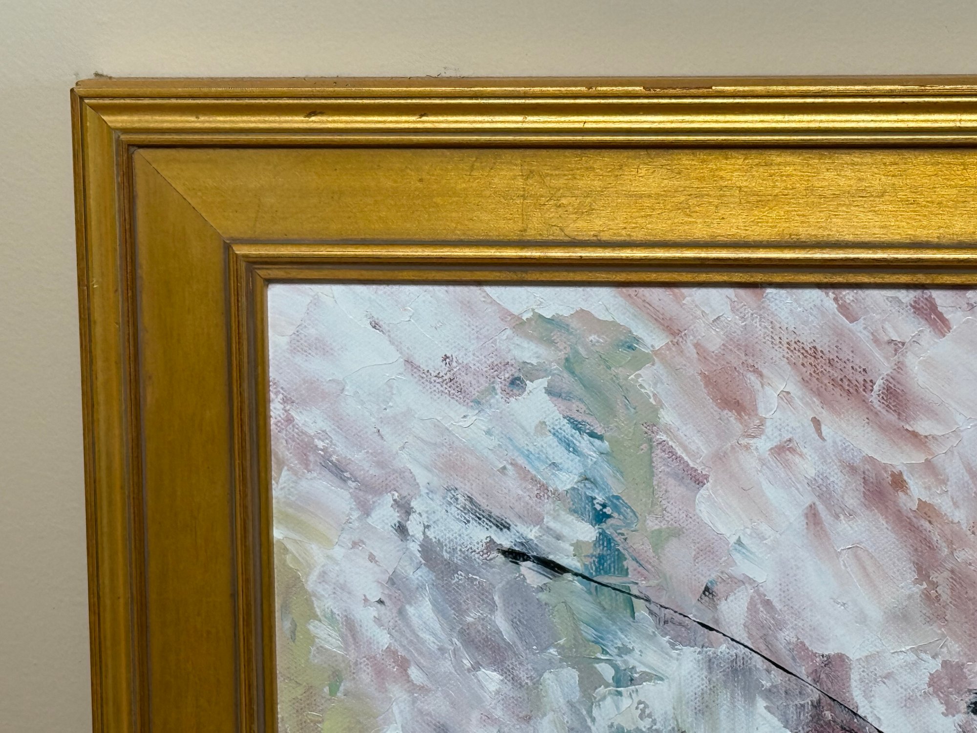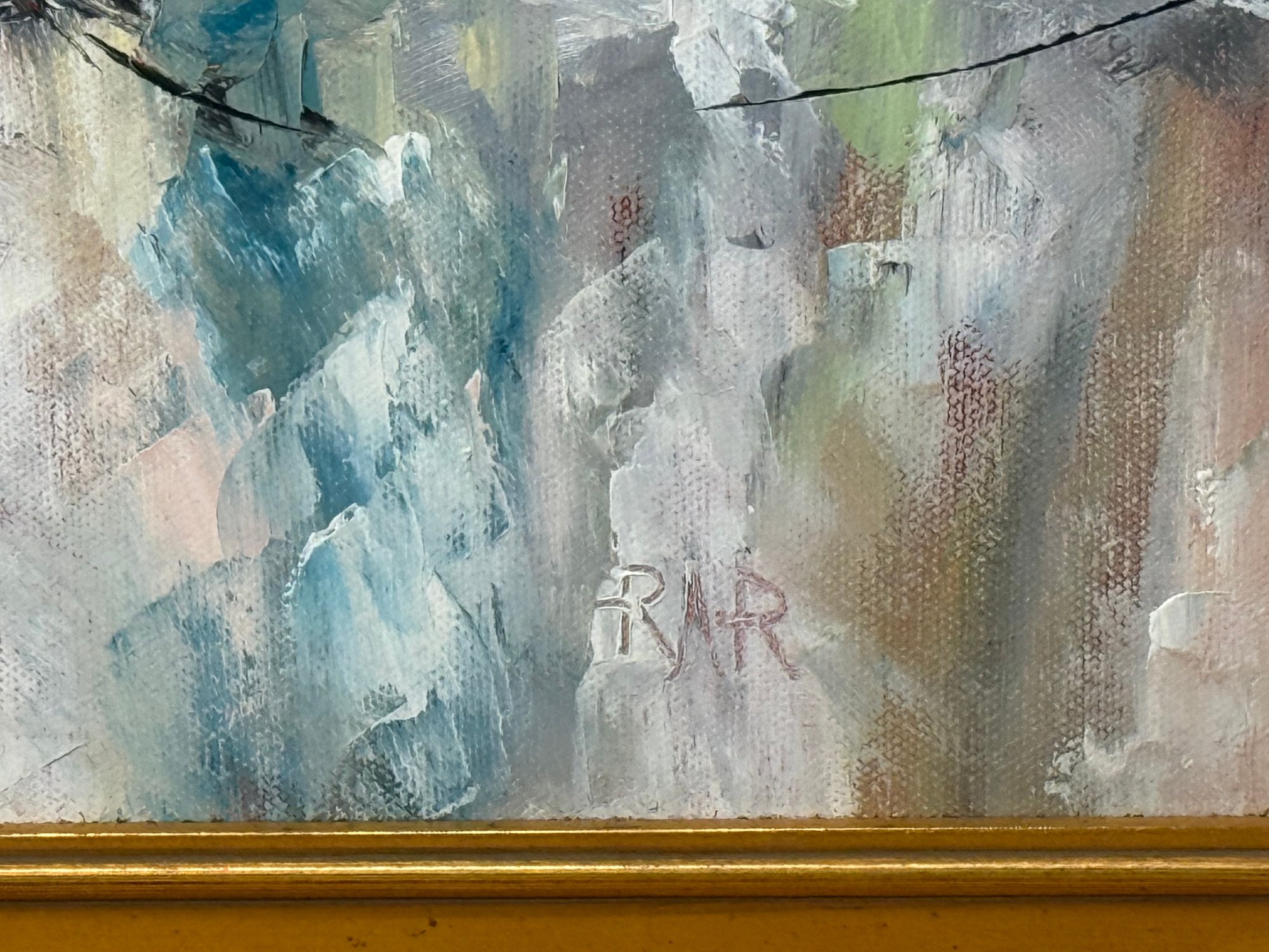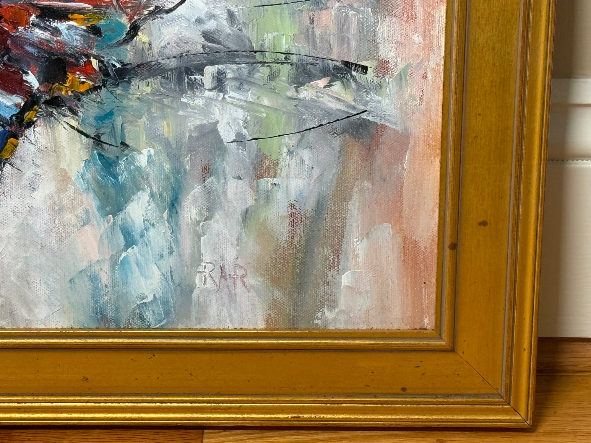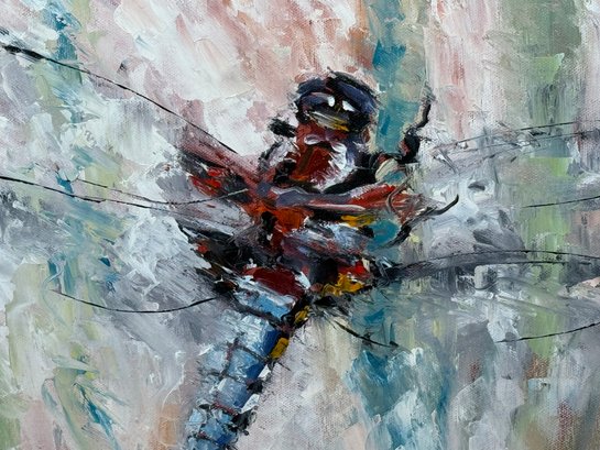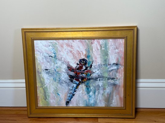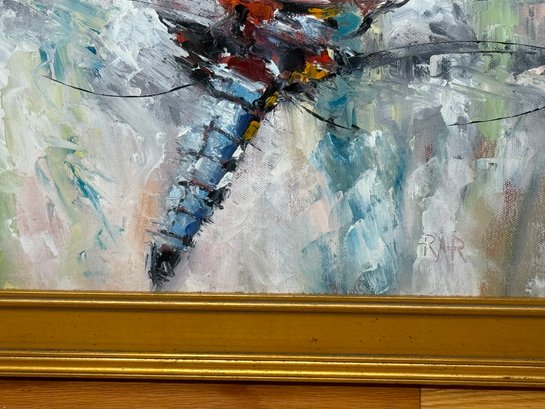 This beautiful dragon fly painting by RA Rose is signed in lower right hand corner “RAR”. It has a pretty gold frame. The texture and colors are beautiful.