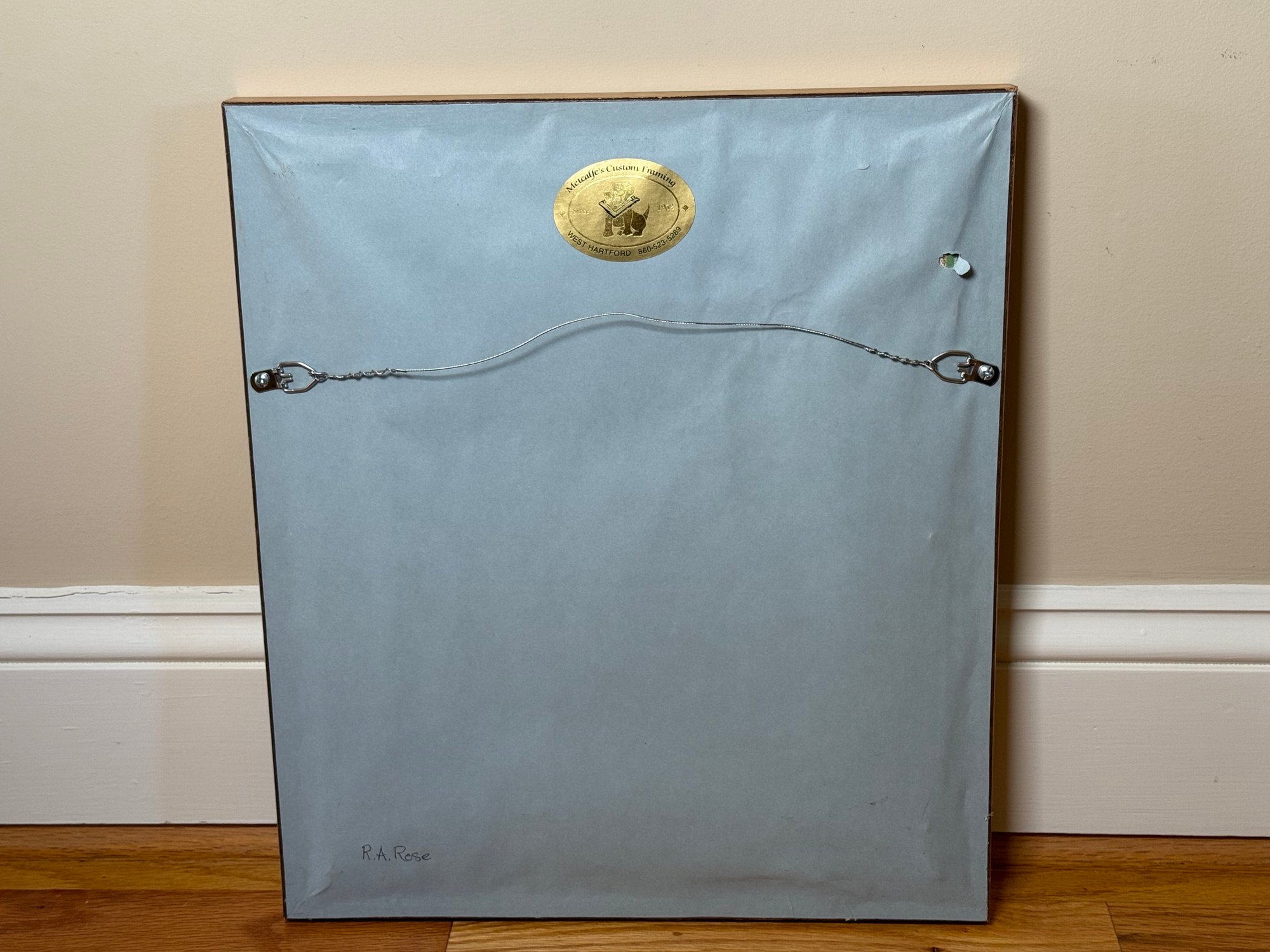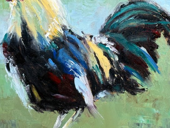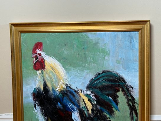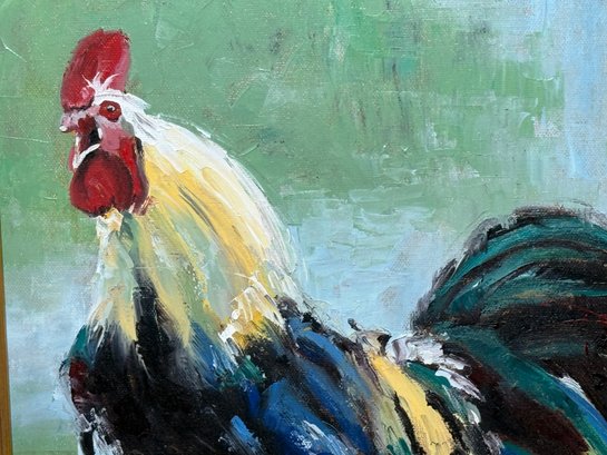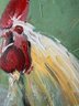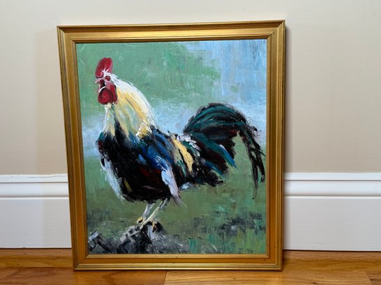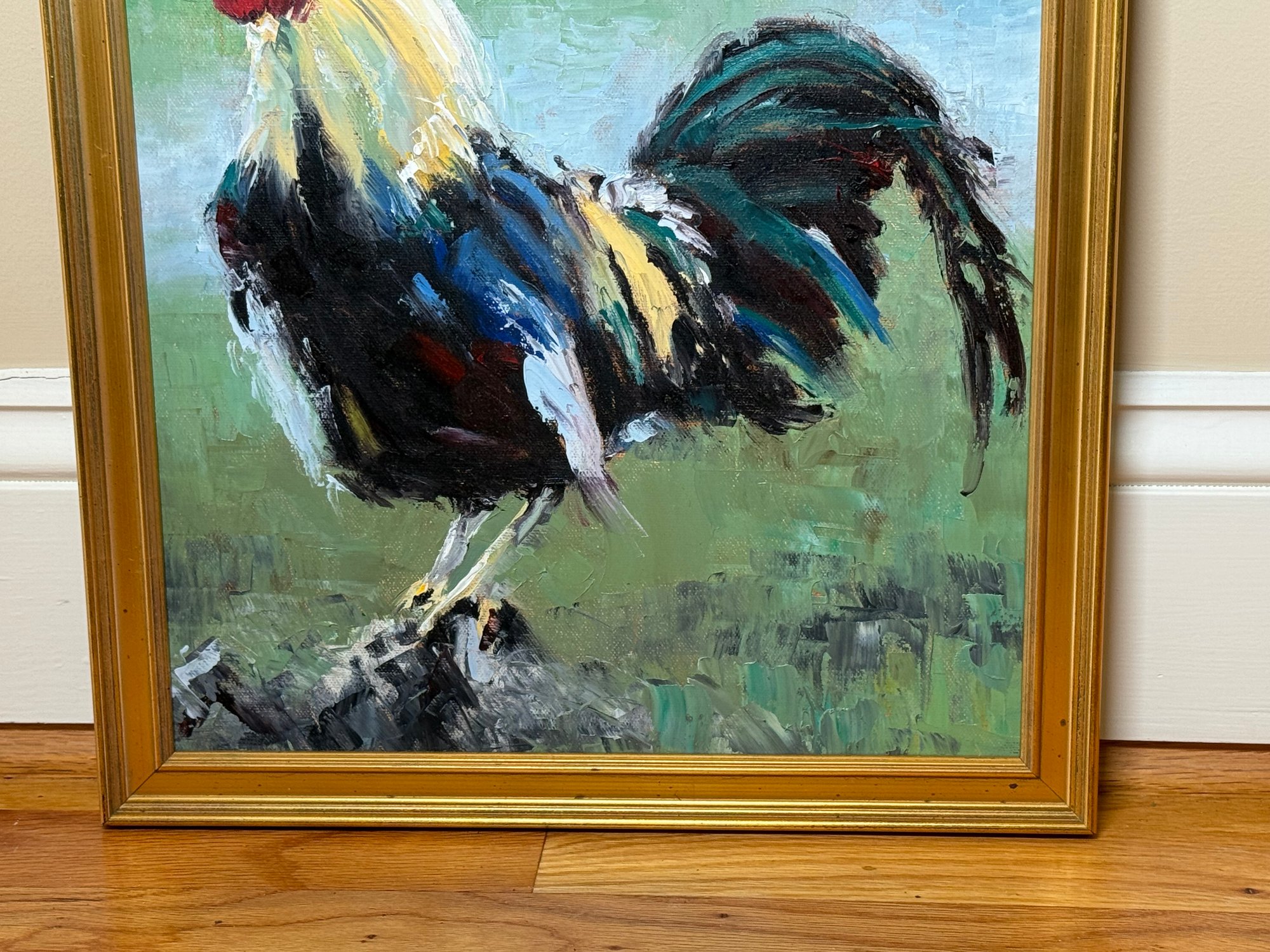 This beautiful painting by RA Rose features a pretty rooster in its natural environment. We had trouble finding her signature, sometimes it really blends into her work. Pretty gold painted frame.