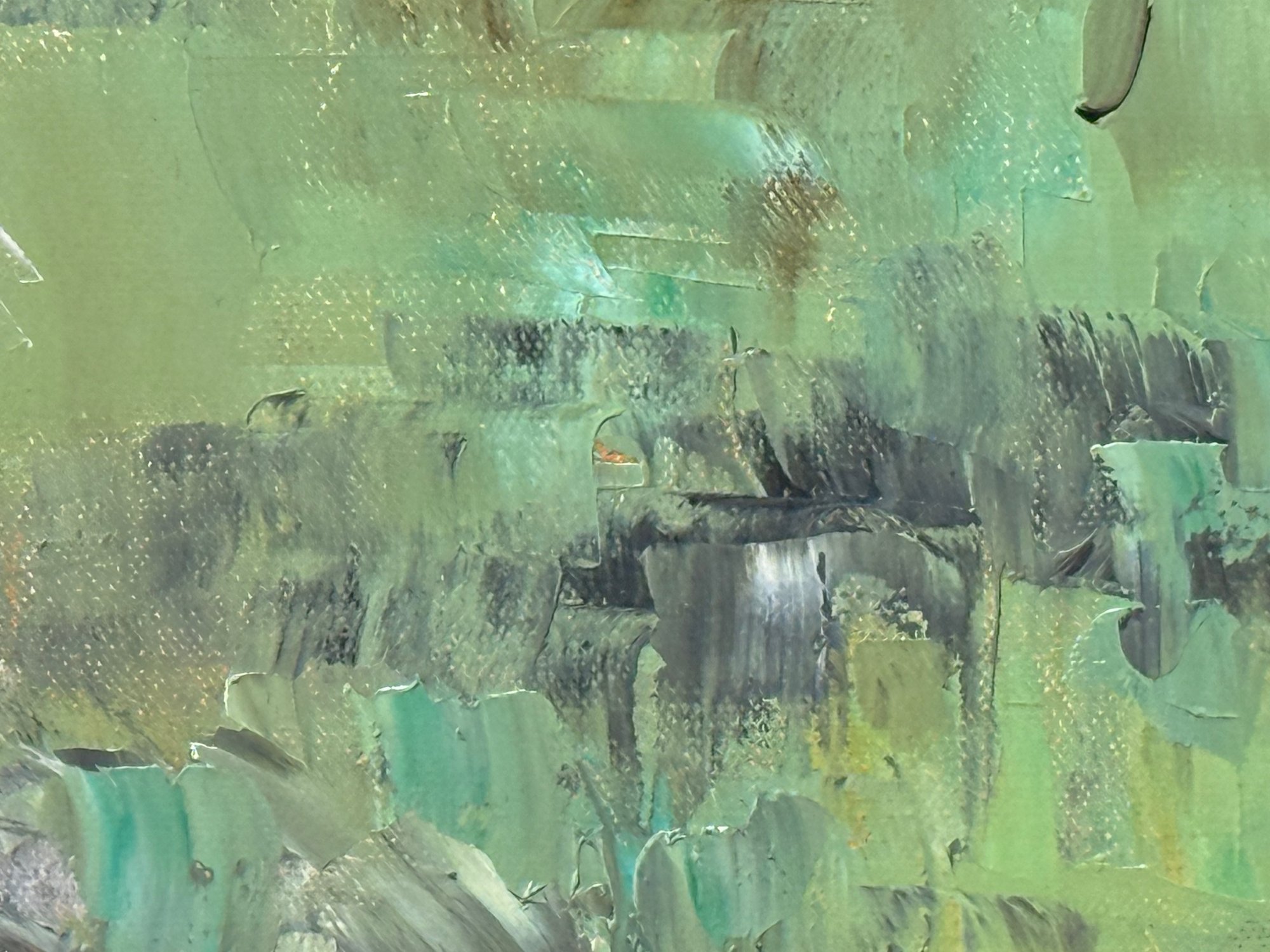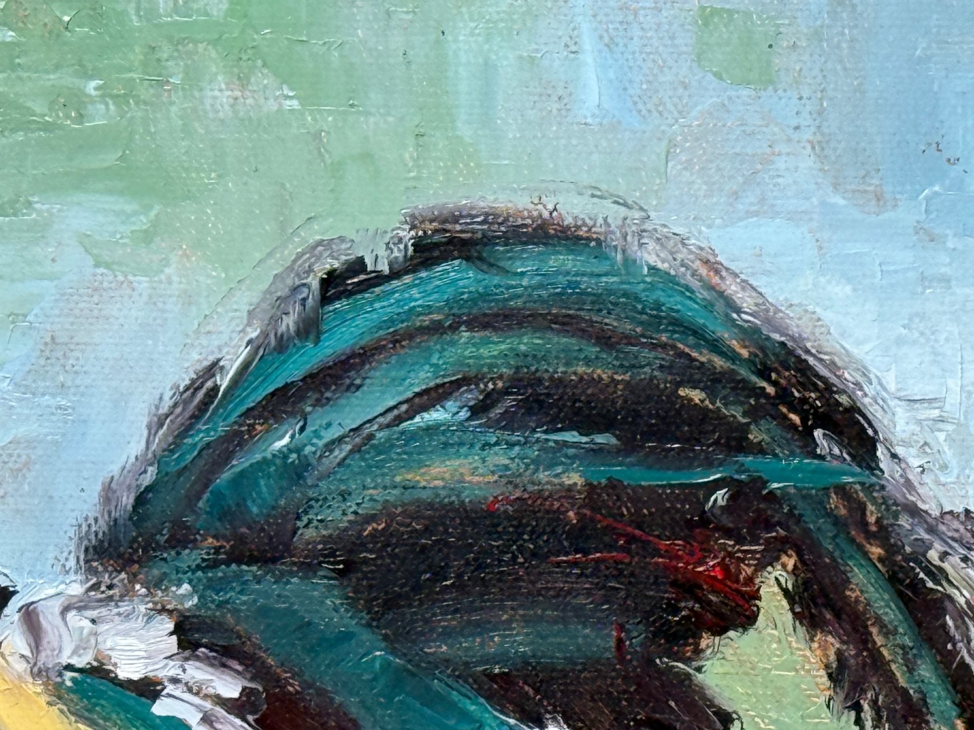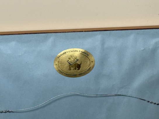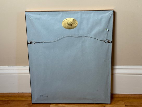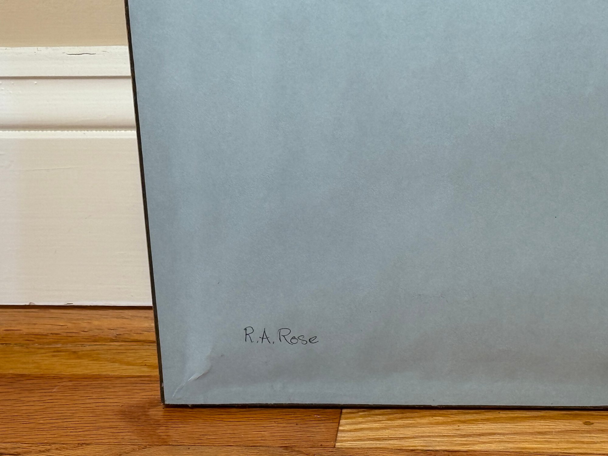 This beautiful painting by RA Rose features a pretty rooster in its natural environment. We had trouble finding her signature, sometimes it really blends into her work. Pretty gold painted frame.