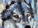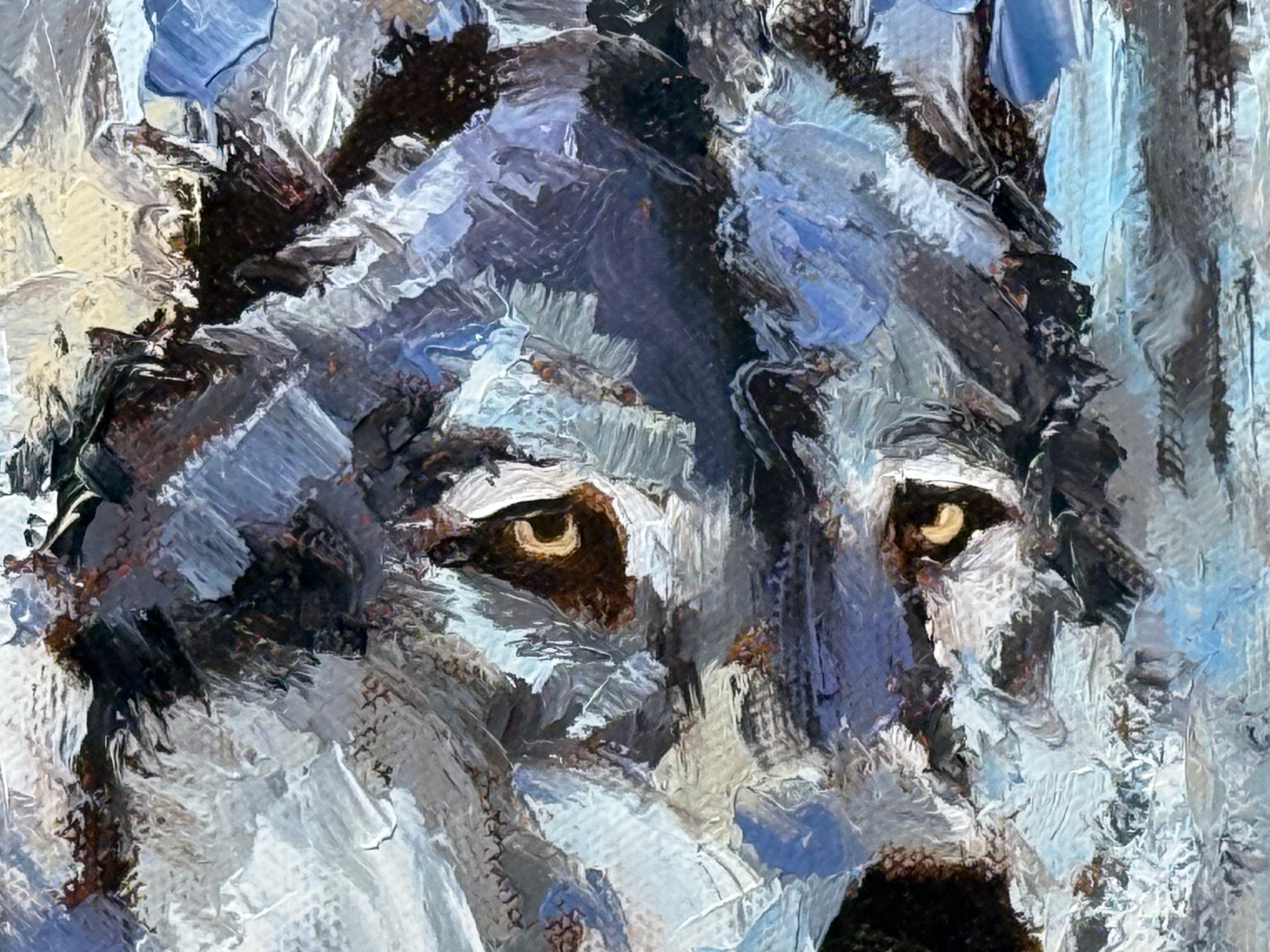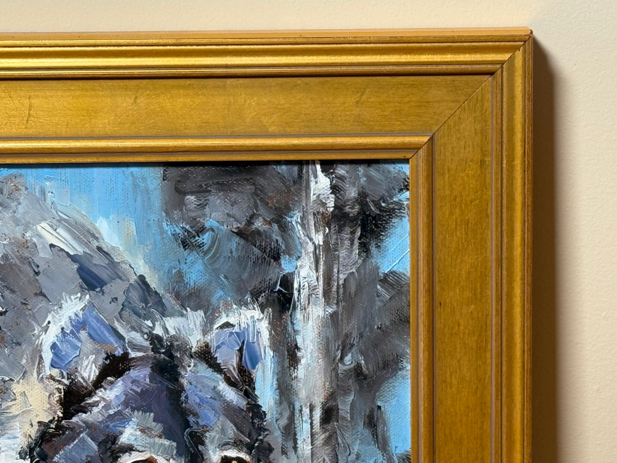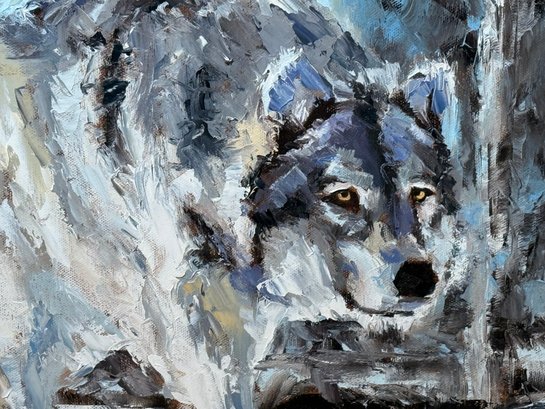 This beautiful original oil painting by RA Rose features a wolf in the winter in its natural environment. Great texture and wintery color scheme. Signed bottom right hand corner by artist. Pretty gold painted frame.