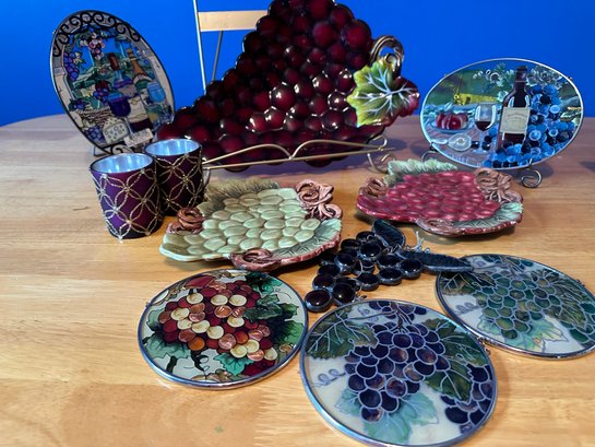 2 stained glass wallhangings, 2 votive holders; 2 grape plates; grape stained glass wall hangings; grape serving plate; 3 small grape stained glass wall hangings;