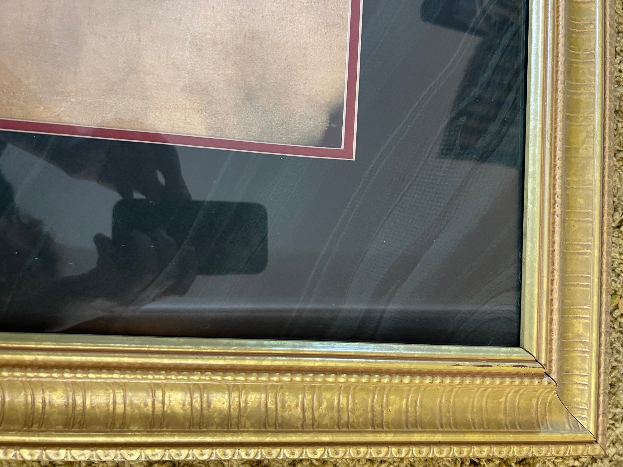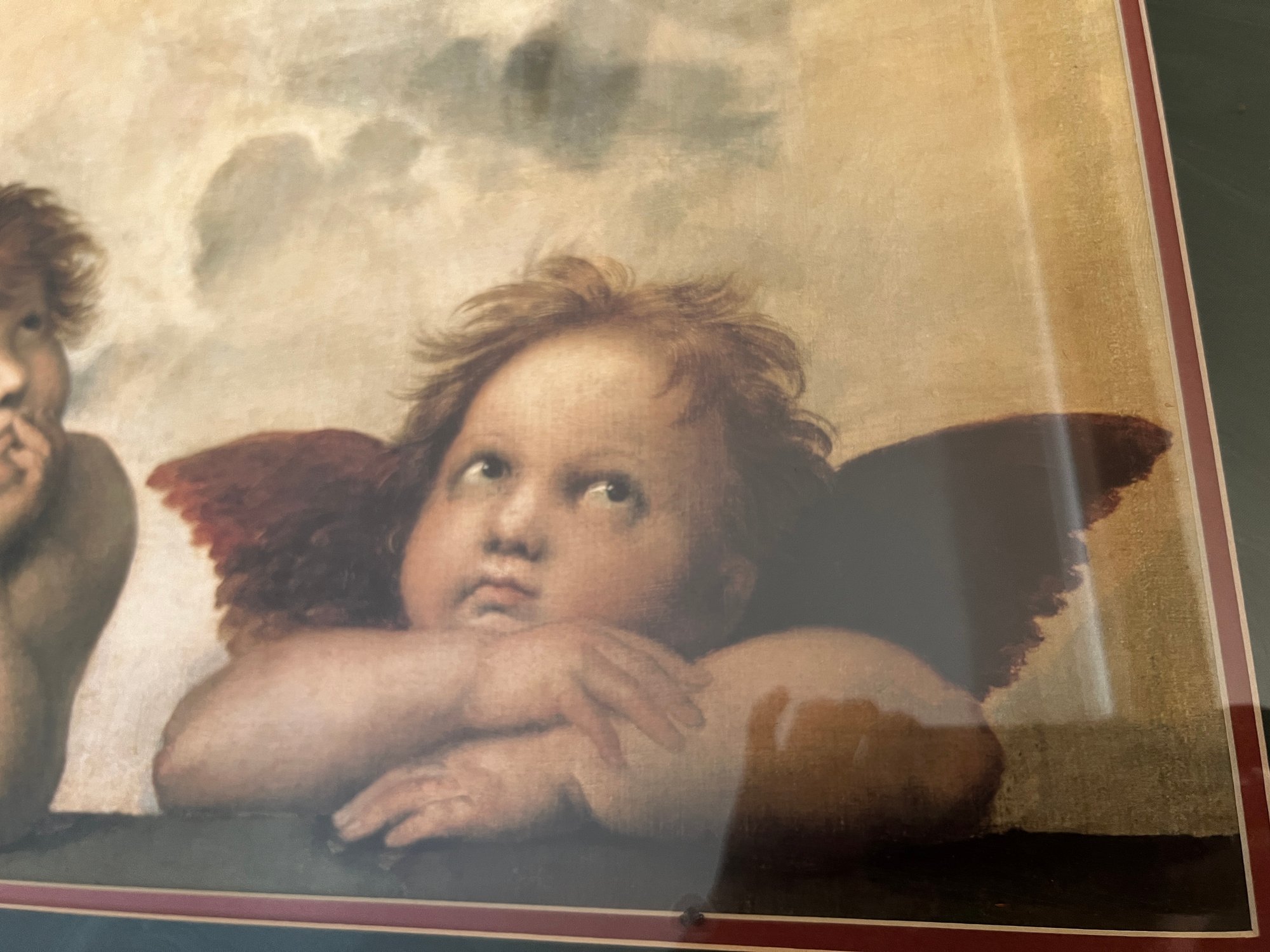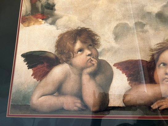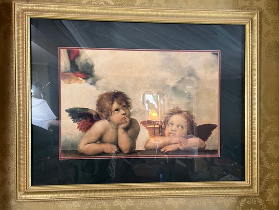 Large nicely framed print of Raphael's Sistine Chapel angels in a thick giltwood frame.