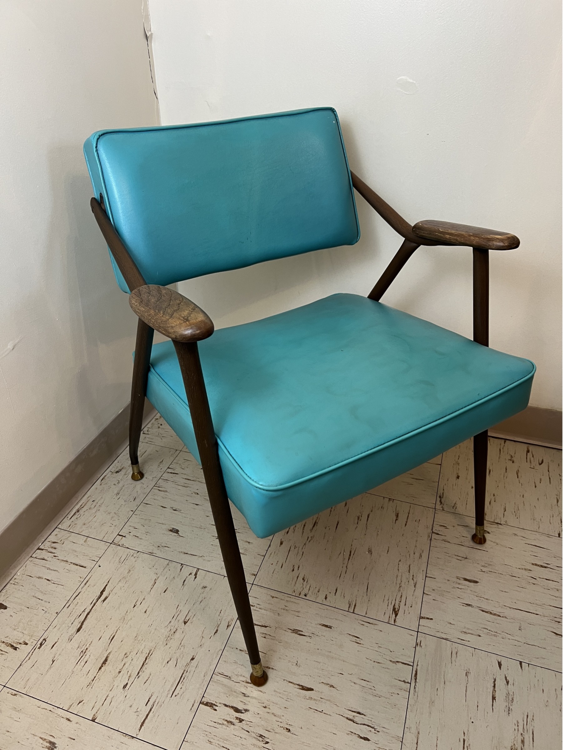 Oozing mid century atomic ranch style this original 1959 Viko Baumritter armchair in turquoise vinyl is the epitome of twentieth century modern design. It features a tubular metal construction with an exterior finish that mimics wood grain and real walnut armrests as well as an adjustable seatback that pivots to fit you just right.