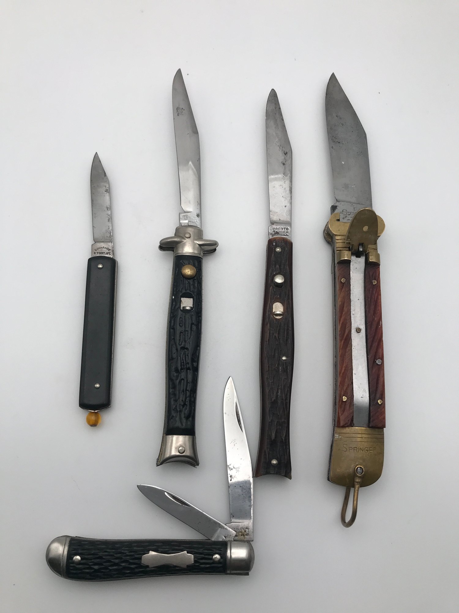 includes a Presto switchblade knife Schrade Geo Antique Presto Fishtail Auto Brown Bone