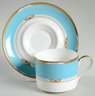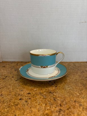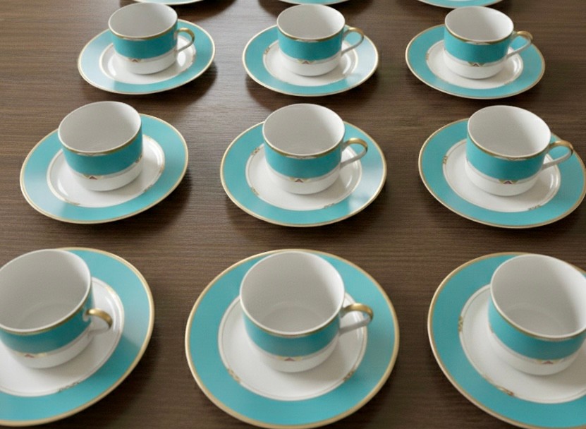 • Design: Deep turquoise bands framed by intricate Art Deco "stepped" gold gilding. The handles feature a distinctive curved, architectural silhouette.