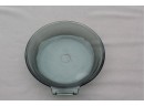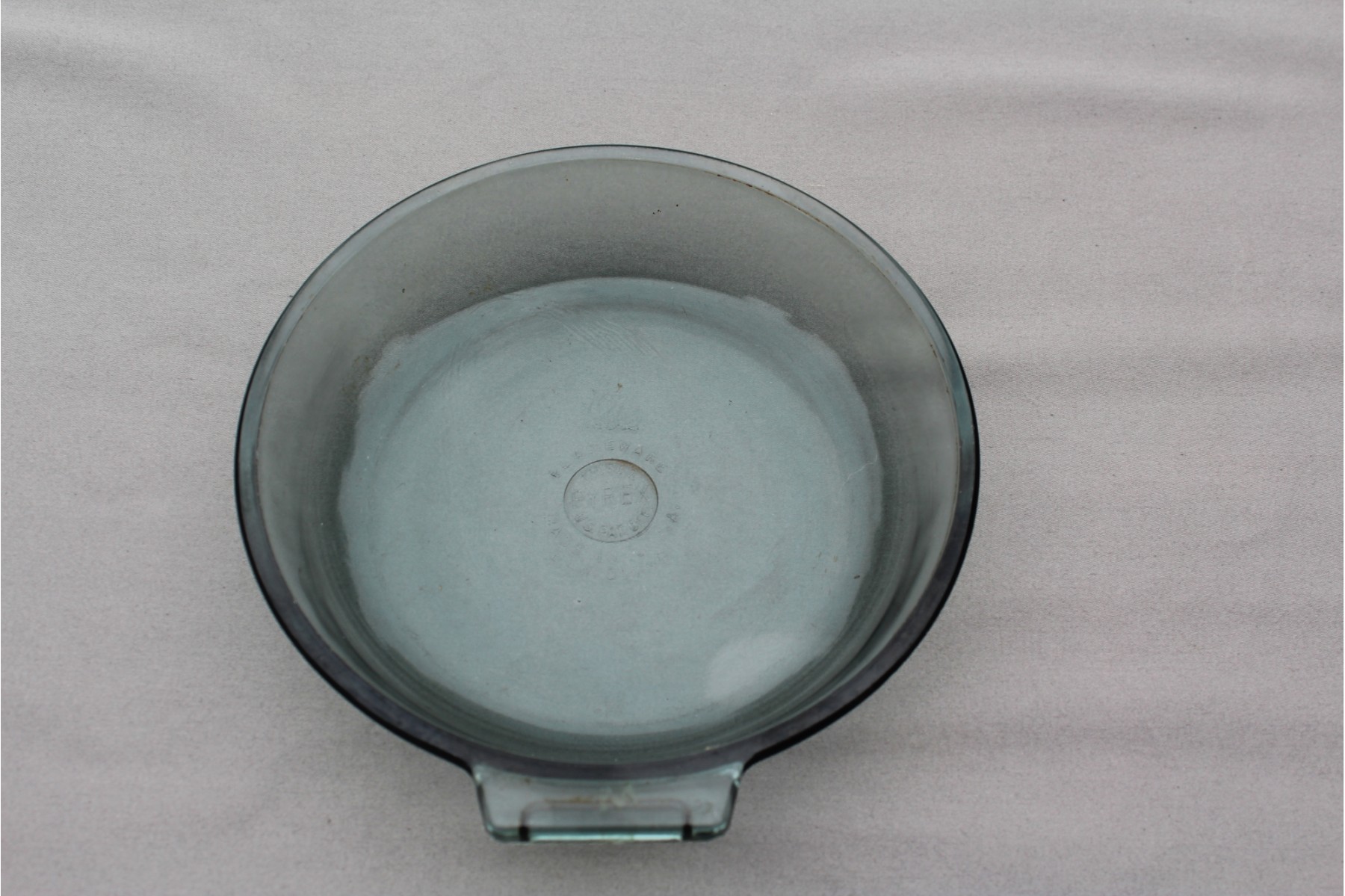 Very rare to find Bluish tint Flameware with this 7" Saucepan that has the correct marking and introduced in 1936. Bluish tint ended about 10-12 years later when they were made more clear glass. "Flameware was a different type of glass composition from the regular Pyrex. The blue tint was designed to distinguish it from clear Pyrex items. The earlier pieces went into production around 1936." This meant is could be used over an open flame with a detachable handle (which I do not have). The bluish tint to it was caused by alumino-sulfate added to the glass formula. This is 7" diameter. close-up of Flameware marking using yellow cloth to clarify. Cannot determine what E-F marking refers to.