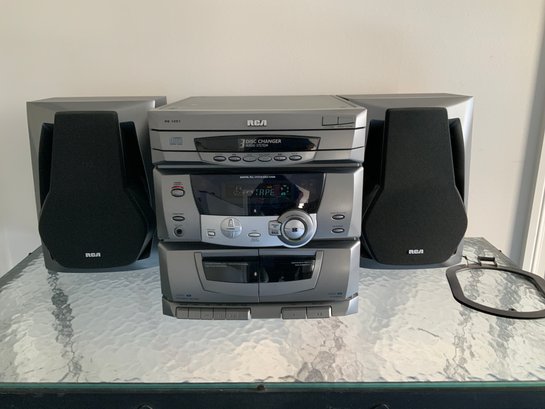RCA model RS 1251, complete stereo system with 2 speakers, three CD player, dual cassette deck and tuner/receiver. Powers on, radio functions well and reported to work great. We could not test CD or cassette decks.