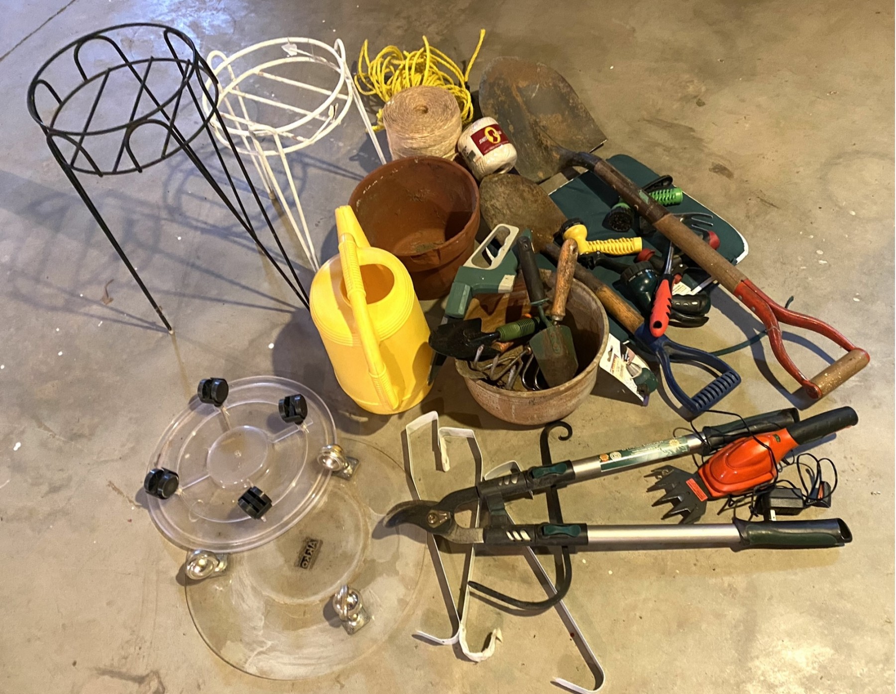 shovel, pots, hand tools, electric clippers, pruning shears, watering can, plant stands and more