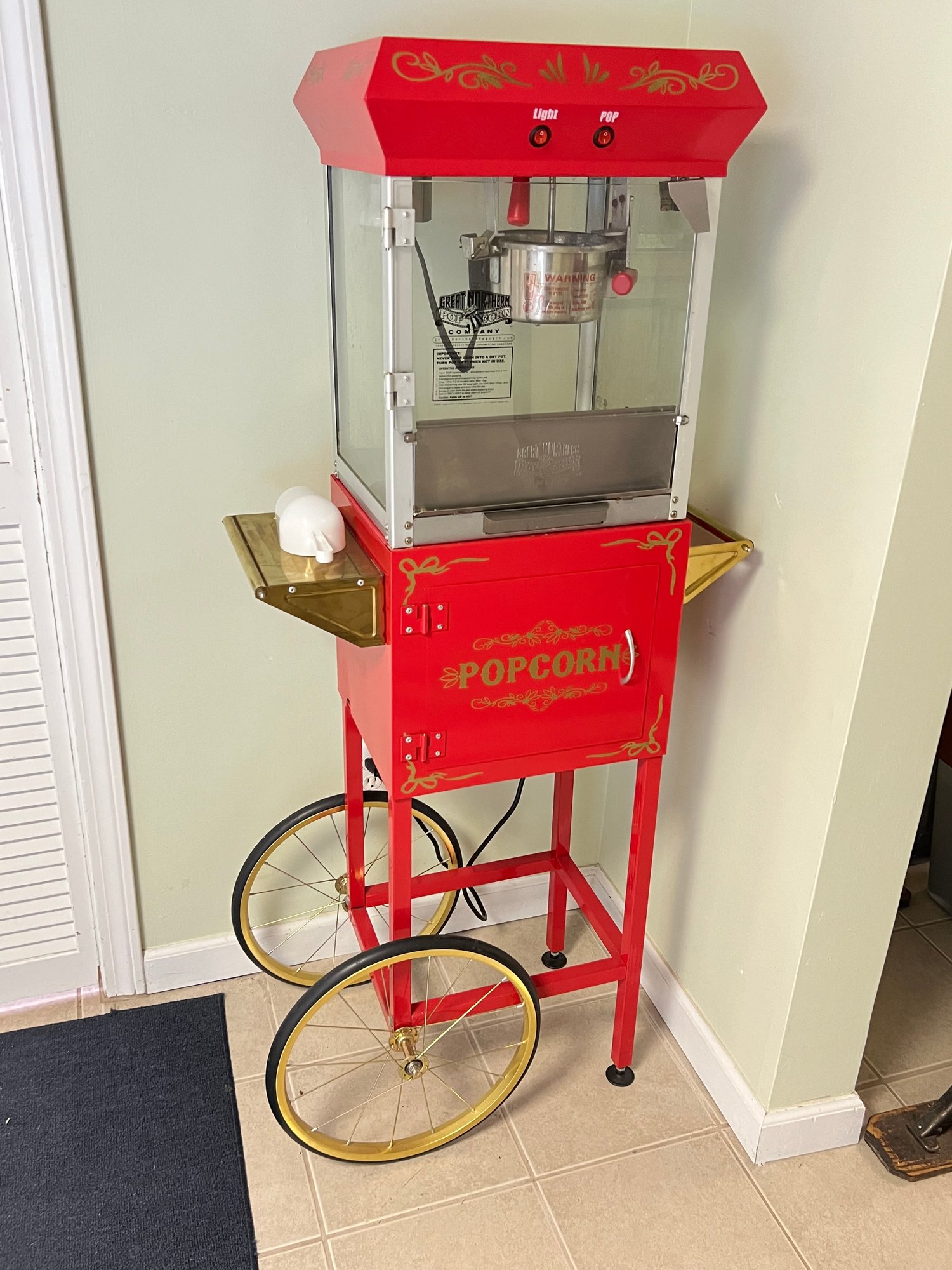 Works great, has some wear but ready to use. Includes some popcorn sets, and a ceramic bucket. 26” width, 16” depth, 57” height.