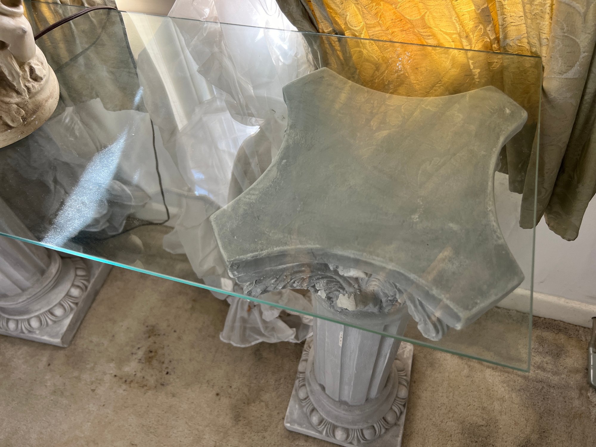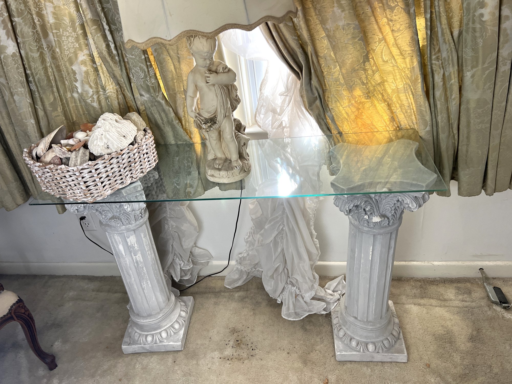 Console table with a base consisting of two Grecian Ionic style columns and a rectangular glass top.