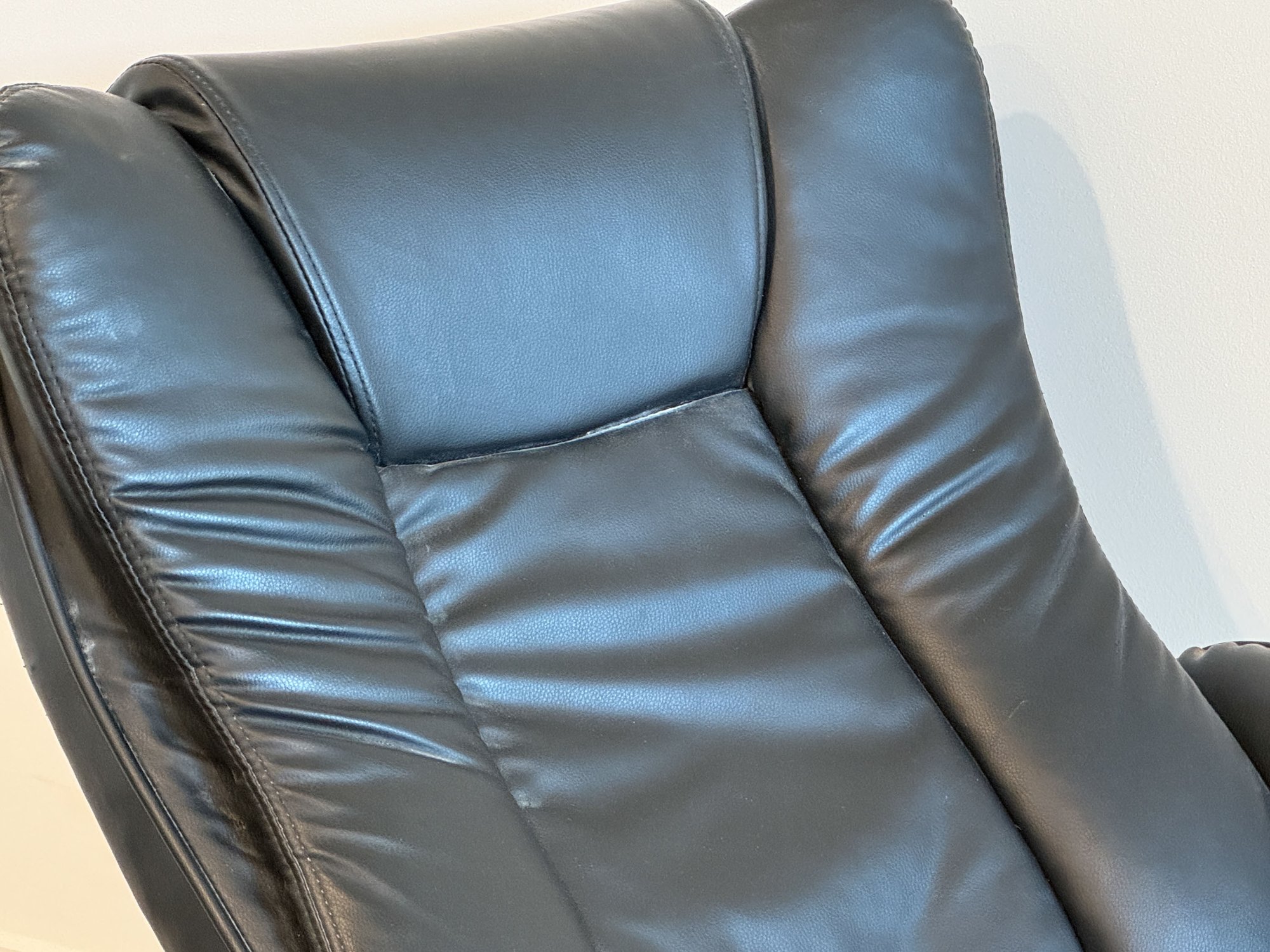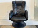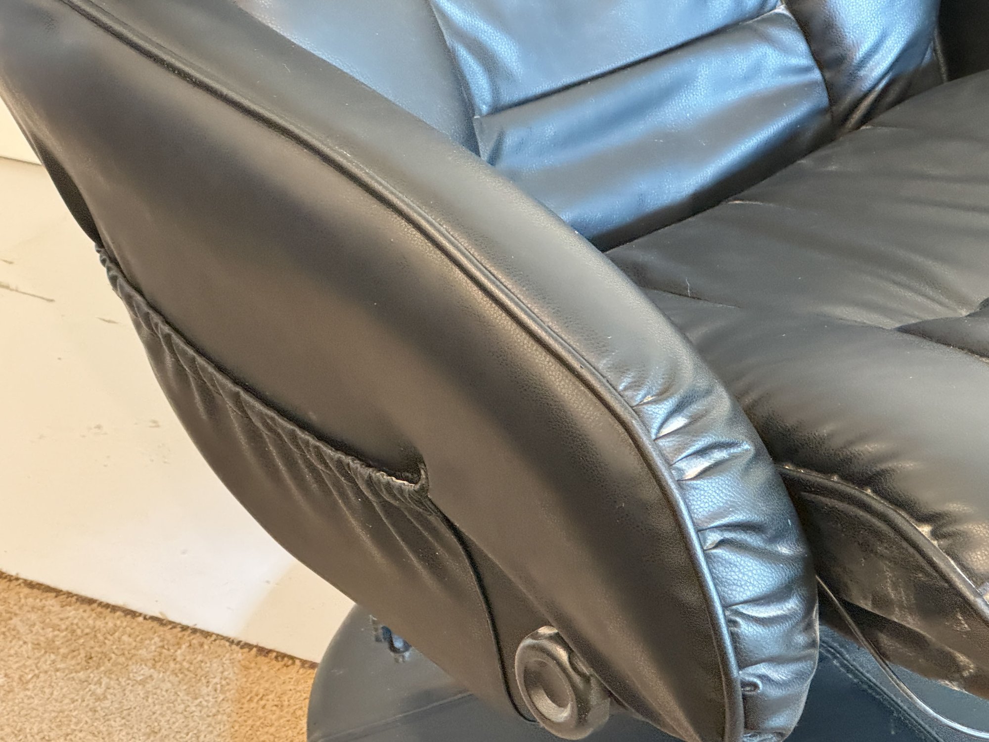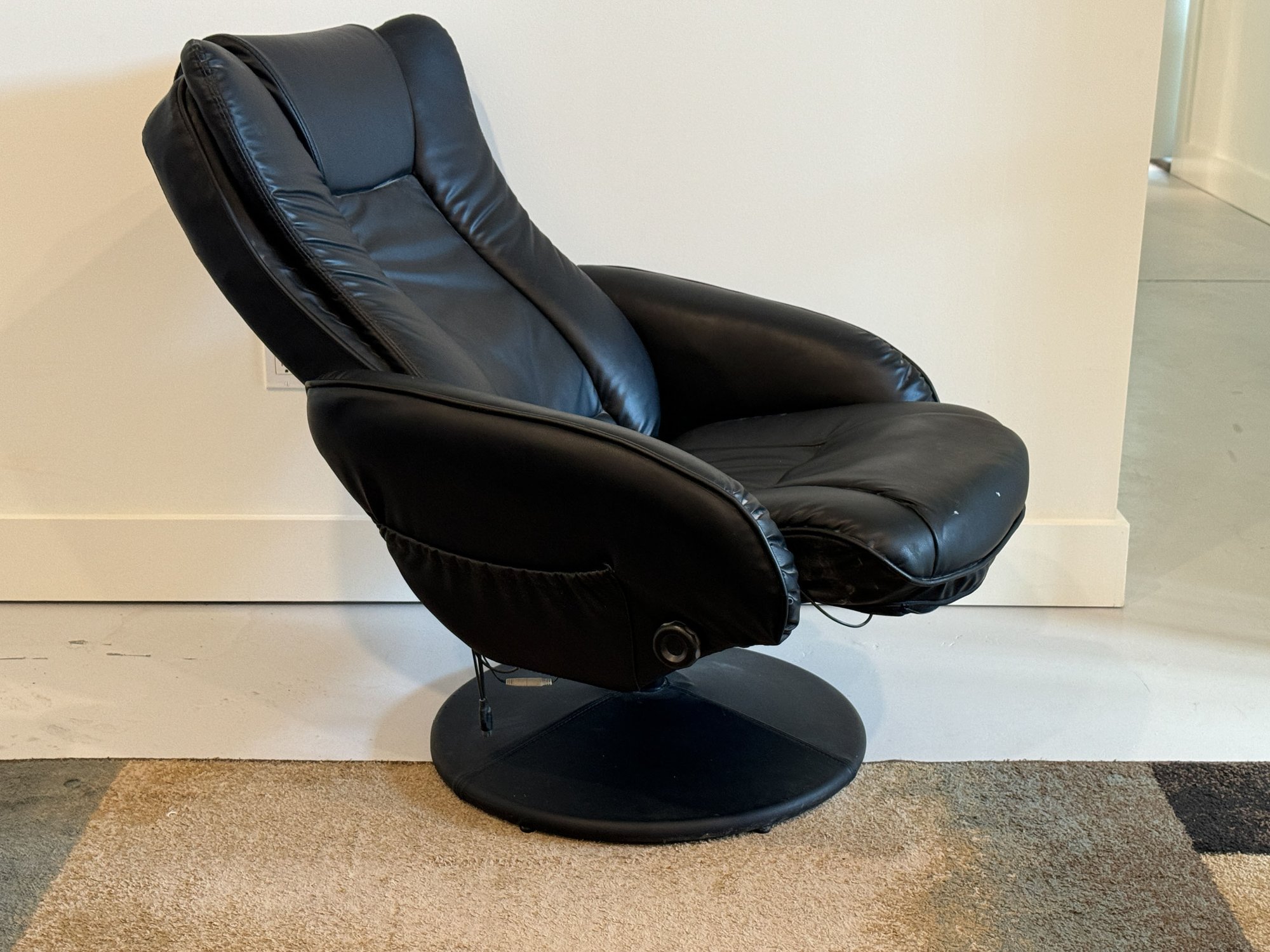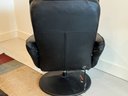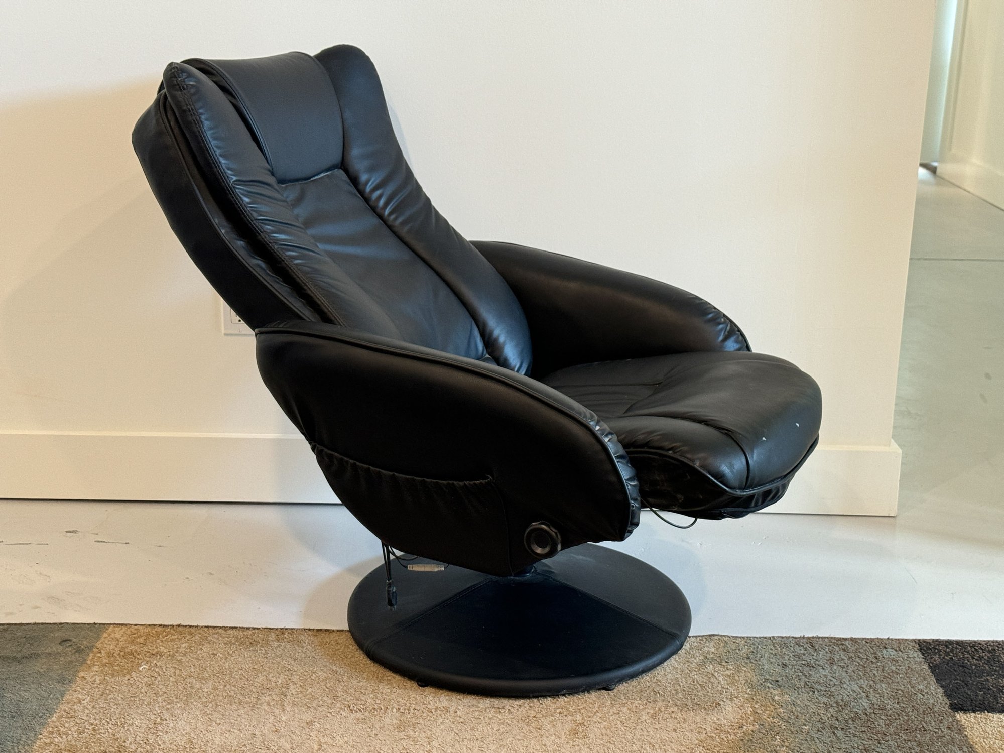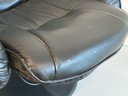 On a circular leather upholstered base with seat back that can hinge backwards and arms on either side.