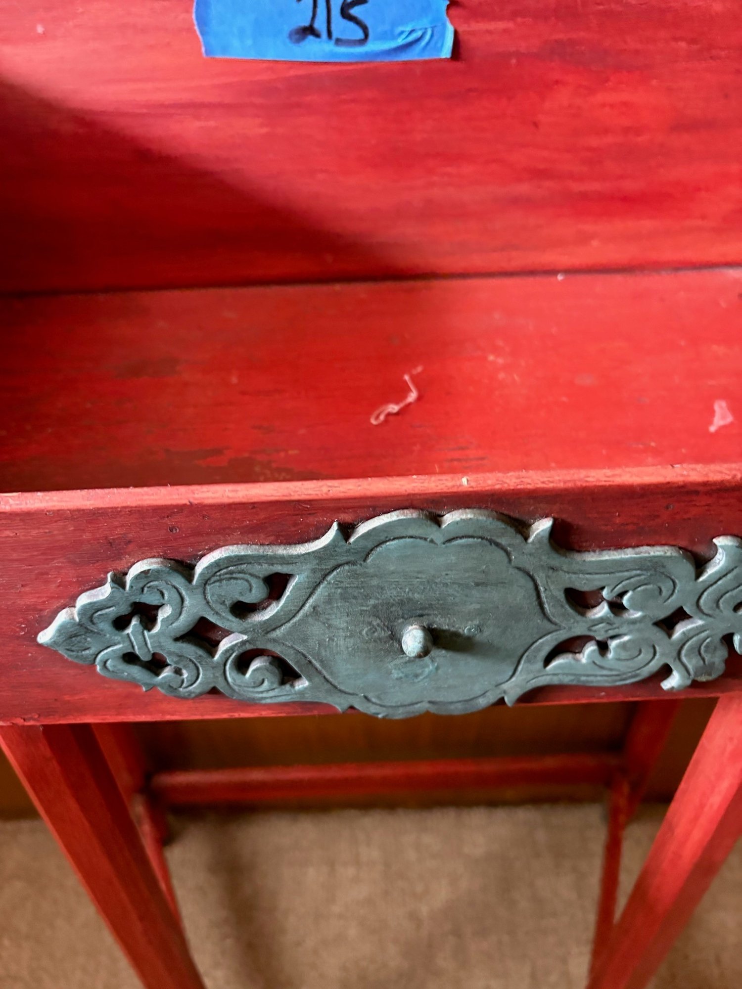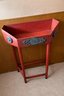 Fire Engine Red Asian Asian Console/Hall Table/Plant stand with applied carved wood Verdigris accents. Dimensions: 24"x 12"x 33.5"H