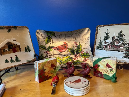 2 St. Nicholas Square plates; 1 Red bird plate; 12 Red Bird coasters; 2 Red iron bird candle holders; Red Bird Spreader