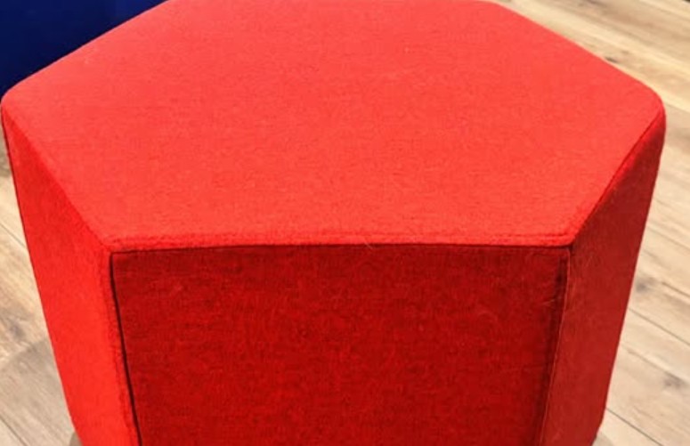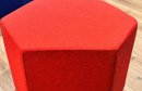 Red six-sided Hecks ottoman with powder coated steel Hecks tray to provide a more stable and spill-free area. Tray shown on a blue ottoman but only red one is available.