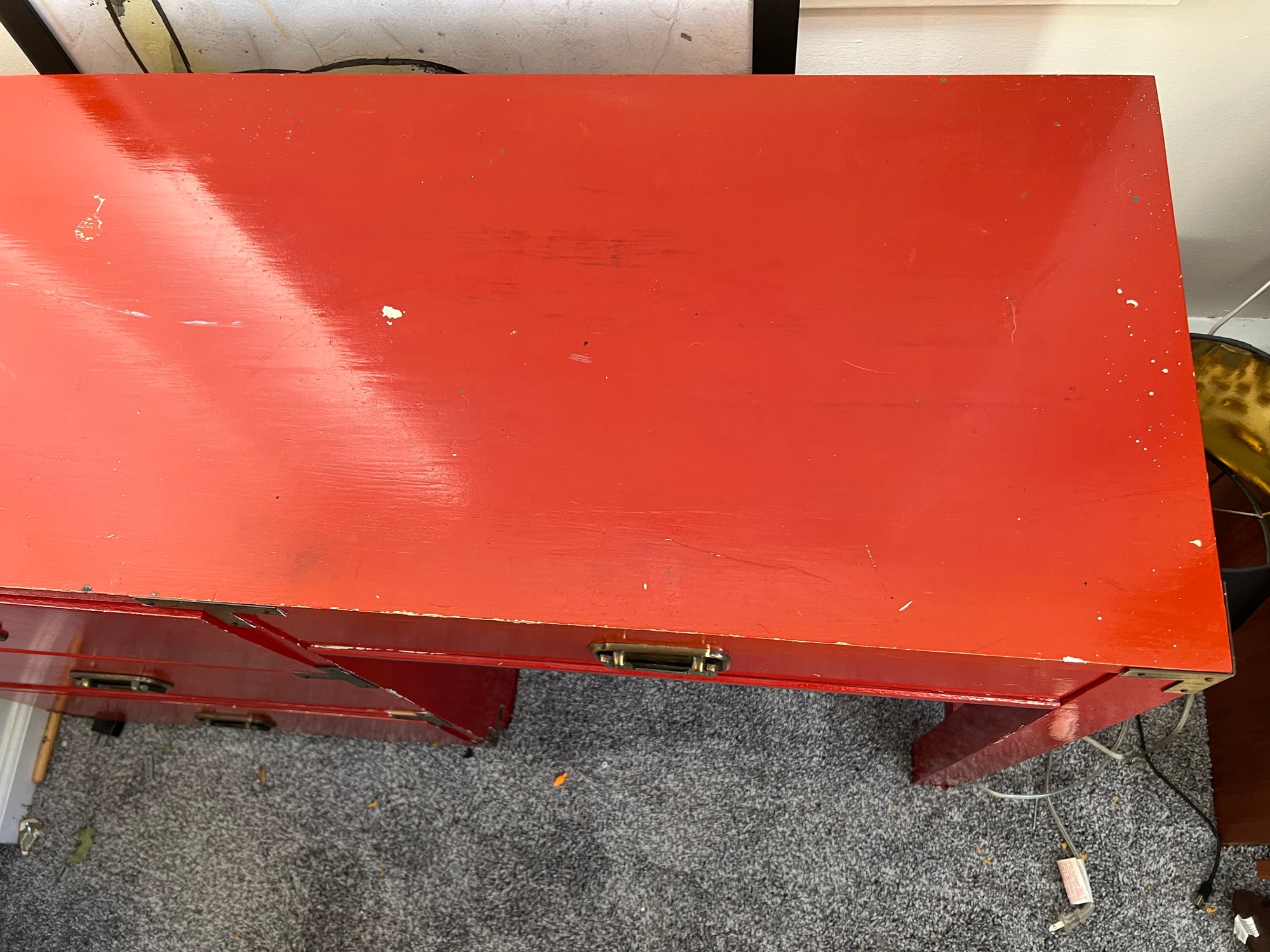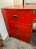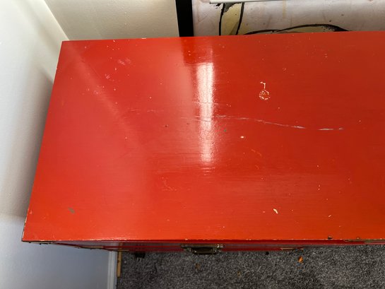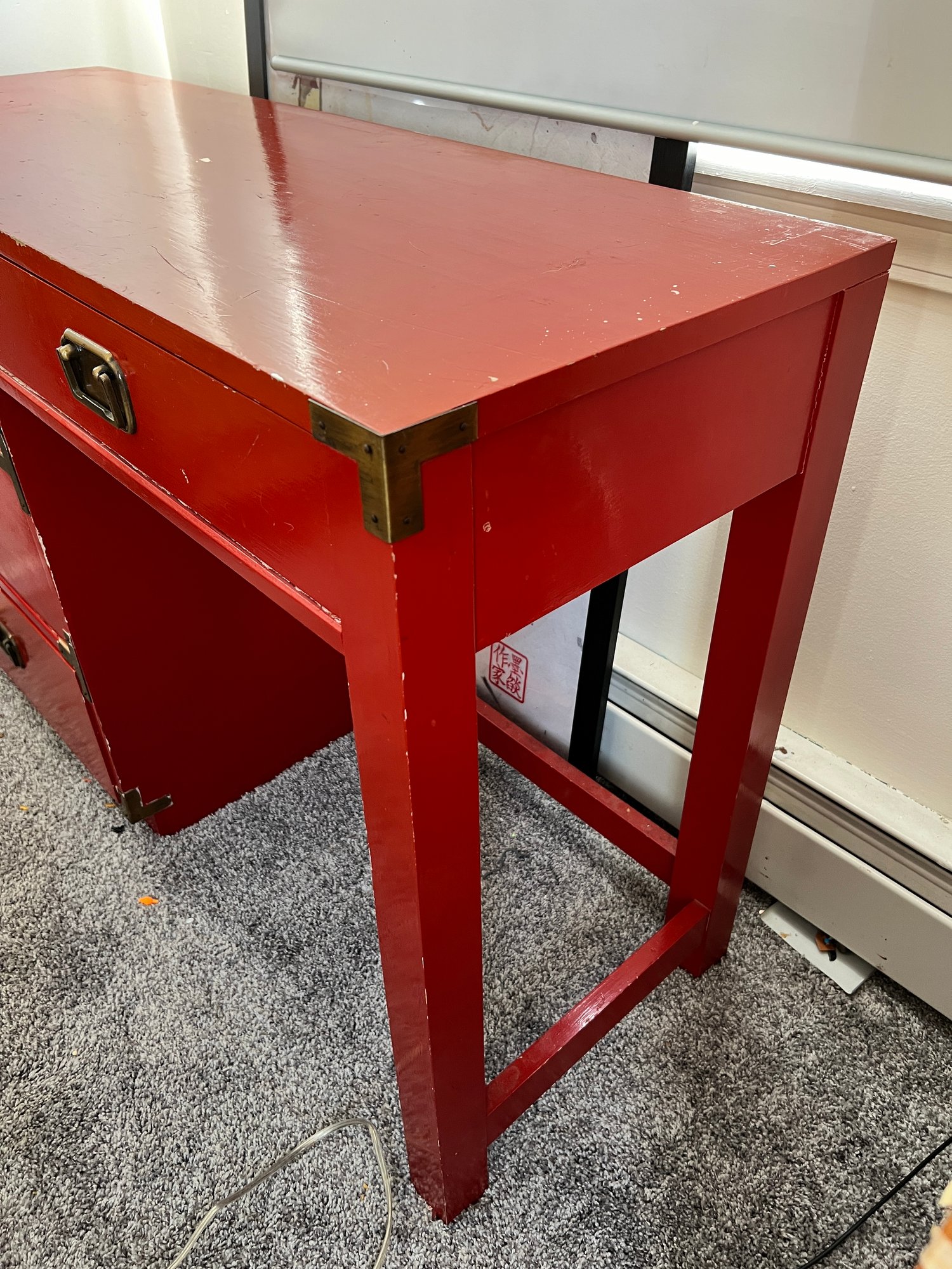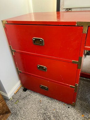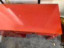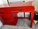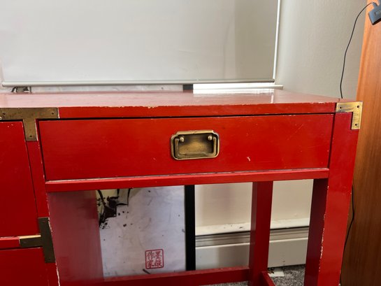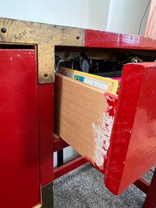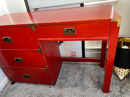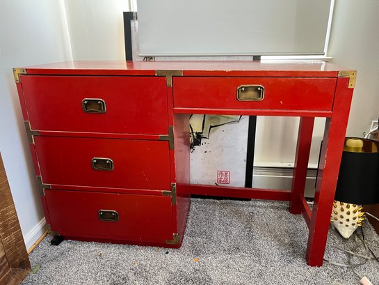 Campaign style student's desk in a high-gloss red lacquer finish with brass hardware.