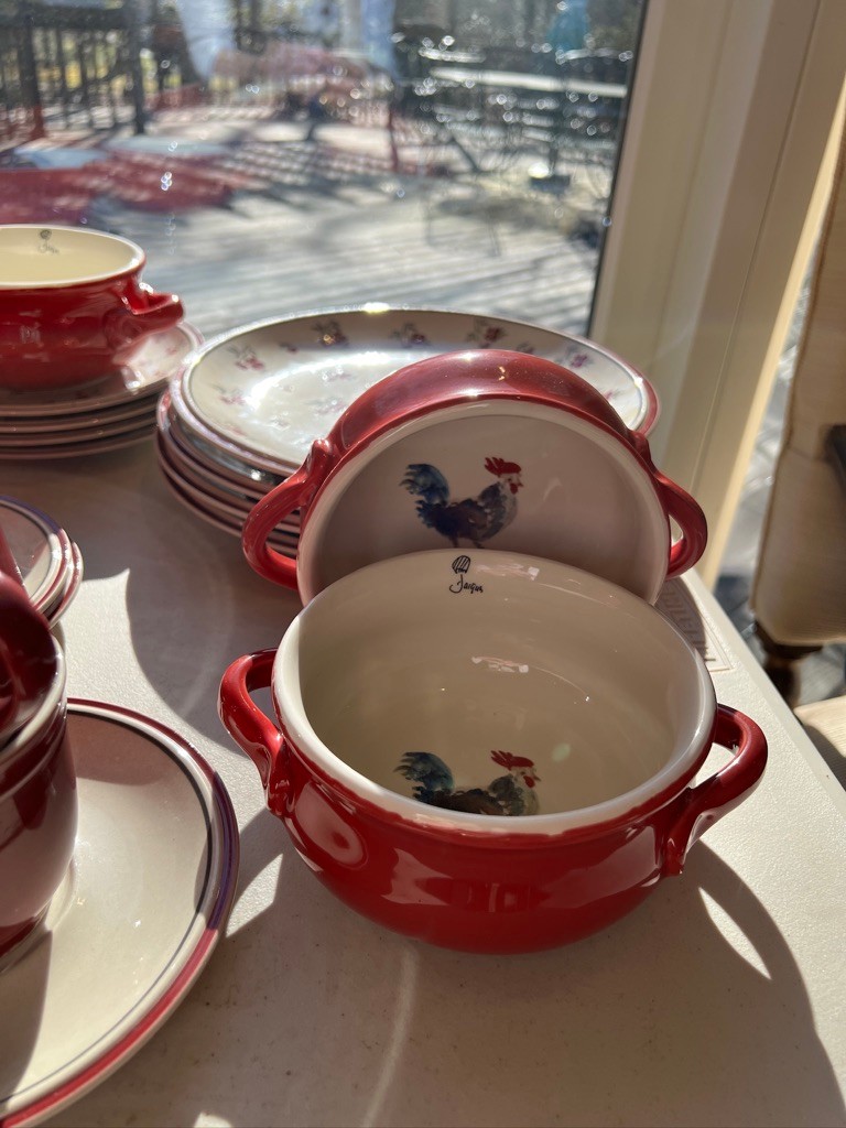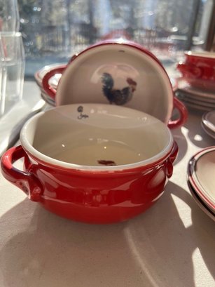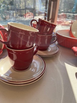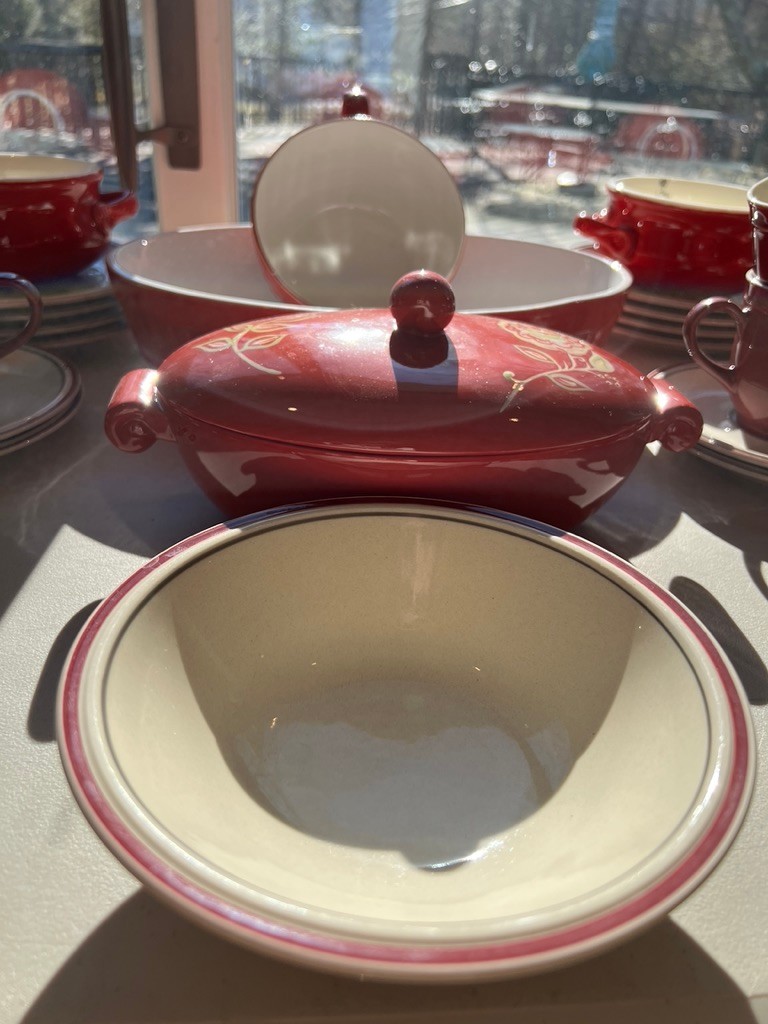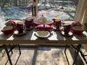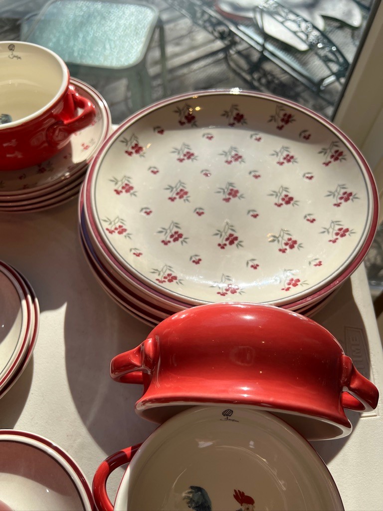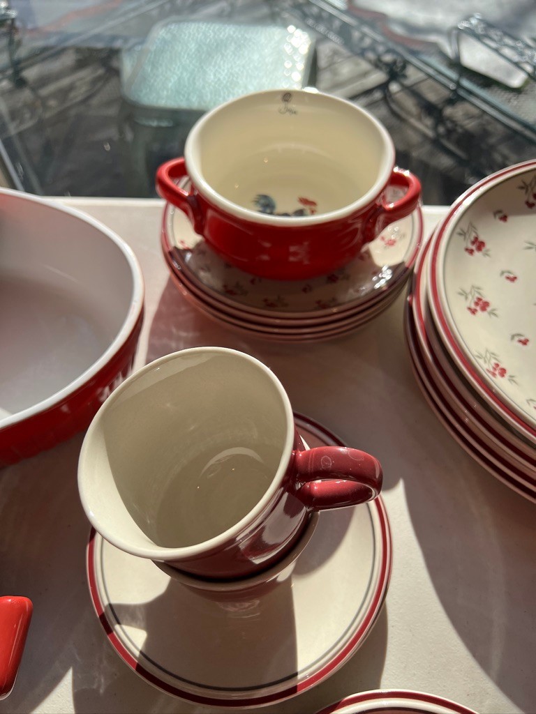 Red, Red, & Red, w/beige and country vibe, mixed and matched, fun ceramic dishware