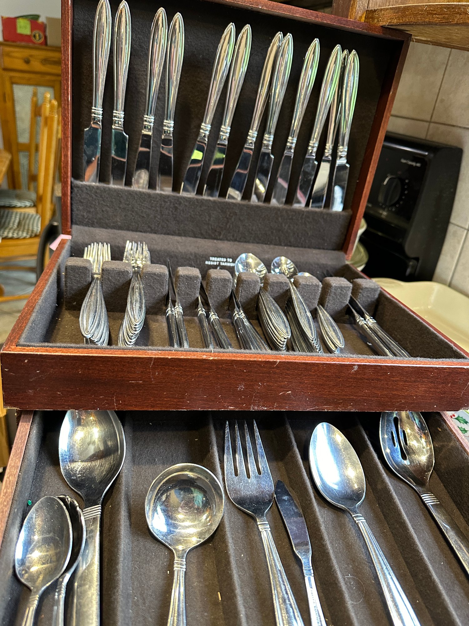 20 knives (steak and butter); 8 dinner forks, 12 salad forks; 9 soup spoons, 12 iced bev. spoons; 4 teaspoons, sugar spoons and 6 pc. serving pcs.