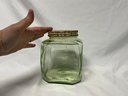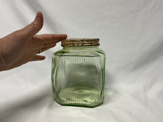 The Depression glass canister is in very good condition and has its lid. The lid is rusted, but that does not effect the beauty of the glass.