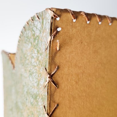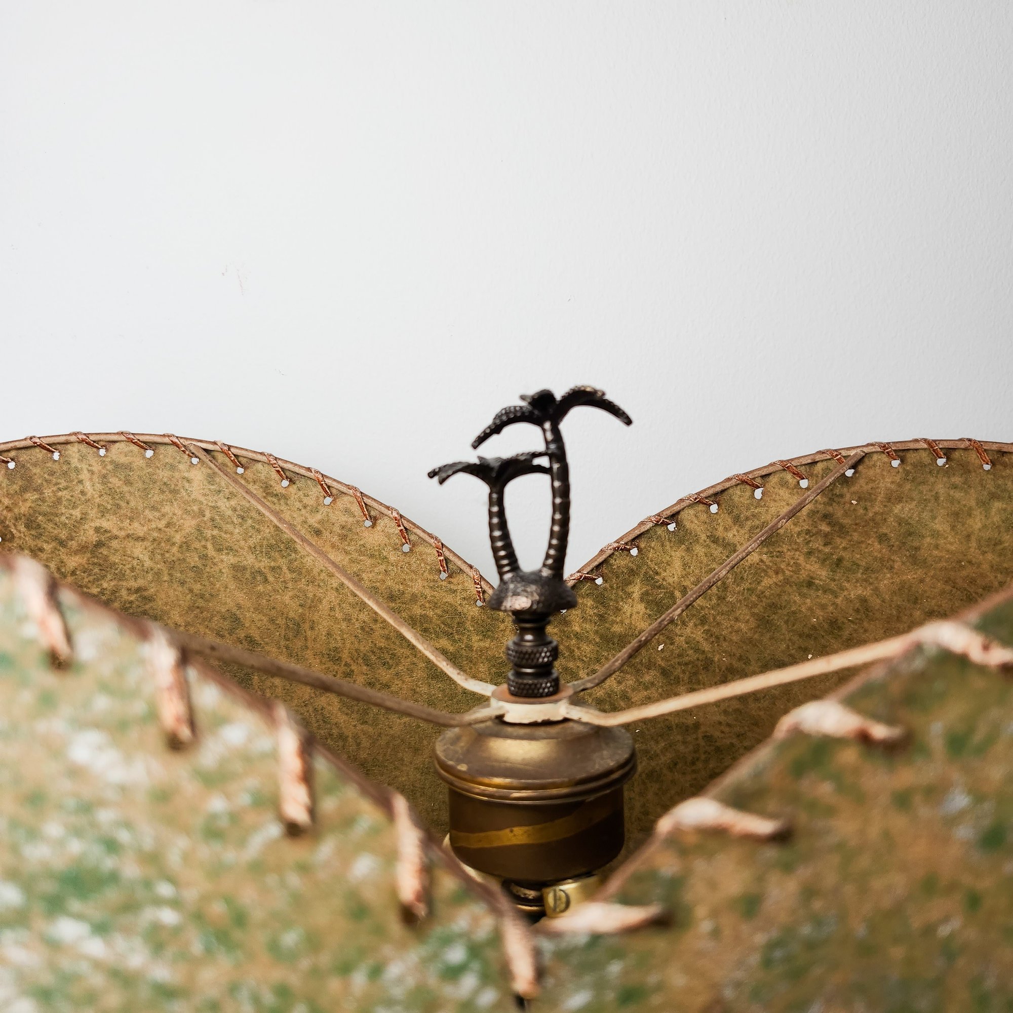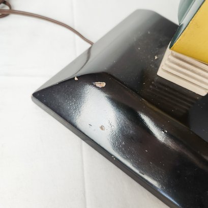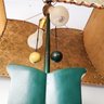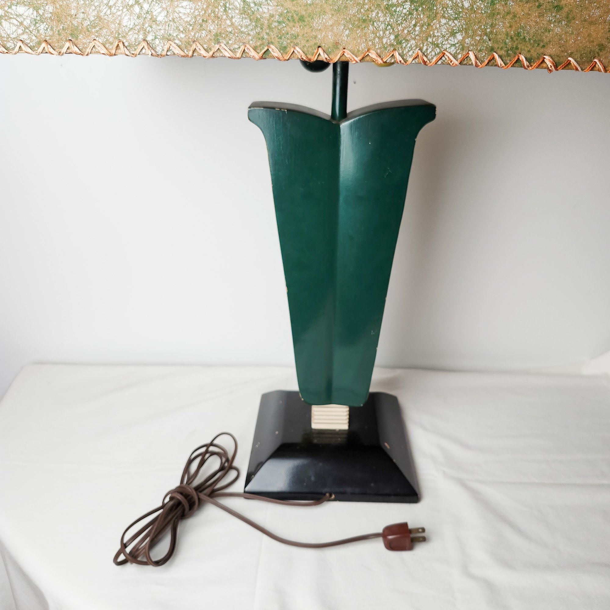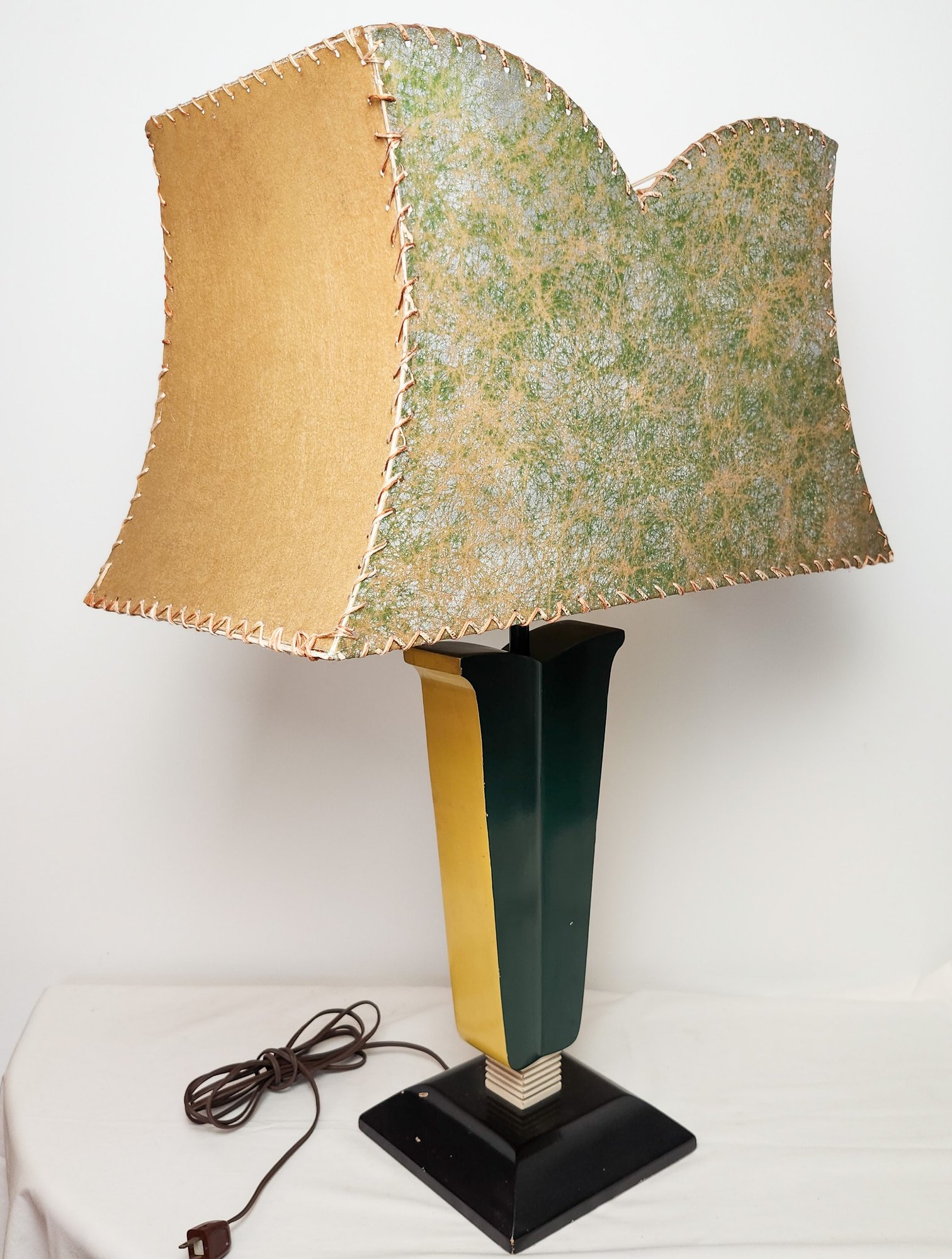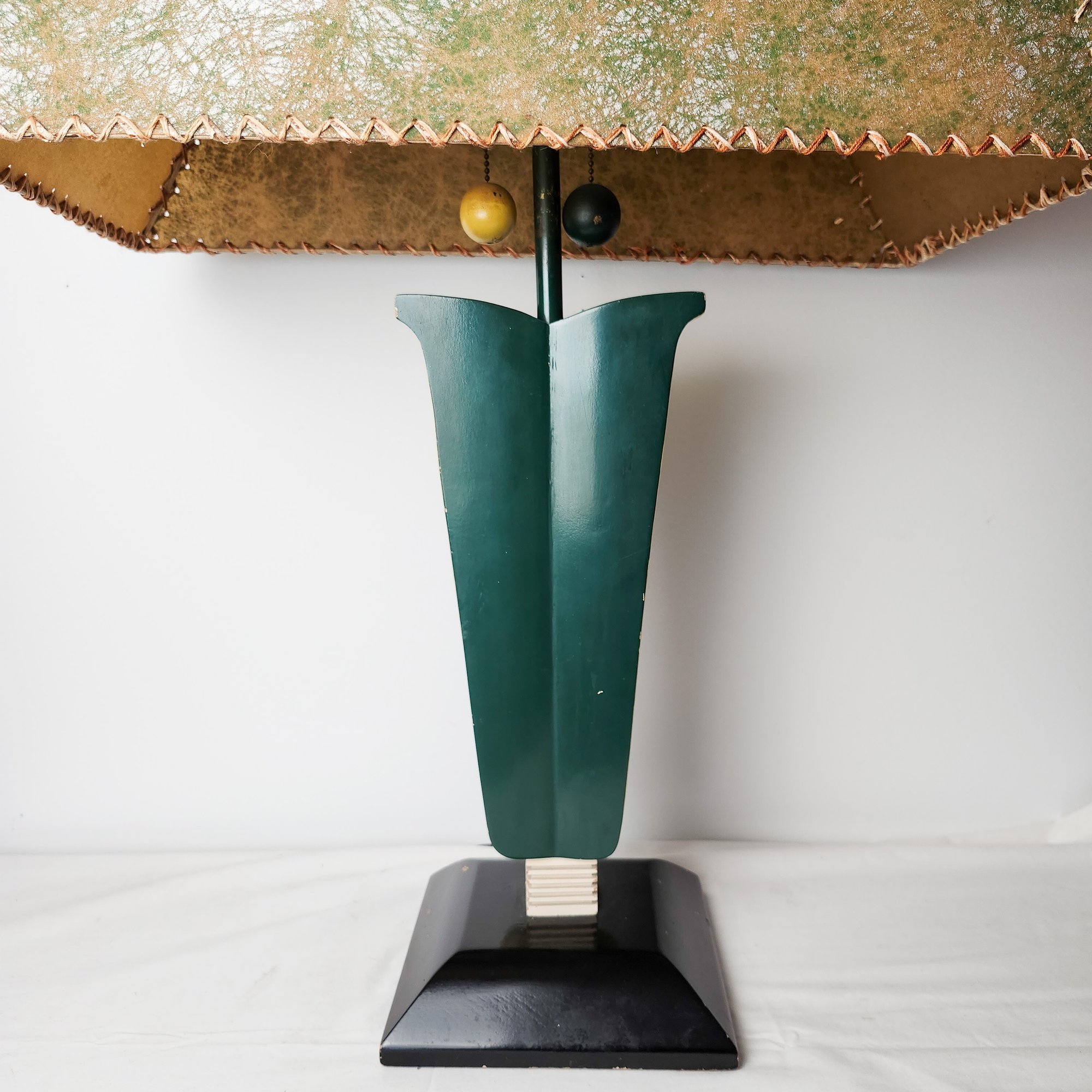 Amazing 50's Modern table lamp with over-the-top sculptural woven Fiberglass or parchment shade. Has two draw switches with different colored ball on the end of each, and a graphic color combination of yellow and green.