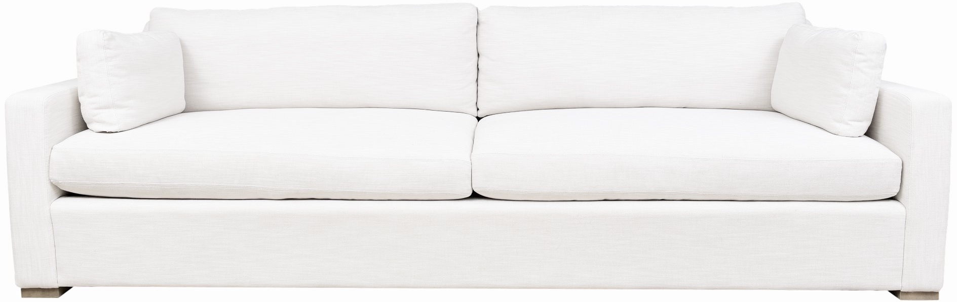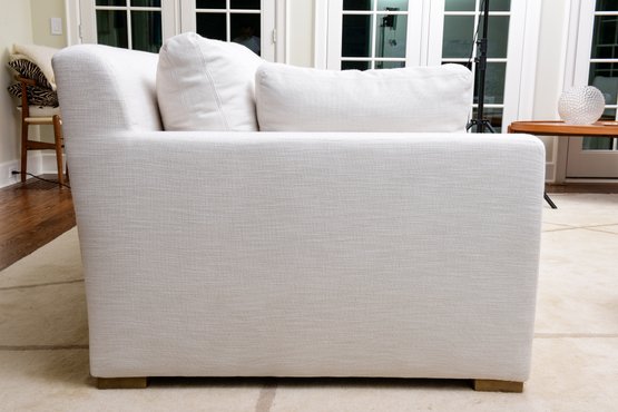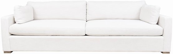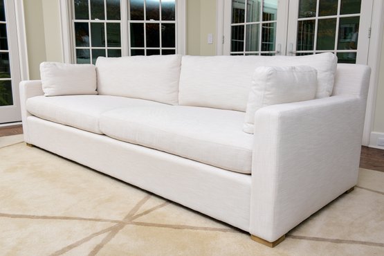 Belgian Track Arm sofa by Restoration Hardware with a European-inspired classic look upholstered in Perennials Performance Textured Linen Weave in Natural. Low to the ground, deep in profile, and sleekly streamlined for sophisticated appeal, it's a chic, ultra-comfortable twist on tradition.
