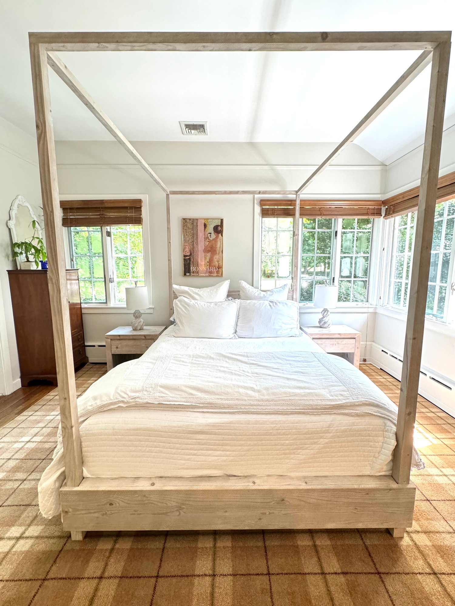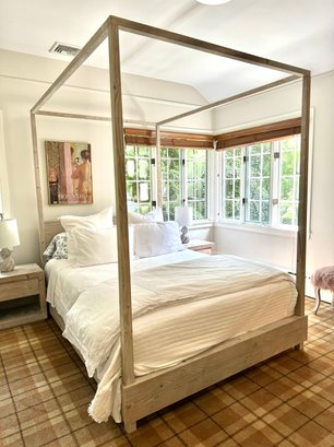 Modern and airy RH Teen canopy bed in hand finished white wash to achieve a time worn texture. It is a contemporary clean lined profile perfect for coastal style interiors. The bed was as purchased in 2021 used in guest room with very lite use and in very good condition. Includes a very nice