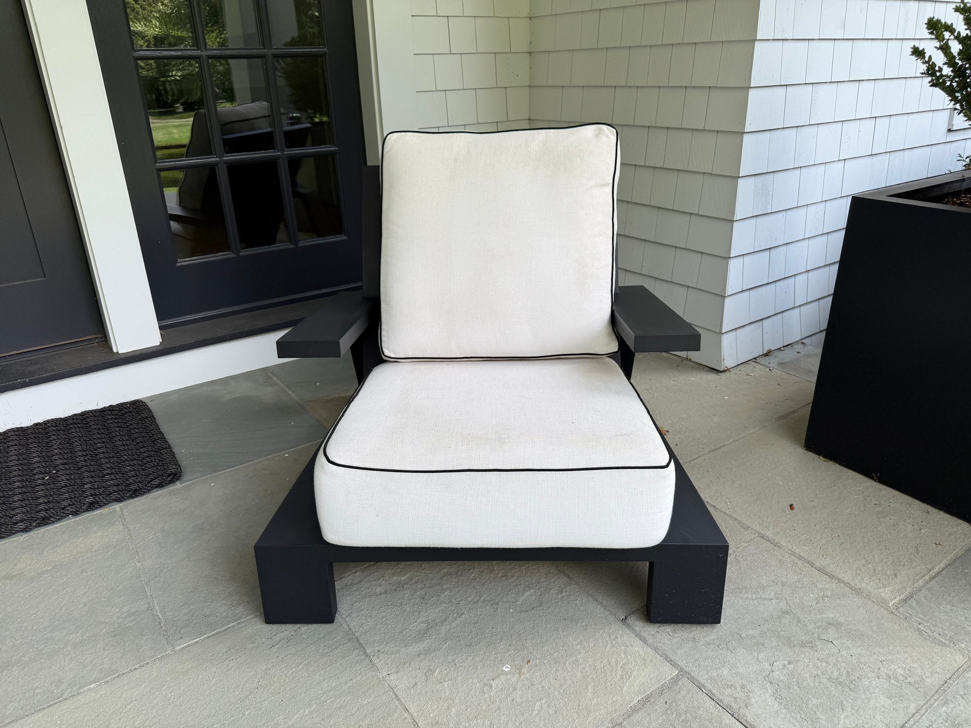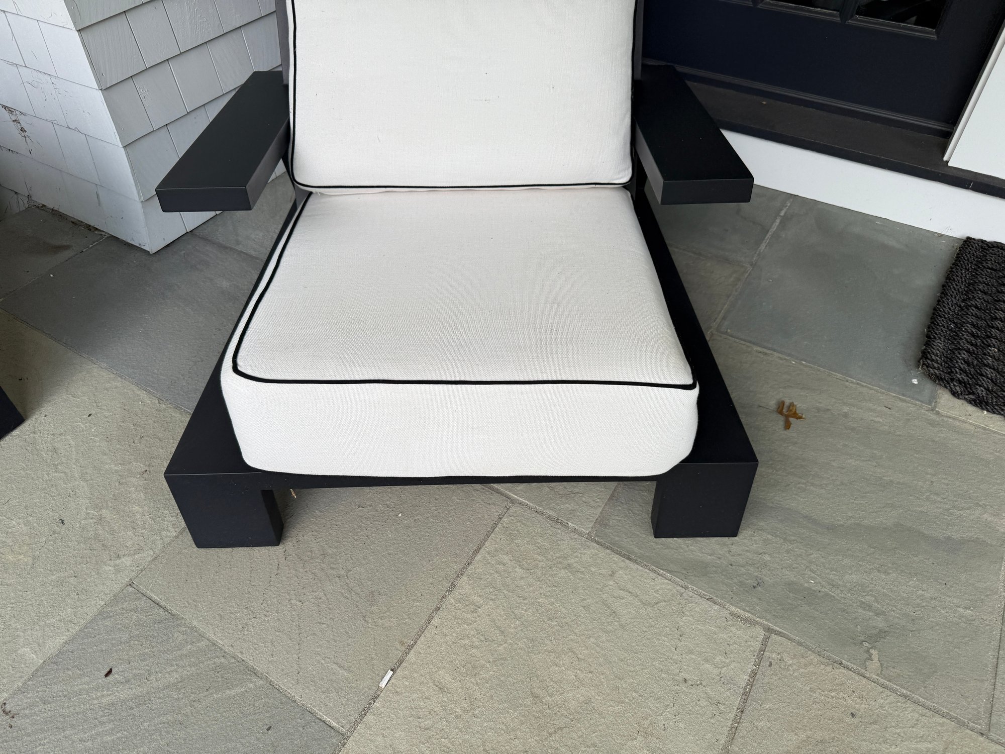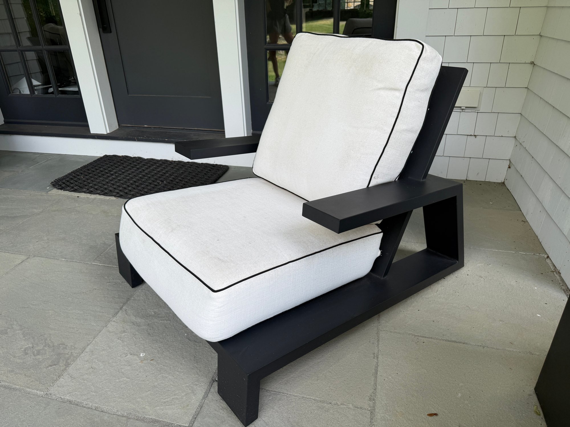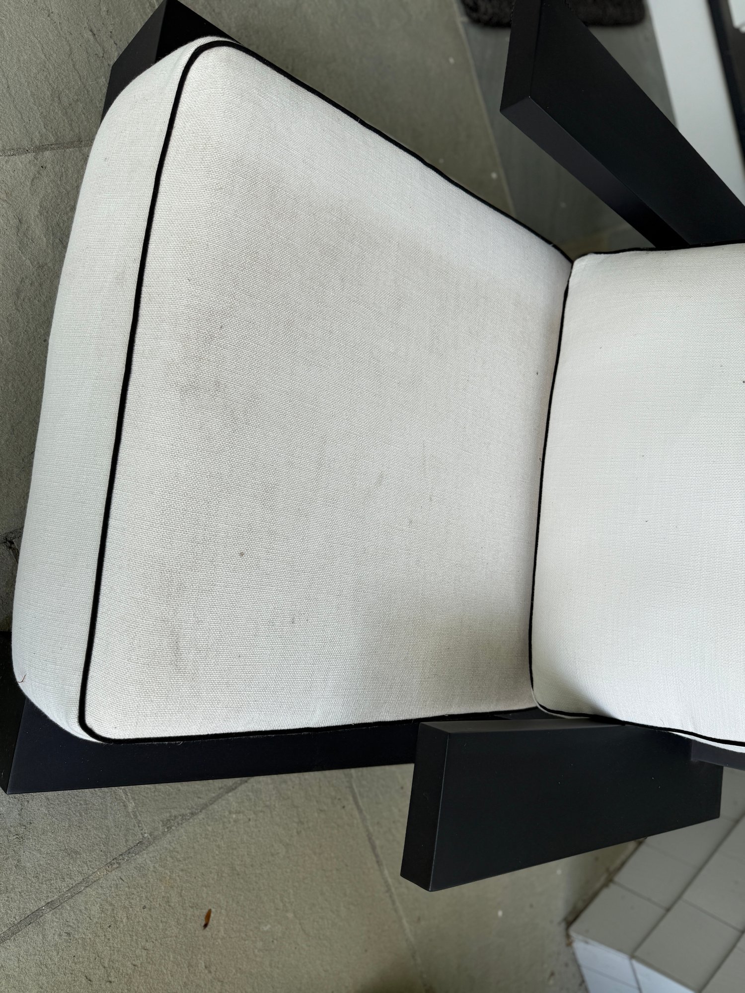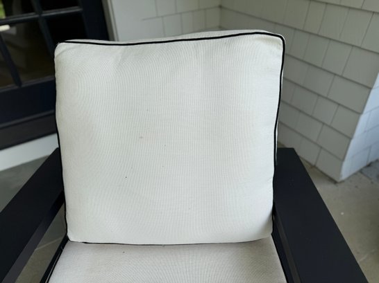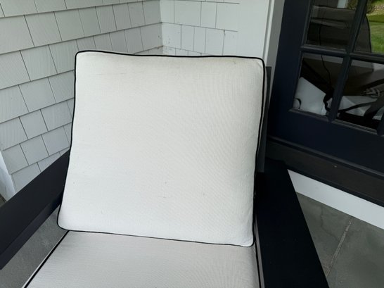 White outdoor fabric with black piping. Cushions could use a cleaning, but are in good outdoor condition.