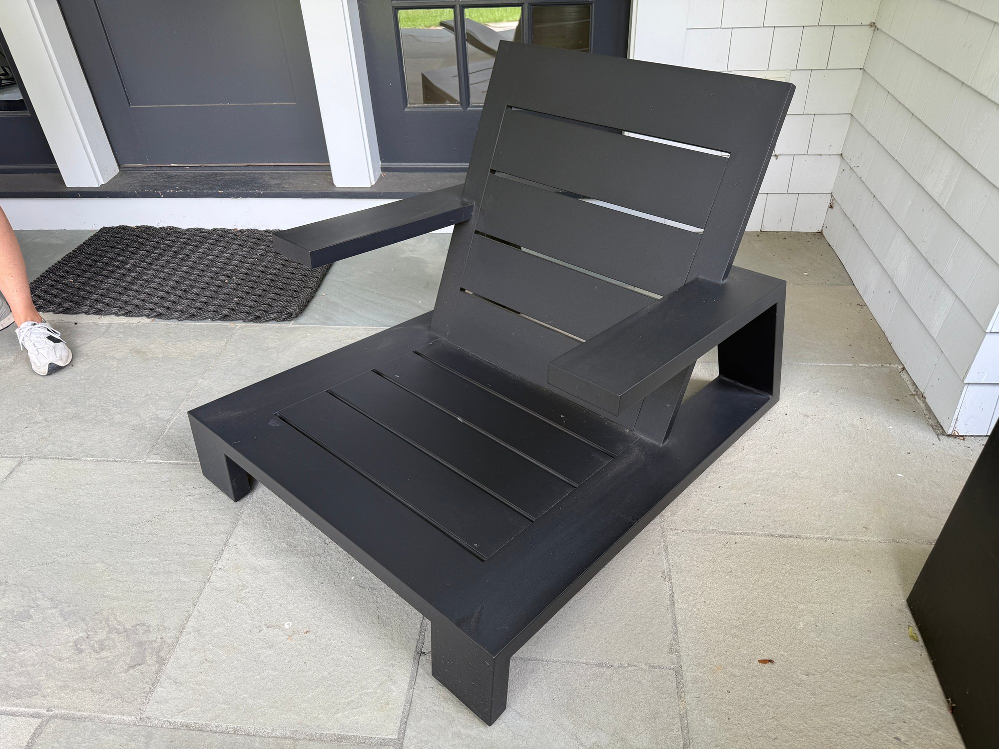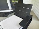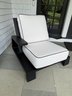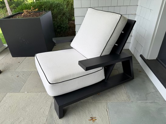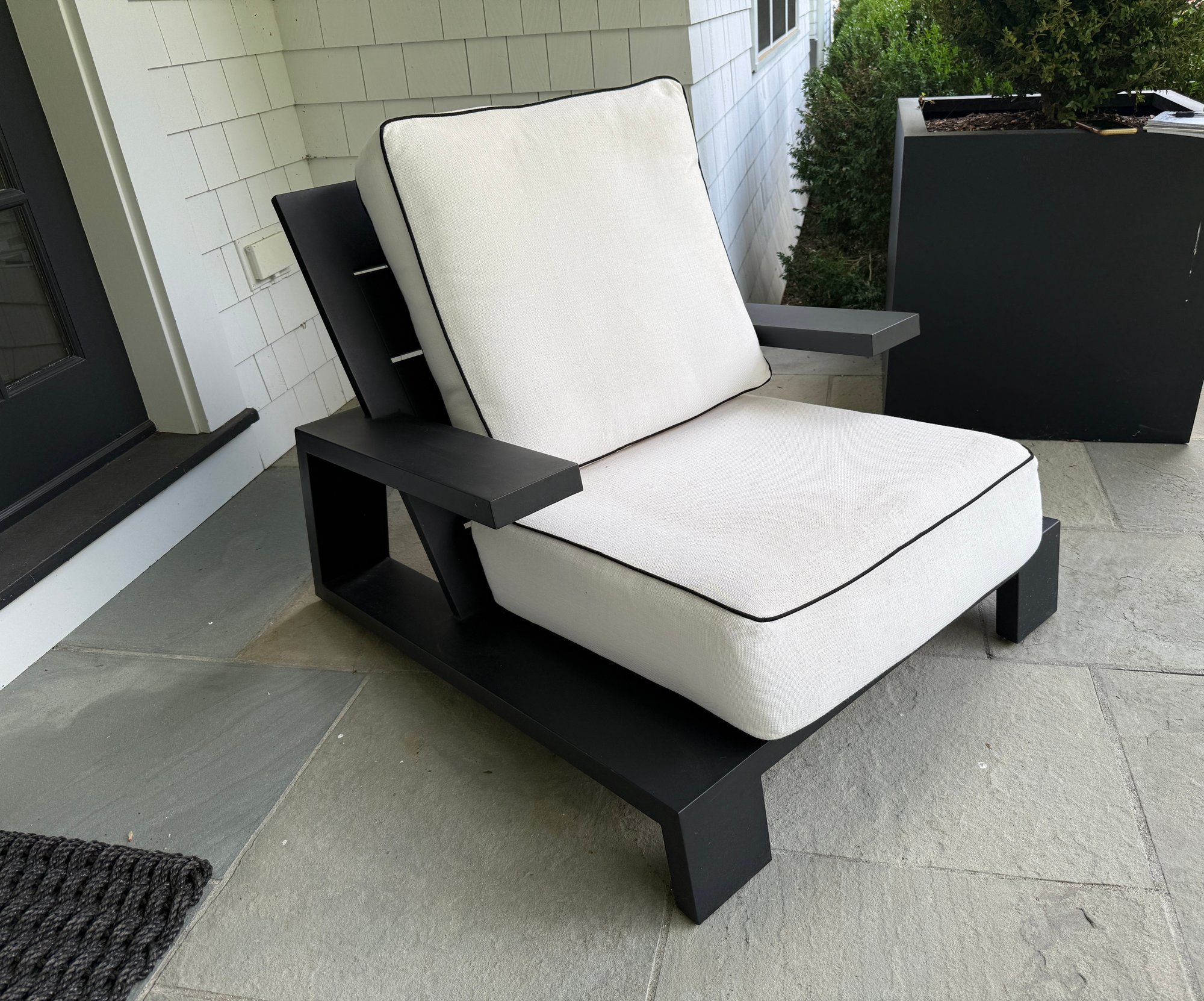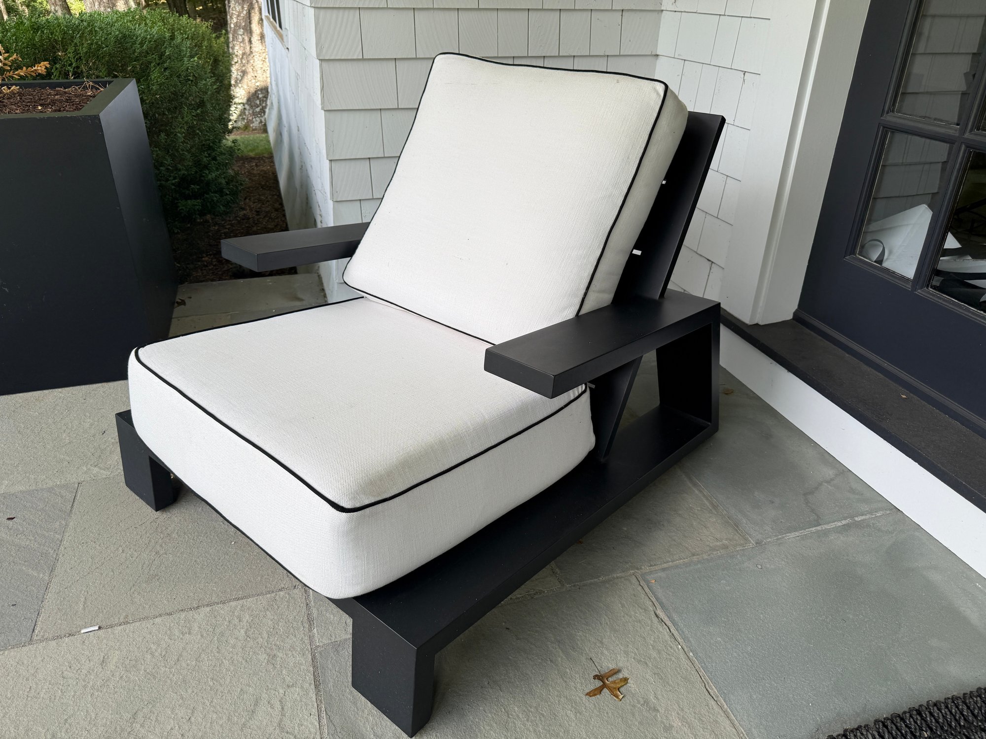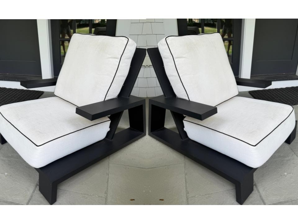 White outdoor fabric with black piping. Cushions could use a cleaning, but are in good outdoor condition.