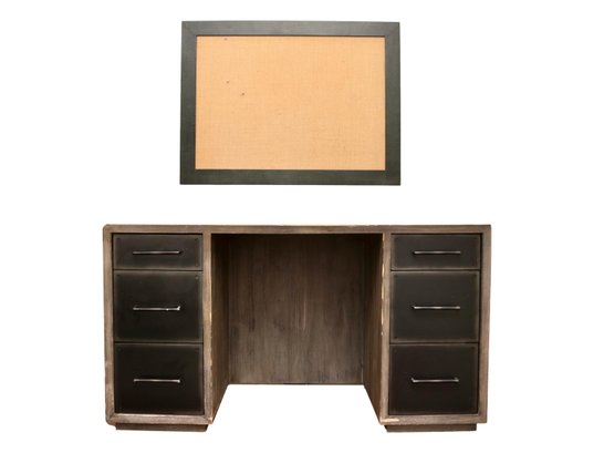Restoration Hardware (RH) Colbin Storage Desk – A seamless fusion of industrial and modern design. Inspired by utilitarian storage chests, this sturdy workstation boasts sleek steel drawers framed in a robust rectilinear wood structure, offering both form and function. The weathered grey driftwood finish complements the streamlined black metal drawer fronts with sleek handles, delivering a bold yet sophisticated aesthetic. A true workhorse with ample storage, making it a stylish yet practical addition to any office or creative space.