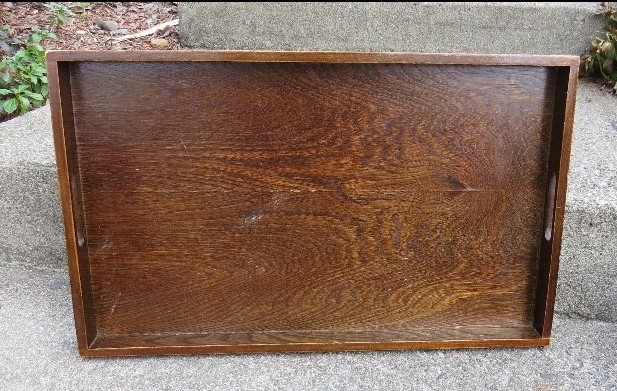 Wooden serving tray open handles either end nicely wood grained measuring XX by XX in size. Dovetailed construction, solid tray. Light wear a little scratch cover won't take care of. Just in time for summer drinks or transporting all that barbeque stuff out to the grill.