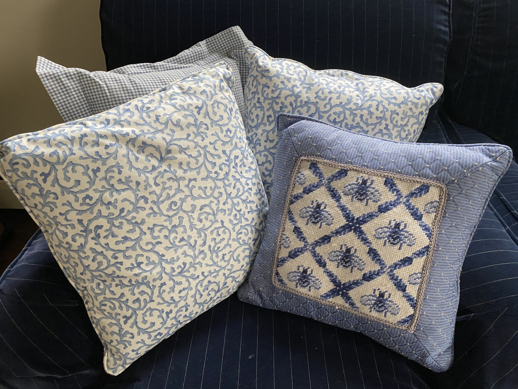 Two square with light blue coral pattern; one light blue gingham; one light blue with bumblebee needlepoint detail.