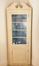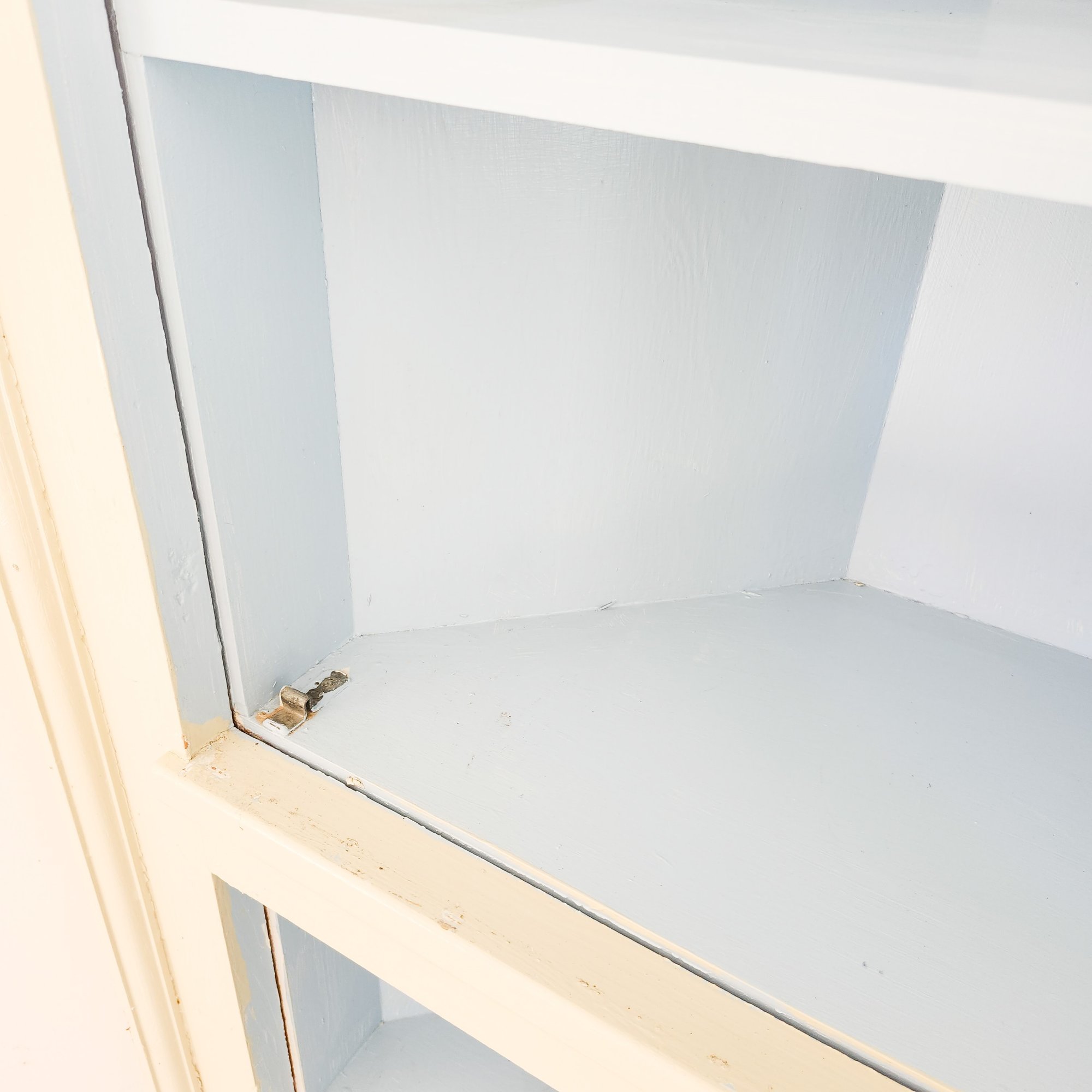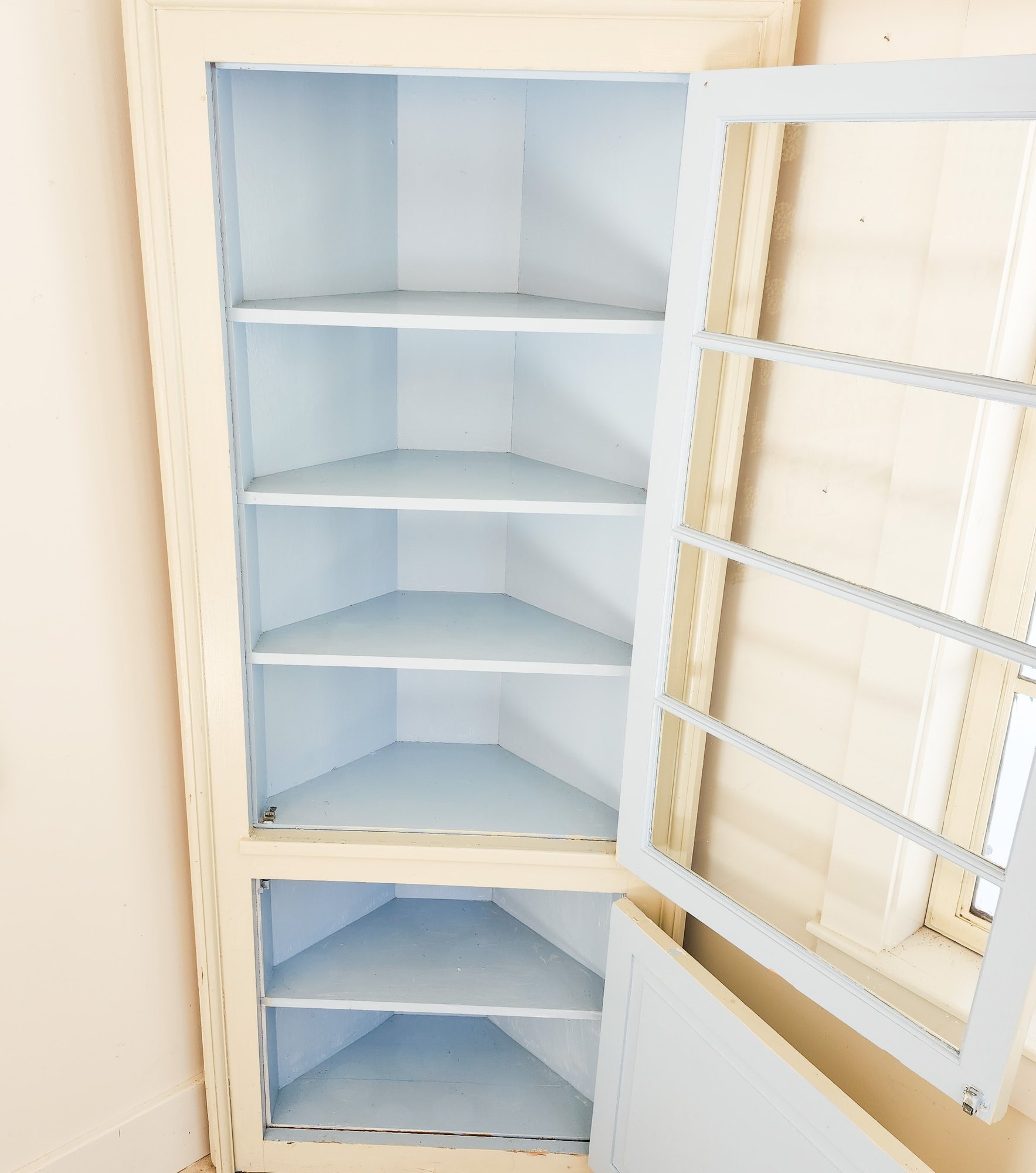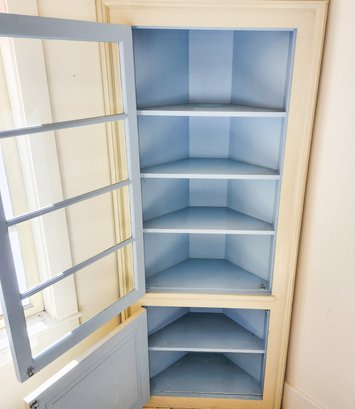Pretty painted corner cupboards with pale blue interior, glass upper door and smaller wood lower door.