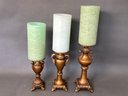 Candles are 8” and 4” diameter all a shade of green - batter operated. Need batteries.