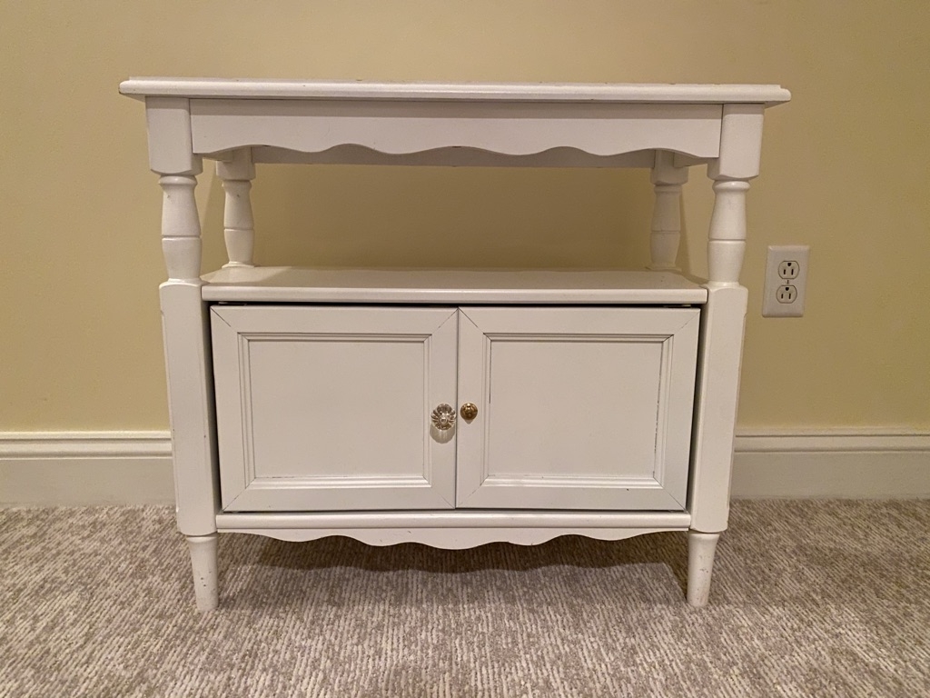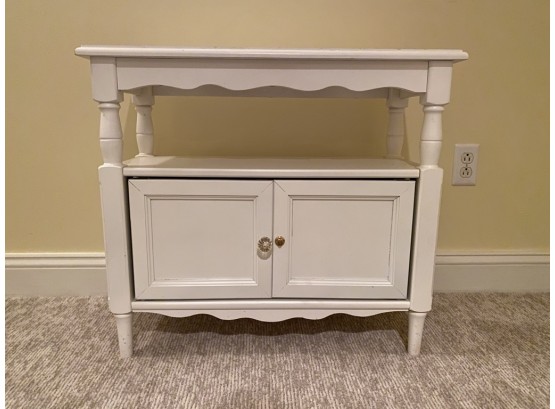 Shelved table with lower cabinet. Scalloped trim detail. Missing 1 knob, as shown in photos.